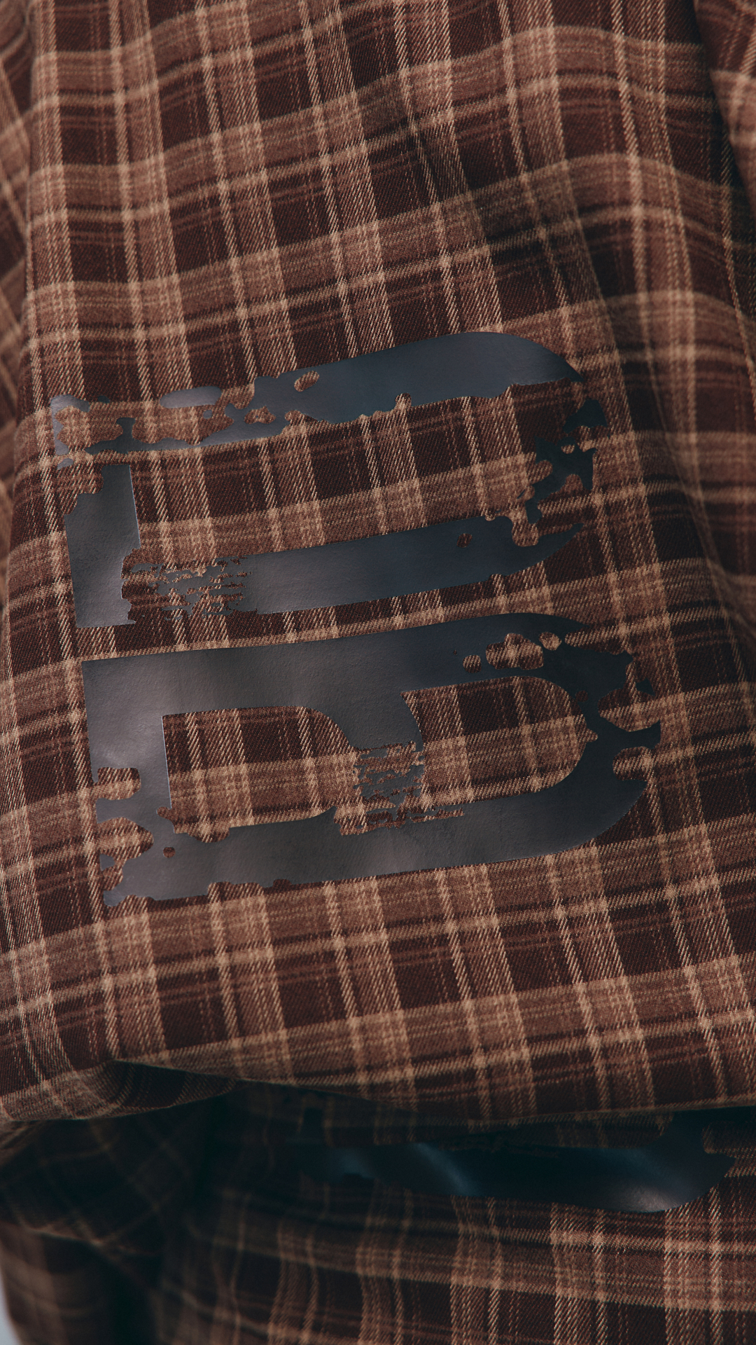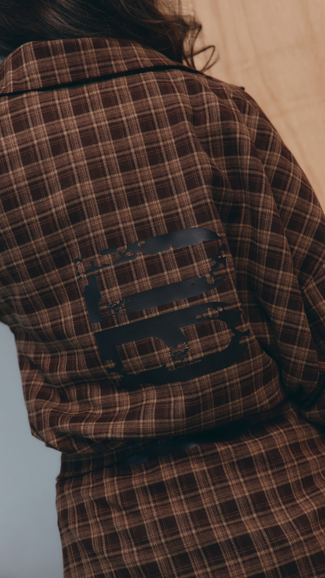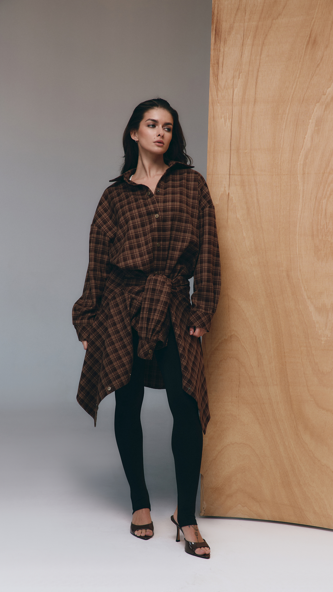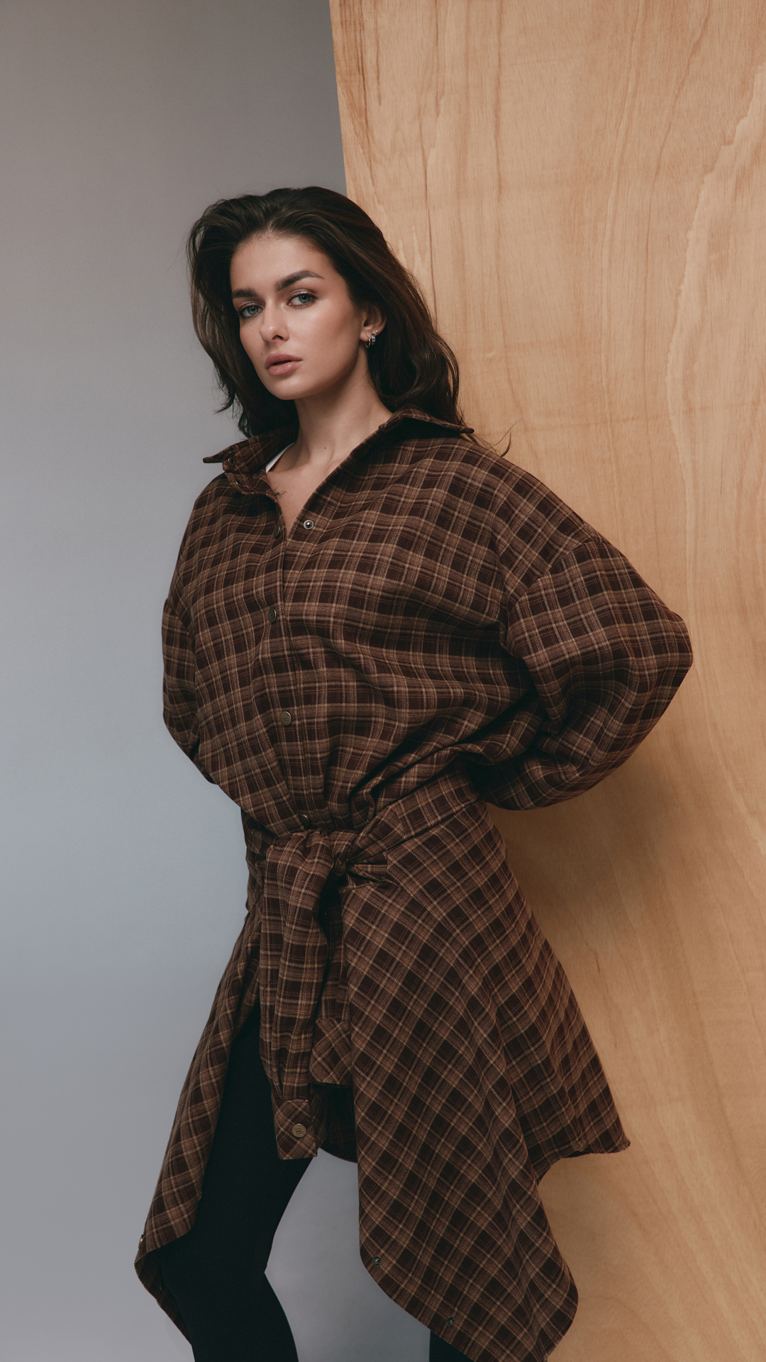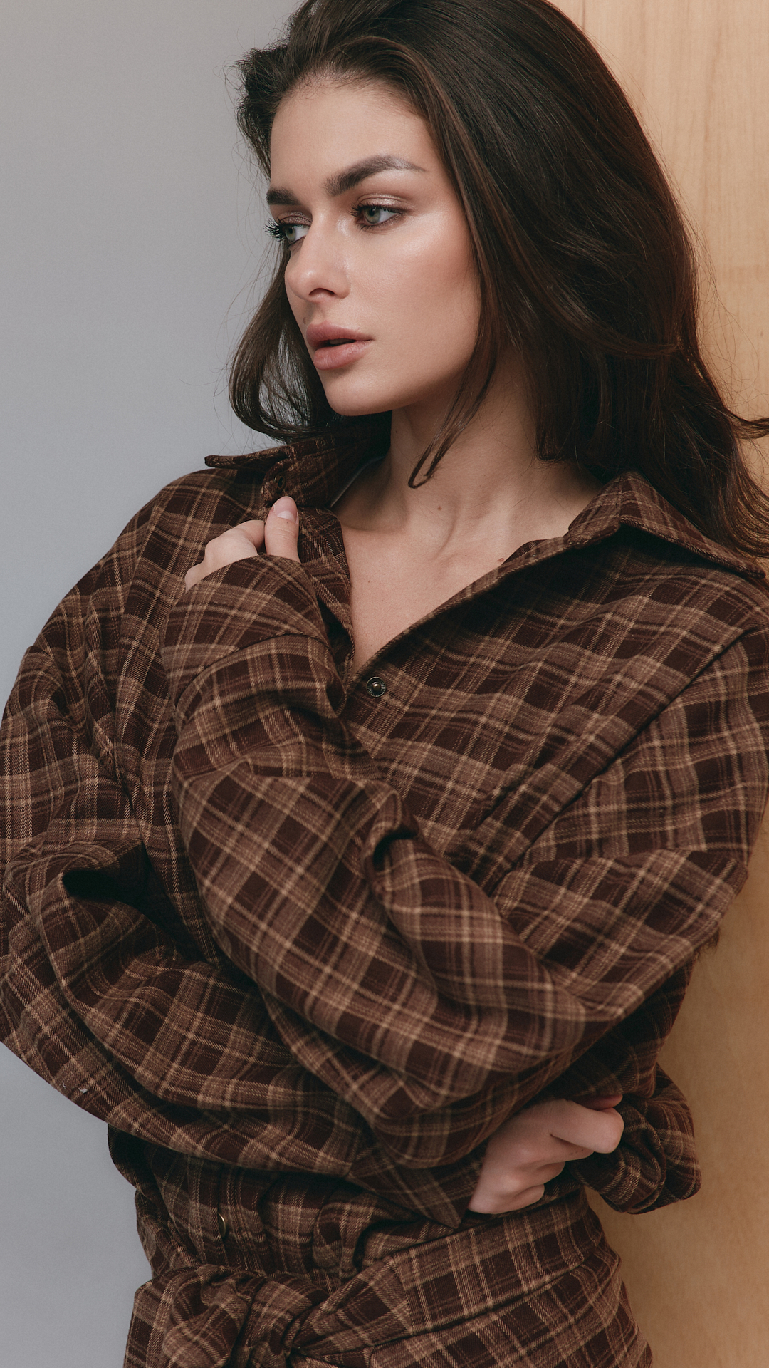 This stylish and versatile brown checkered shirt is the perfect addition to any wardrobe. Made in a fashionable oversized cut, it provides comfort and freedom of movement. The model fastens with branded buttons and has the brand logo on the back. It goes well with both jeans and leather pants, adding a touch of casualness and style to your look. Recommended for creating casual everyday outfits or stylish evening looks.