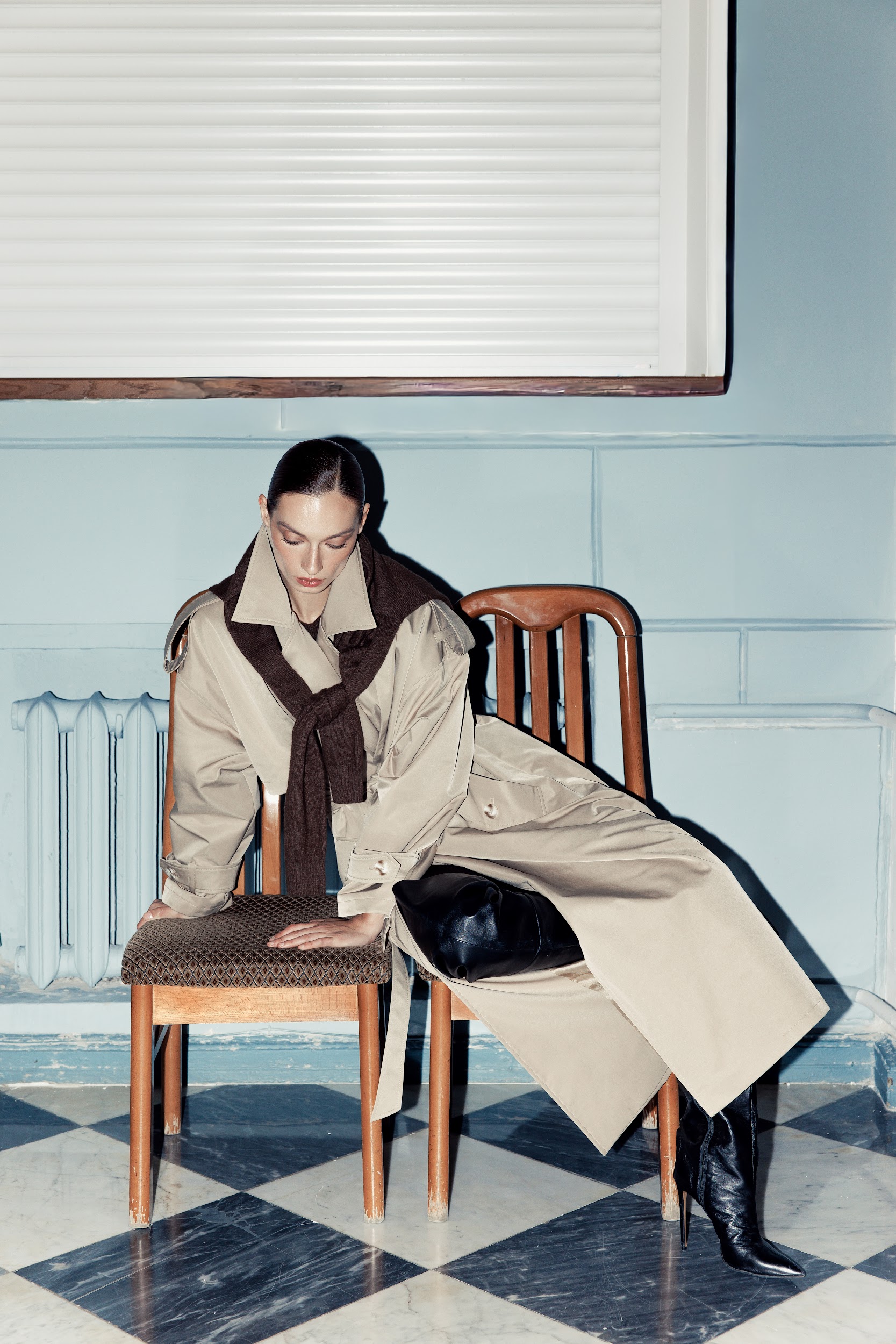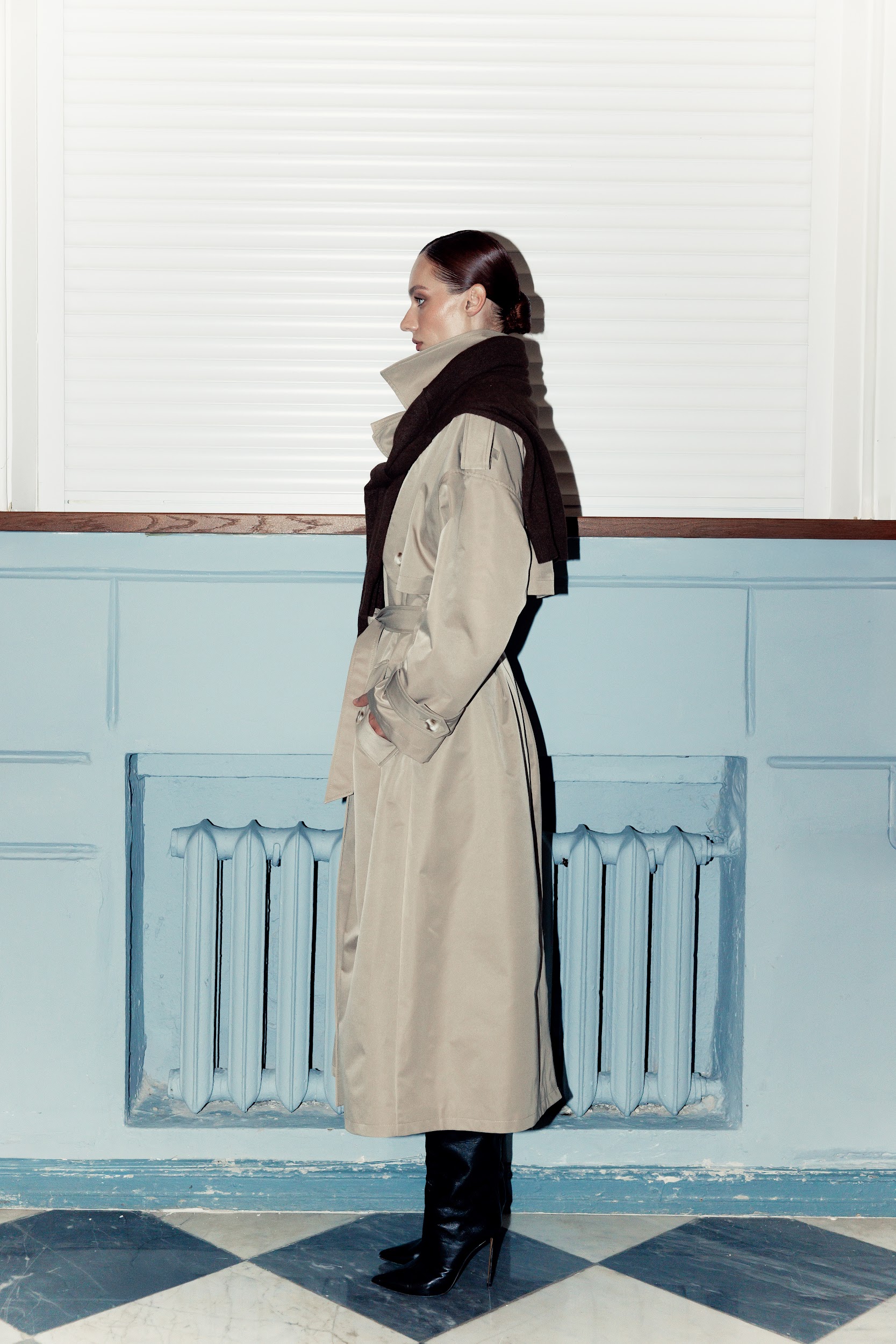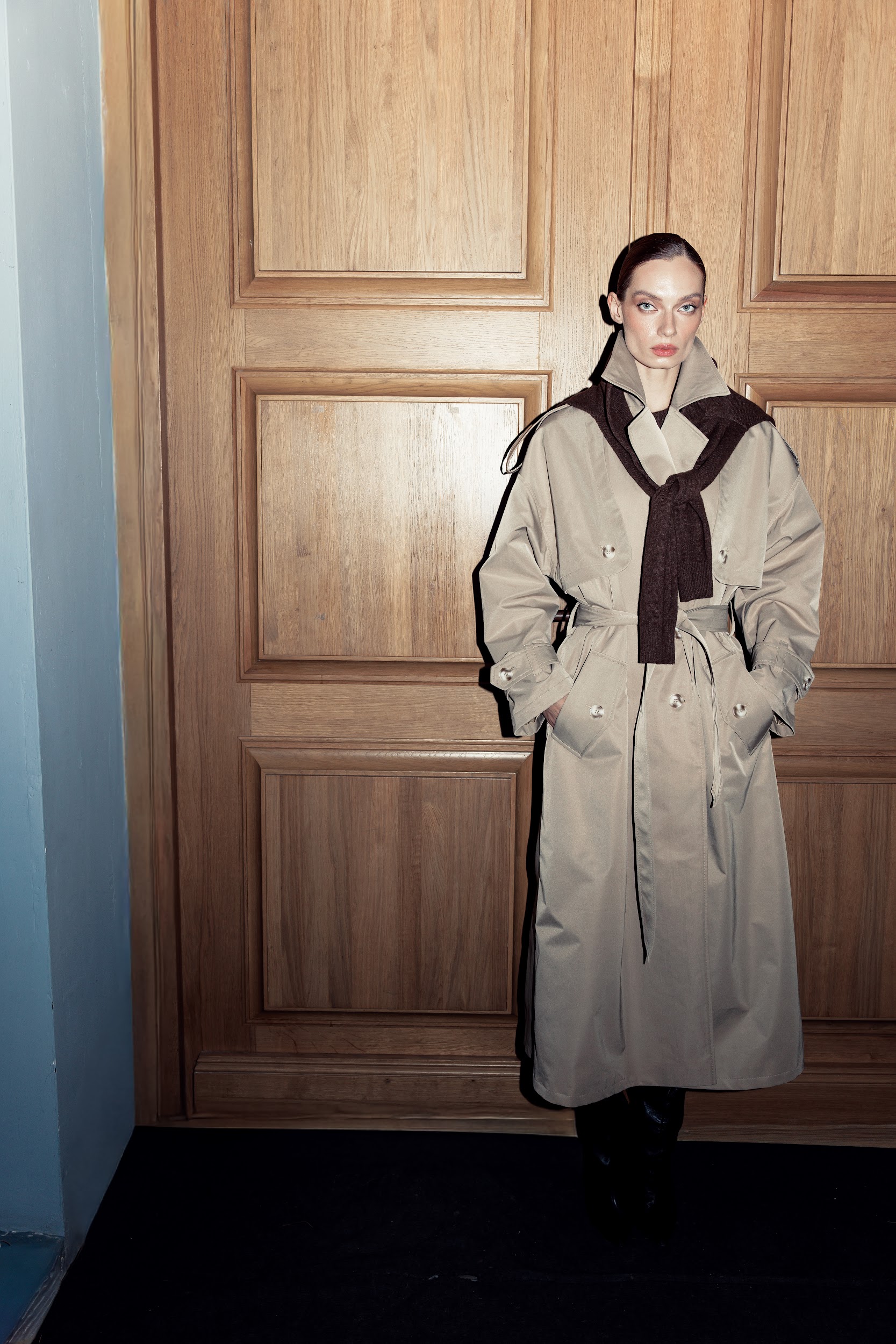 This trench coat in a noble beige shade is a symbol of elegance and refined style. It has an elongated silhouette, which gives the image restraint and at the same time emphasizes femininity. A double row of buttons adds expressiveness and creates a classic accent. The waist belt allows you to adjust the fit and creates a graceful silhouette. Epaulettes on the shoulders and cuffs with buckles on the sleeves emphasize the traditional aesthetics of the trench coat. The flap on the chest and back not only preserves the authenticity of the cut but also adds ease of movement. The garment has deep pockets with flaps that combine practicality and style. This trench coat is the perfect addition to your basic wardrobe, suitable for both business and casual looks. Its exquisite simplicity and attention to detail make it a must-have for the season.