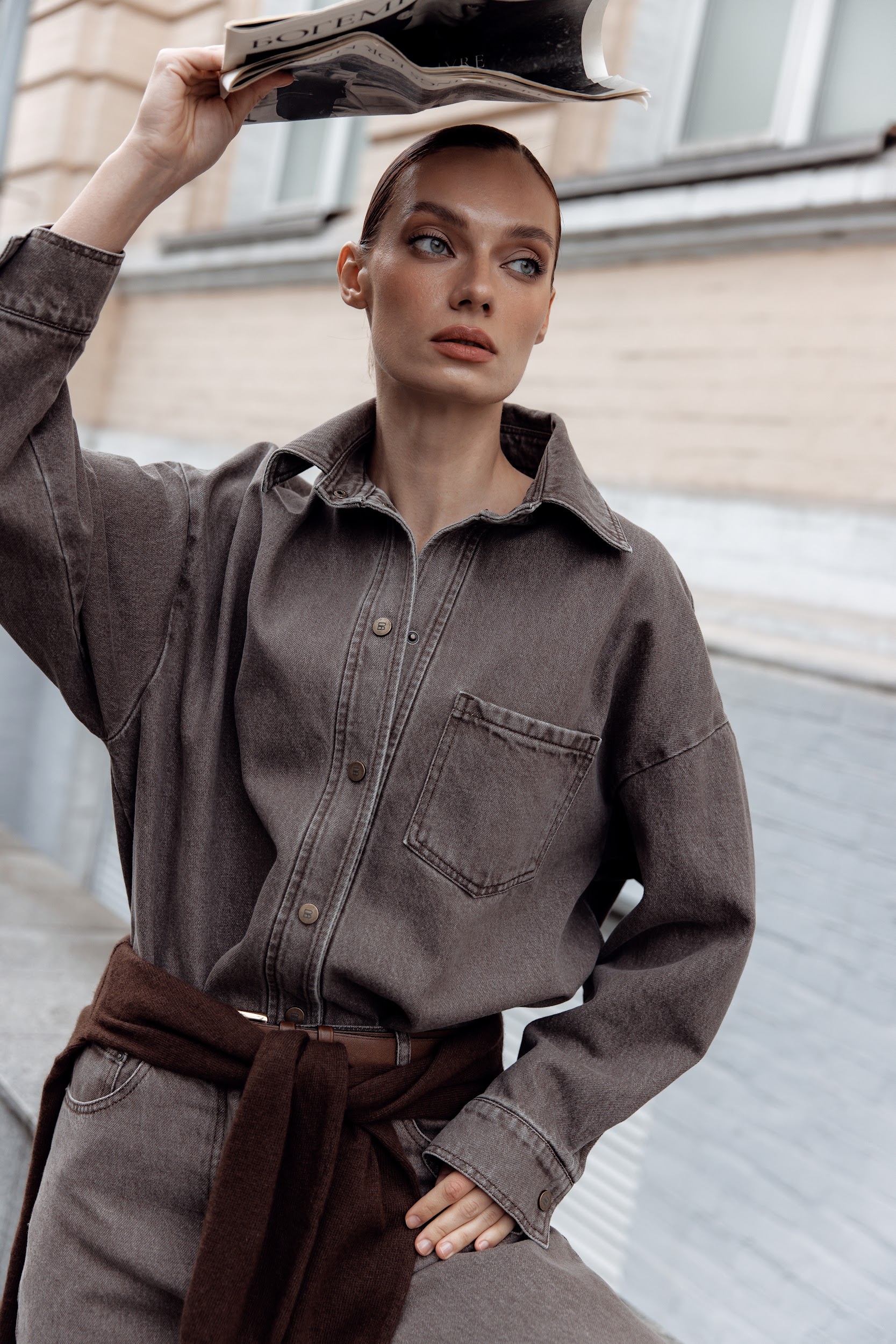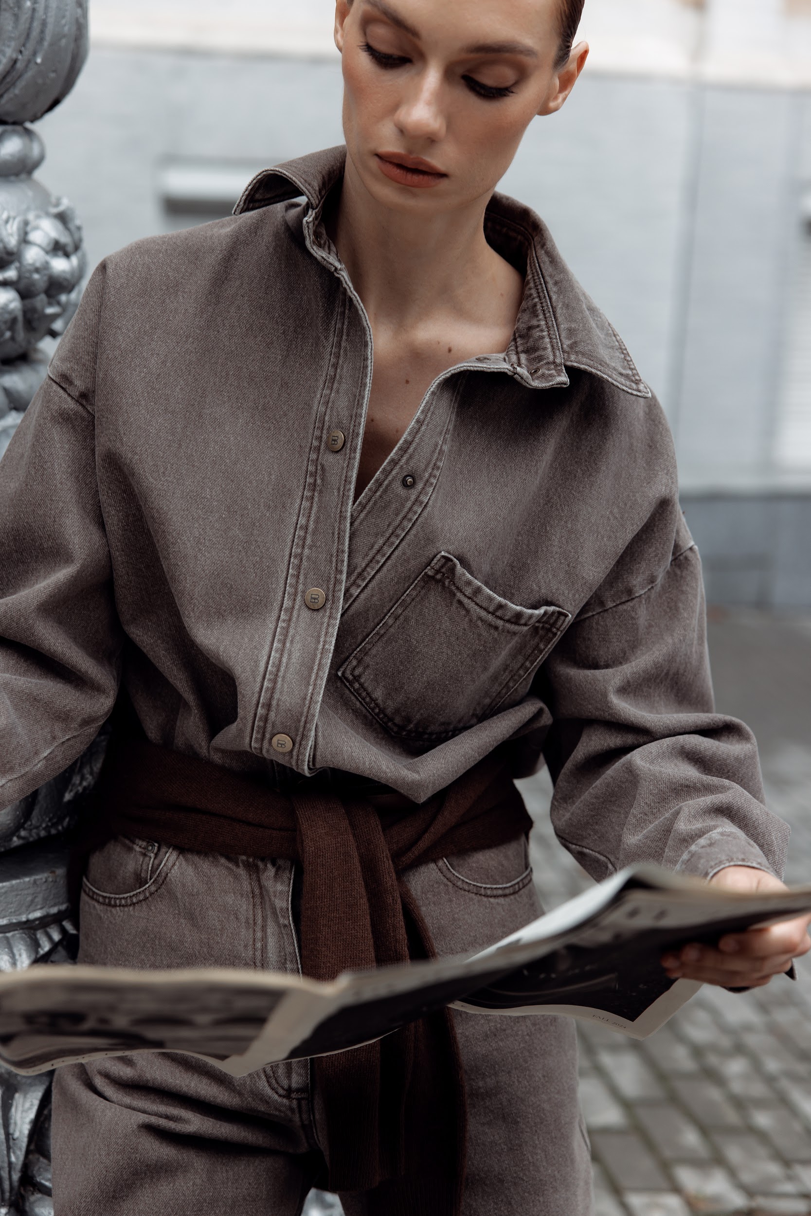 Ця стильна джинсова сорочка вільного крою — ідеальний вибір для тих, хто цінує комфорт, мінімалізм та продуманий дизайн. Виготовлена з якісного деніму сіро-коричневого відтінку, вона легко поєднується як з повсякденними, так і з більш вишуканими образами.