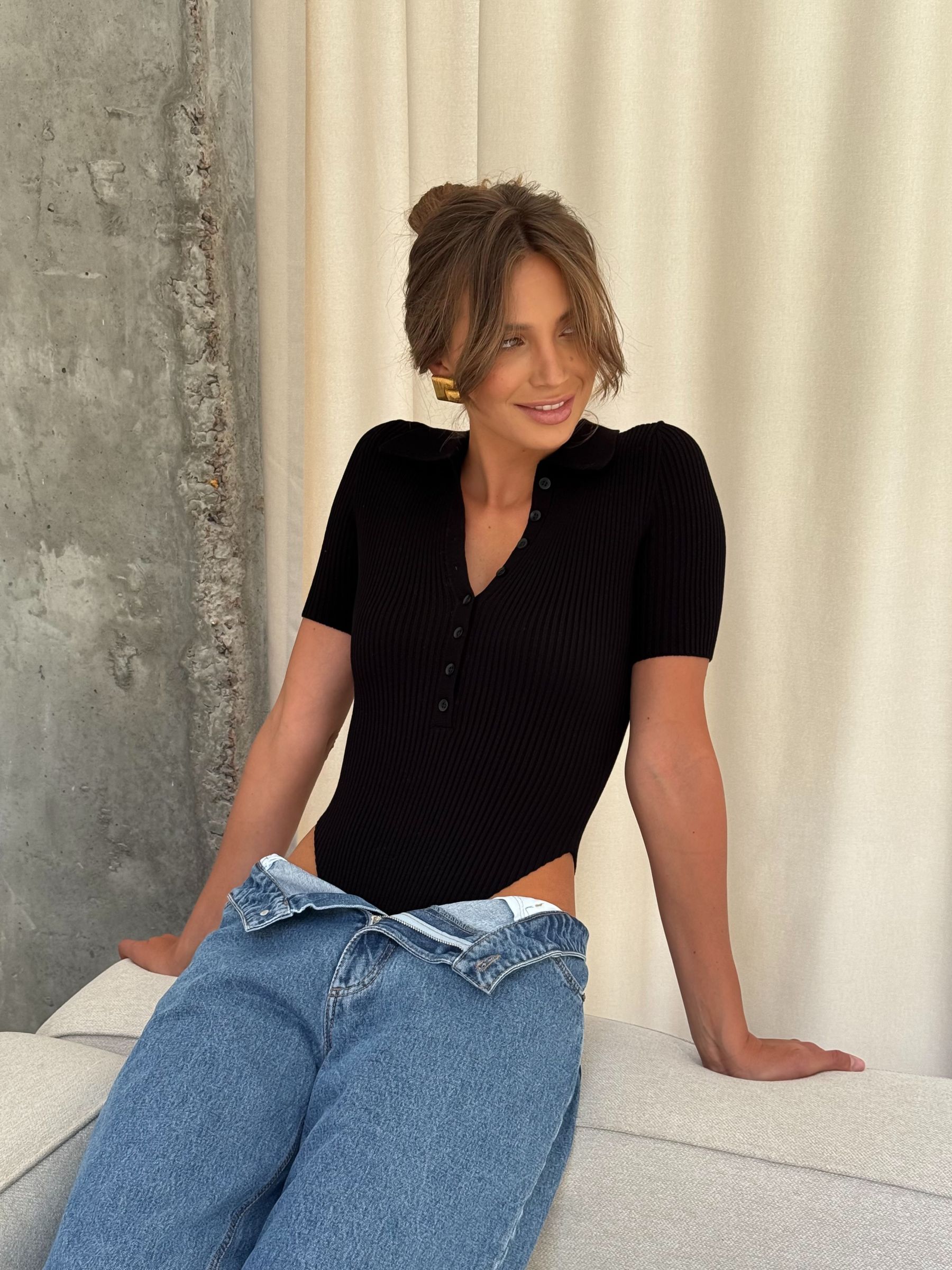 Елегантний чорний боді з м’якого трикотажу - універсальна база для стильних образів на кожен день. Модель має класичний відкладний комір і планку на ґудзиках, що додає вишуканості. Короткий рукав і приталений силует підкреслюють фігуру, створюючи акуратний та жіночний образ. Завдяки боді-формату виріб ідеально лягає по тілу, не вибивається з-під одягу та чудово поєднується з джинсами, брюками або спідницями з високою посадкою.