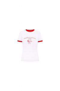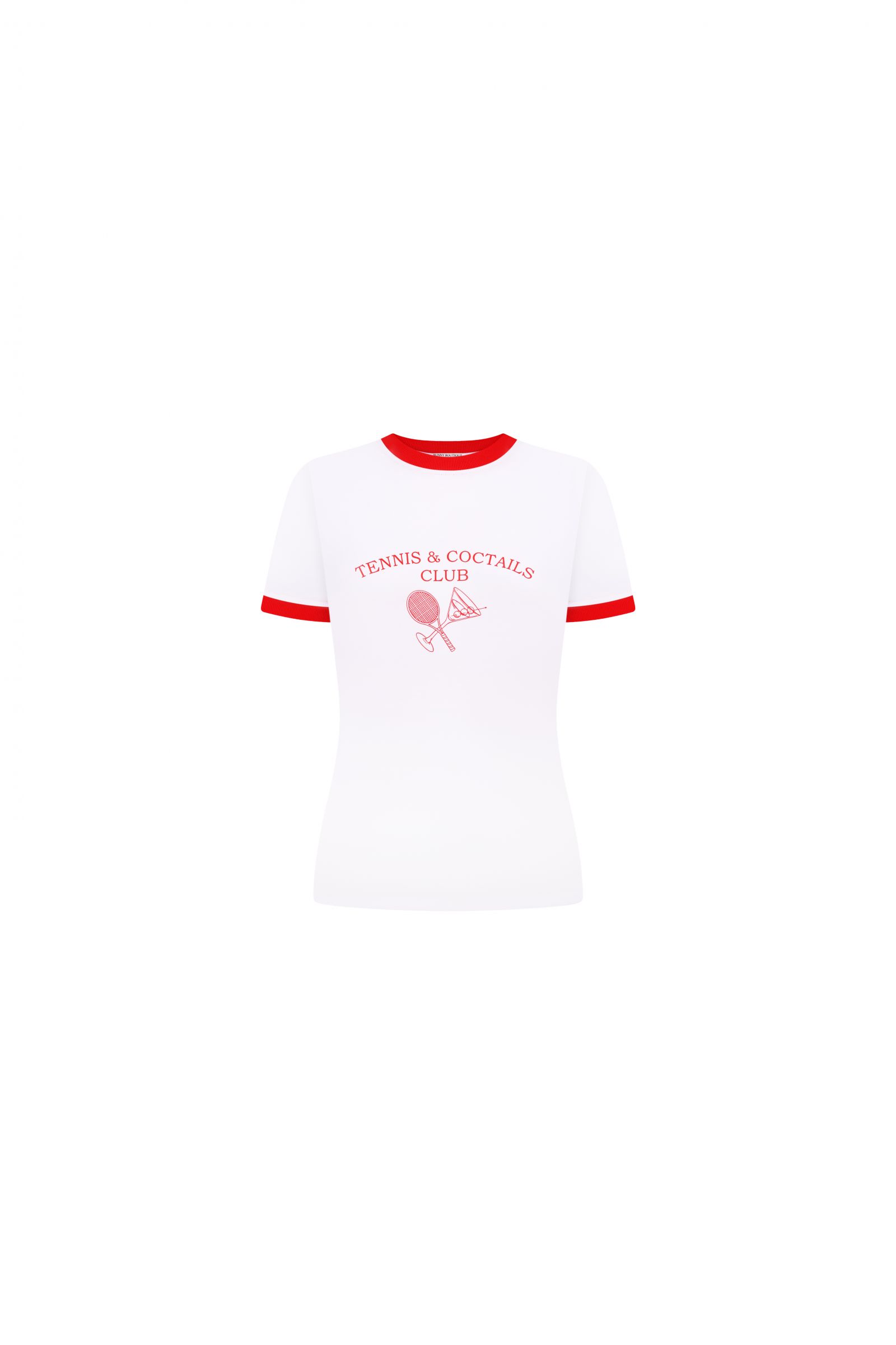 Стильна біла футболка з контрастними червоними деталями - ідеальний варіант для створення легких та трендових образів. Модель доповнена червоною обробкою на горловині та рукавах, що додає акценту та робить базову річ більш виразною. Спереду розміщений напис Tennis & Cocktails Club із графічними елементами, який створює настрій відпочинку, літа та невимушеного стилю. Футболка чудово поєднується з джинсами, шортами або спідницями, підходить як для повсякденних виходів, так і для подорожей. М’який матеріал забезпечує комфорт протягом усього дня, а універсальний крій гарно сідає по фігурі.