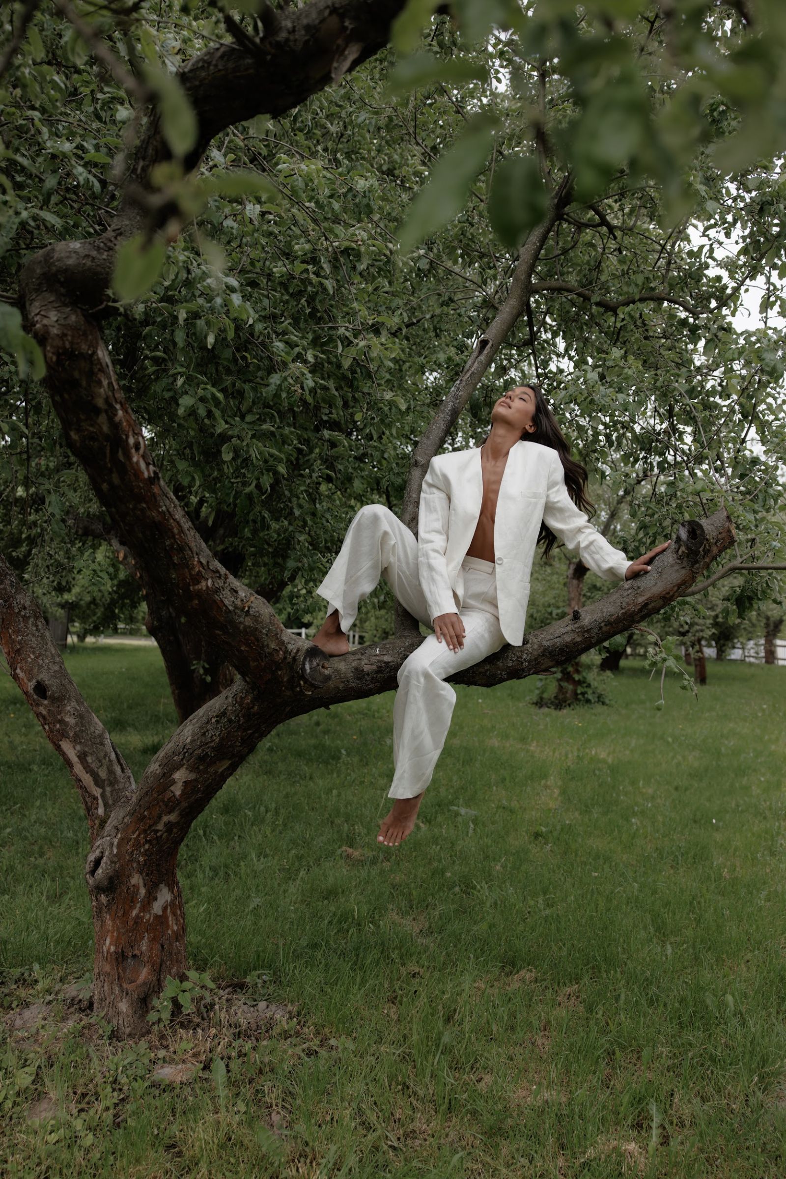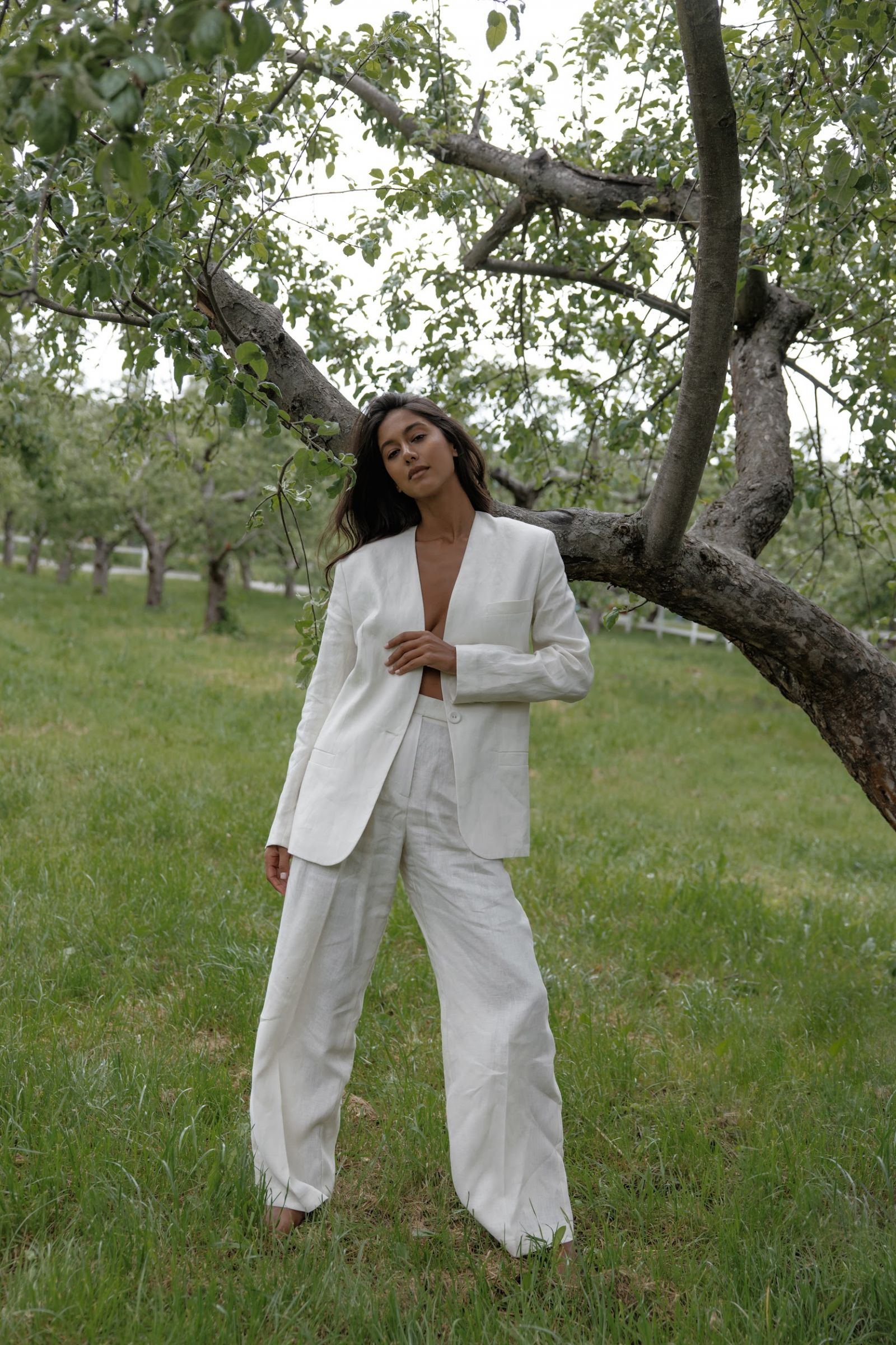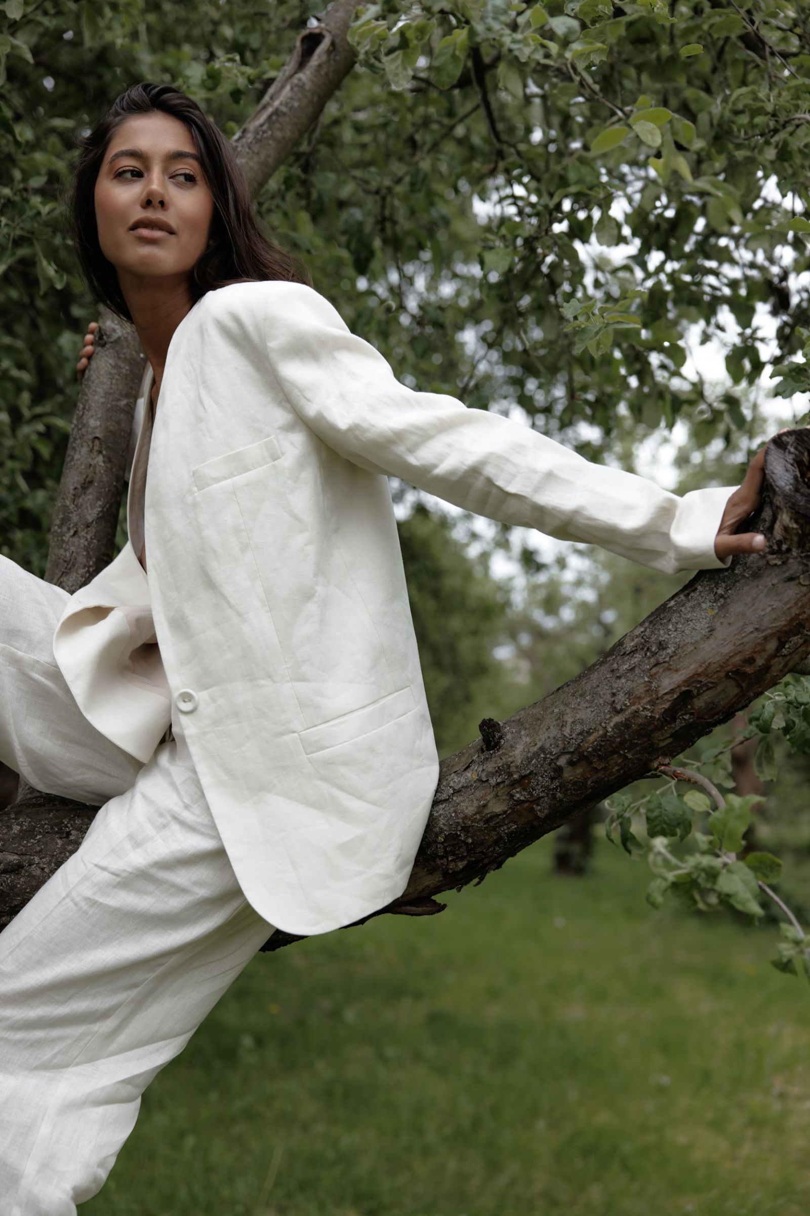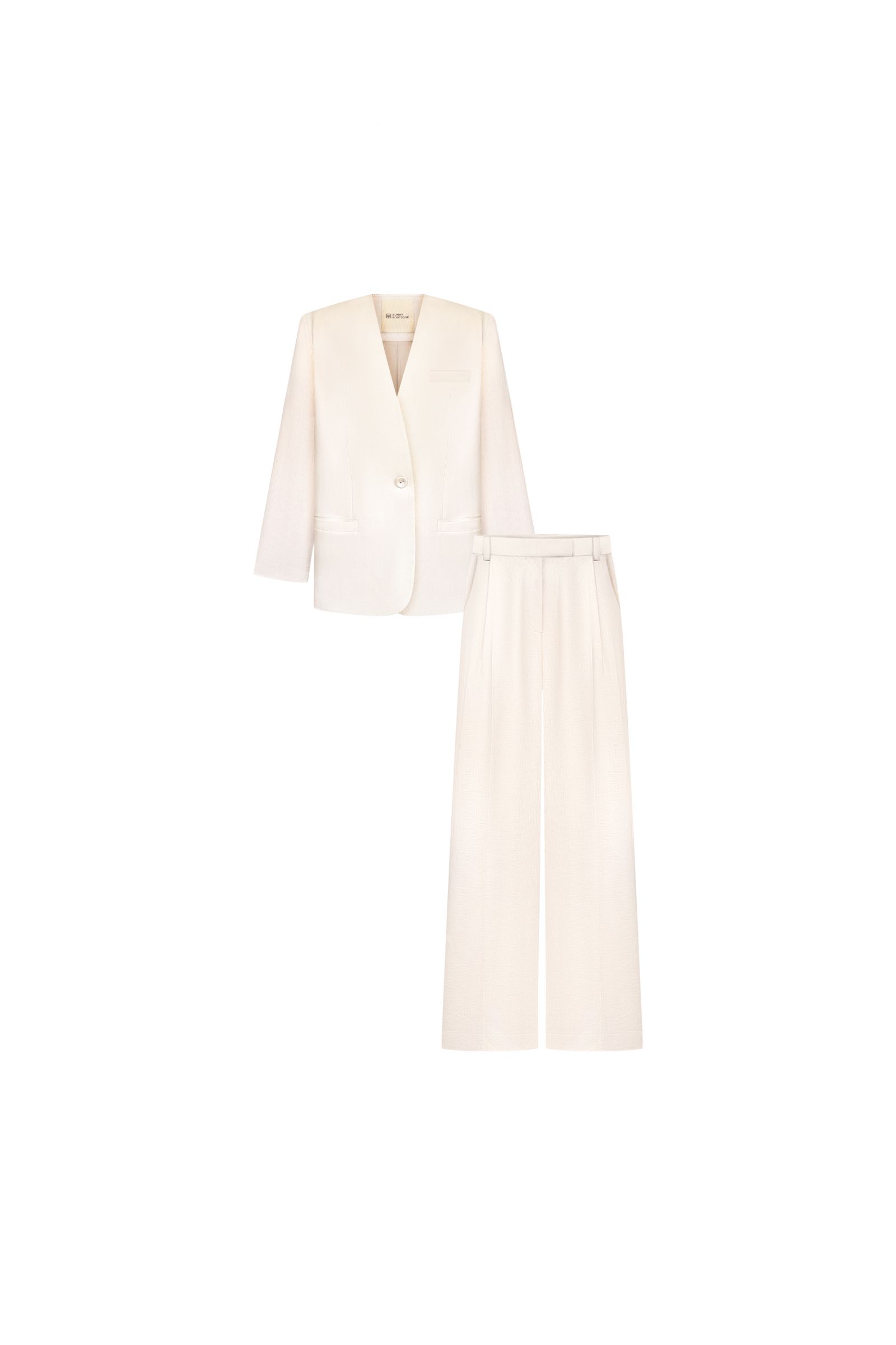 Лляний костюм в молочному кольорі - елегантна легкість у кожному русі. Цей костюм - втілення витонченості й натурального комфорту. Він не лише приємний до тіла, а й забезпечує ідеальну терморегуляцію у теплу пору року. Лаконічний дизайн підкреслює сучасний мінімалізм. Глибокий V-подібний виріз додає образу чуттєвості та свободи. Подовжений силует витягує фігуру та додає елегантності. Широкі, вільні штани створюють м’яку динаміку при ходьбі. Довжина в підлогу додає образу грації та впевненості.