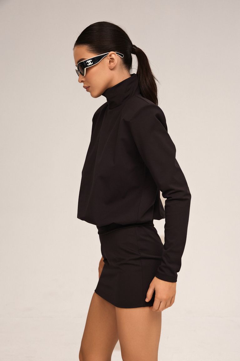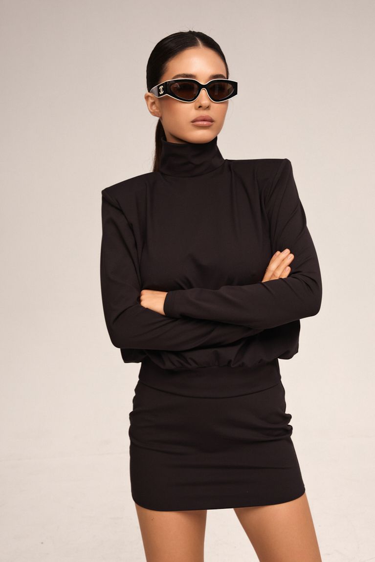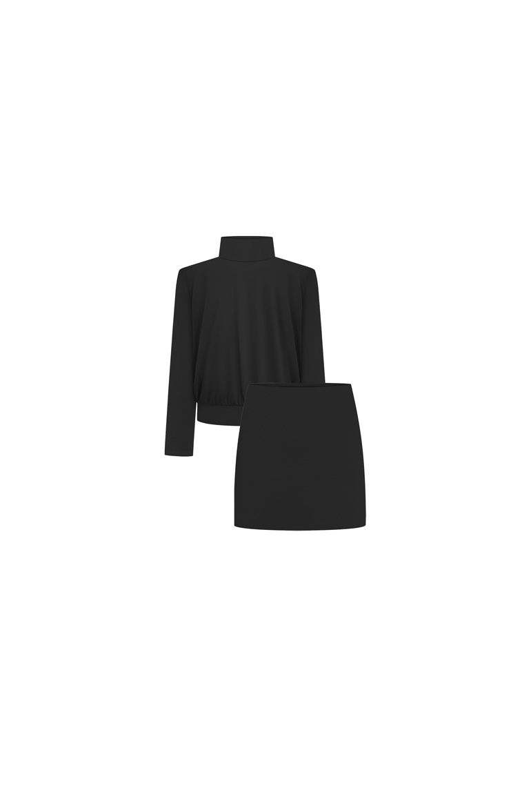 Костюм Shoulders створений для тих, хто цінує мінімалізм, вишуканість і бездоганний силует. Комплект складається з м’якої блузи з високою горловиною та лаконічної спідниці, що разом формують естетично збалансований вечірній образ. Висока стійка горловина додає образу святкової виразності та сучасного характеру. Класичний міні-крій підкреслює ноги та додає образу святкової сміливості. Щільна, еластична тканина гарно облягає фігуру й тримає форму. Цей костюм створений для новорічних вечірок, стильних зустрічей і особливих моментів, коли хочеться виглядати по-справжньому бездоганно. Лаконічний чорний колір робить образ універсальним та позачасовим, а продумані деталі — справді святковим.
