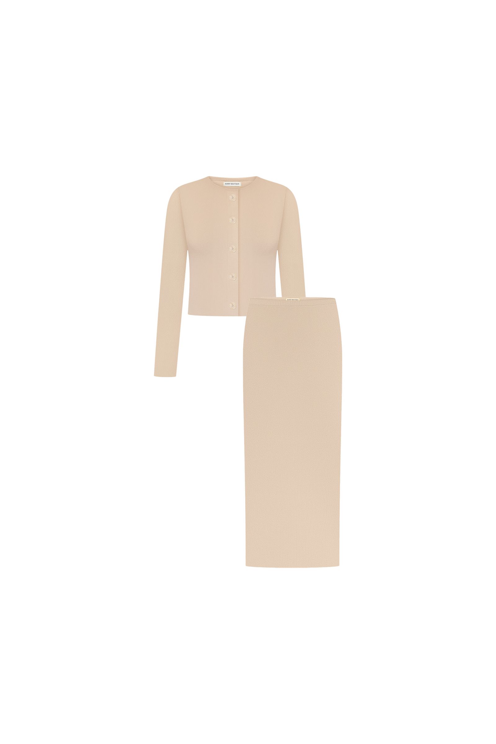 Цей трикотажний костюм поєднує комфорт і лаконічний стиль. Верх виконаний у вигляді приталеної кофти з довгими рукавами та акуратною лінією ґудзиків, що додають виробу стриманої елегантності. Спідниця має рівний силует та ідеальну довжину, яка підкреслює фігуру й забезпечує комфорт під час руху. Щільна трикотажна фактура тримає форму та виглядає преміально, роблячи костюм універсальним вибором для щоденних образів і офісних виходів.