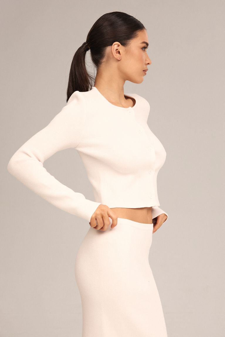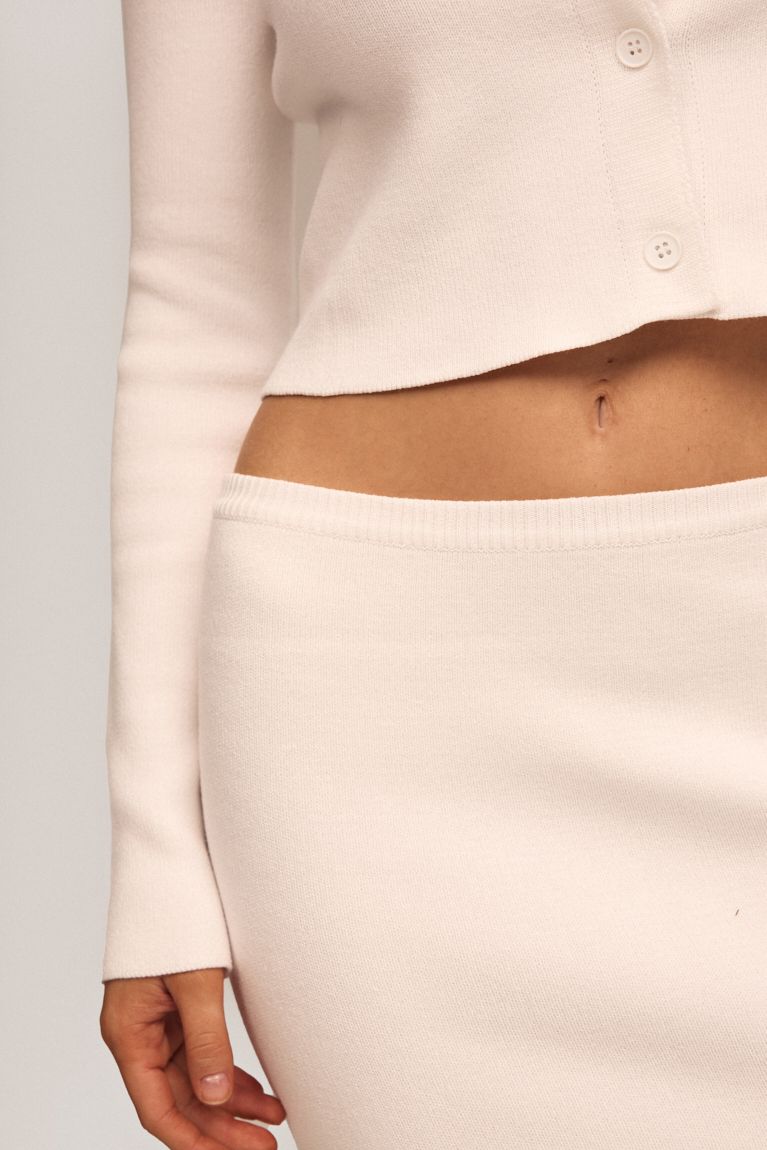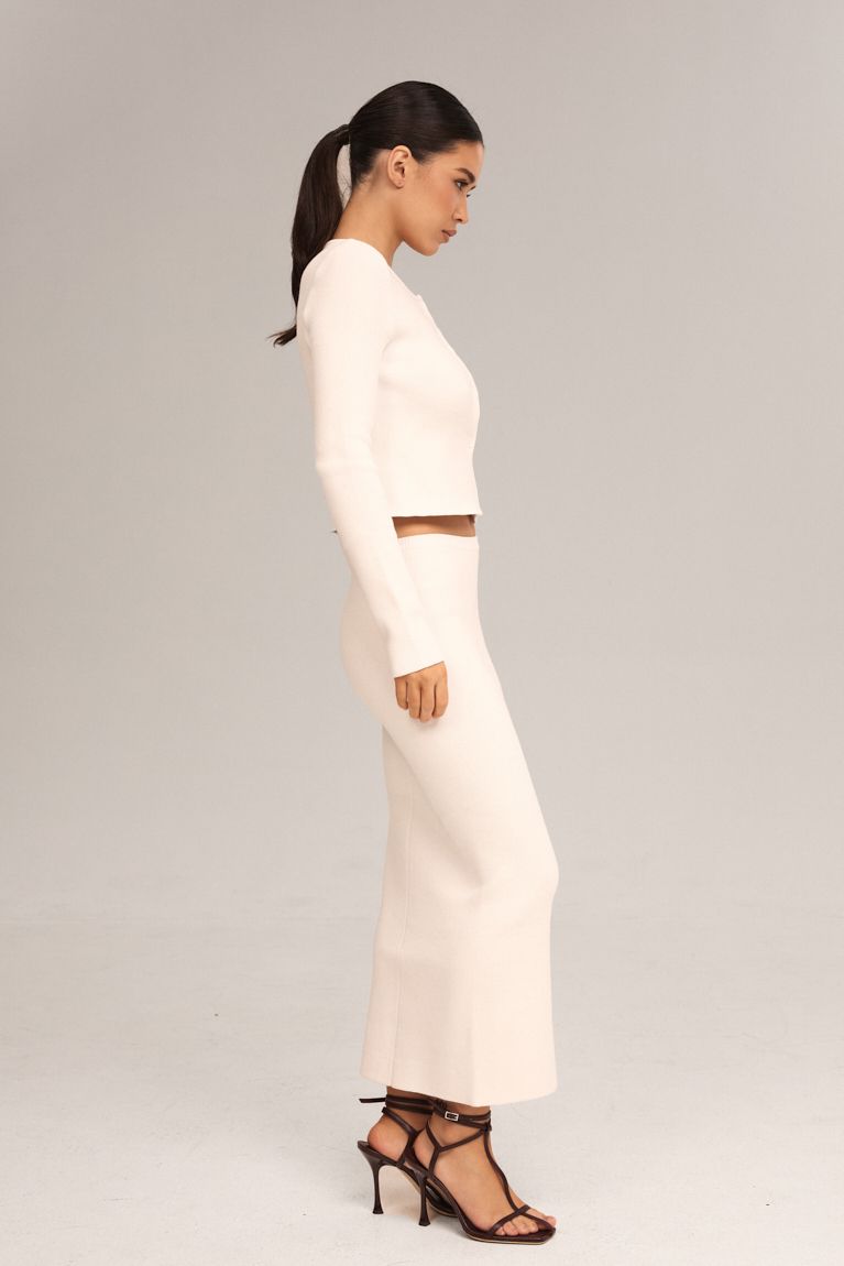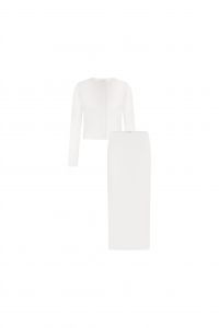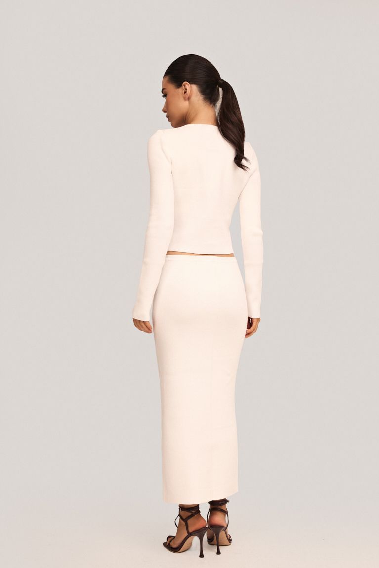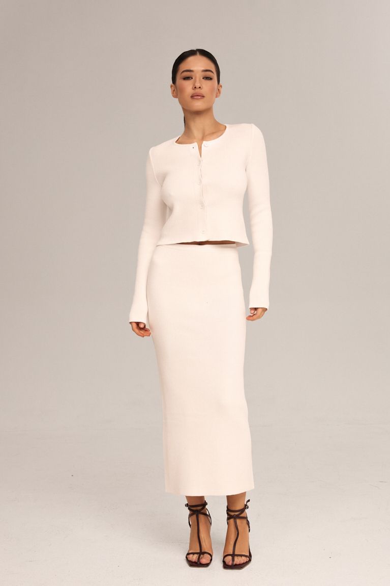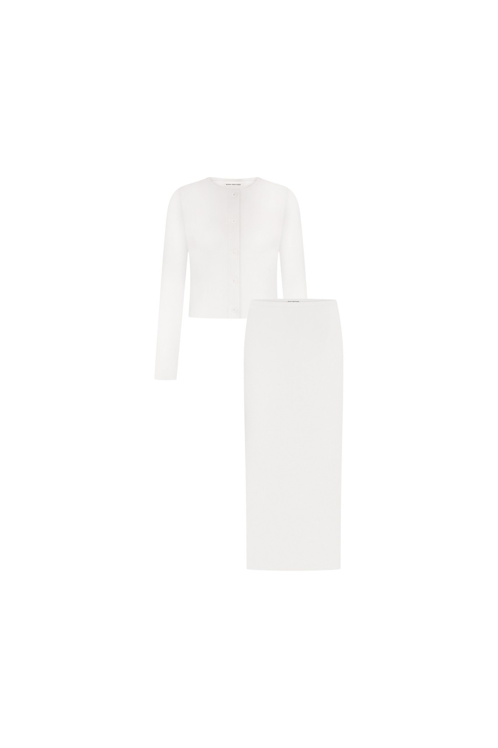 Цей трикотажний костюм поєднує комфорт і лаконічний стиль. Верх виконаний у вигляді приталеної кофти з довгими рукавами та акуратною лінією ґудзиків, що додають виробу стриманої елегантності. Спідниця має рівний силует та ідеальну довжину, яка підкреслює фігуру й забезпечує комфорт під час руху. Щільна трикотажна фактура тримає форму та виглядає преміально, роблячи костюм універсальним вибором для щоденних образів і офісних виходів.