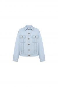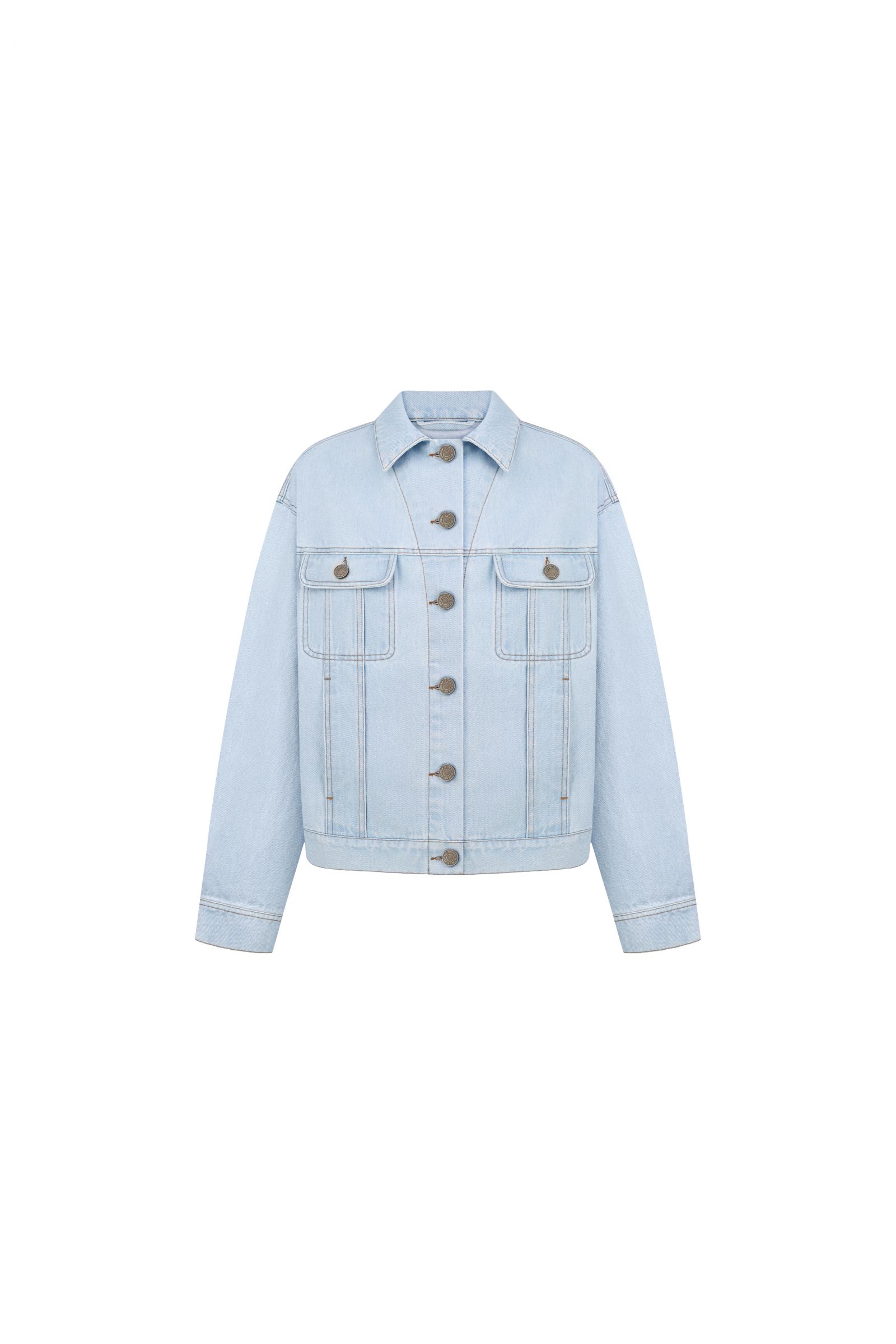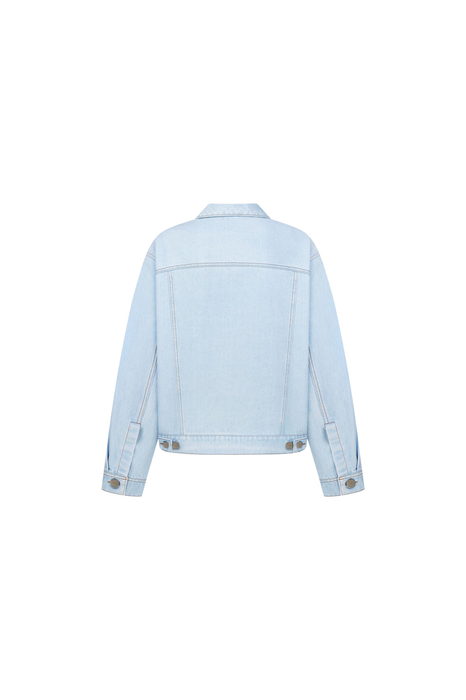 Стильна куртка із щільного деніму - універсальна річ для створення сучасних повсякденних образів. Модель виконана в блакитному кольорі, який легко поєднується з базовими речами гардеробу та підходить для будь-якого сезону. Куртка має вільний крій, що забезпечує комфорт та свободу рухів. Класичний відкладний комір, застібка на ґудзики та накладні кишені на грудях додають виробу практичності та підкреслюють його стильний денім-характер. Подовжені рукави з манжетами формують розслаблений силует і роблять модель ідеальною для щоденного носіння.