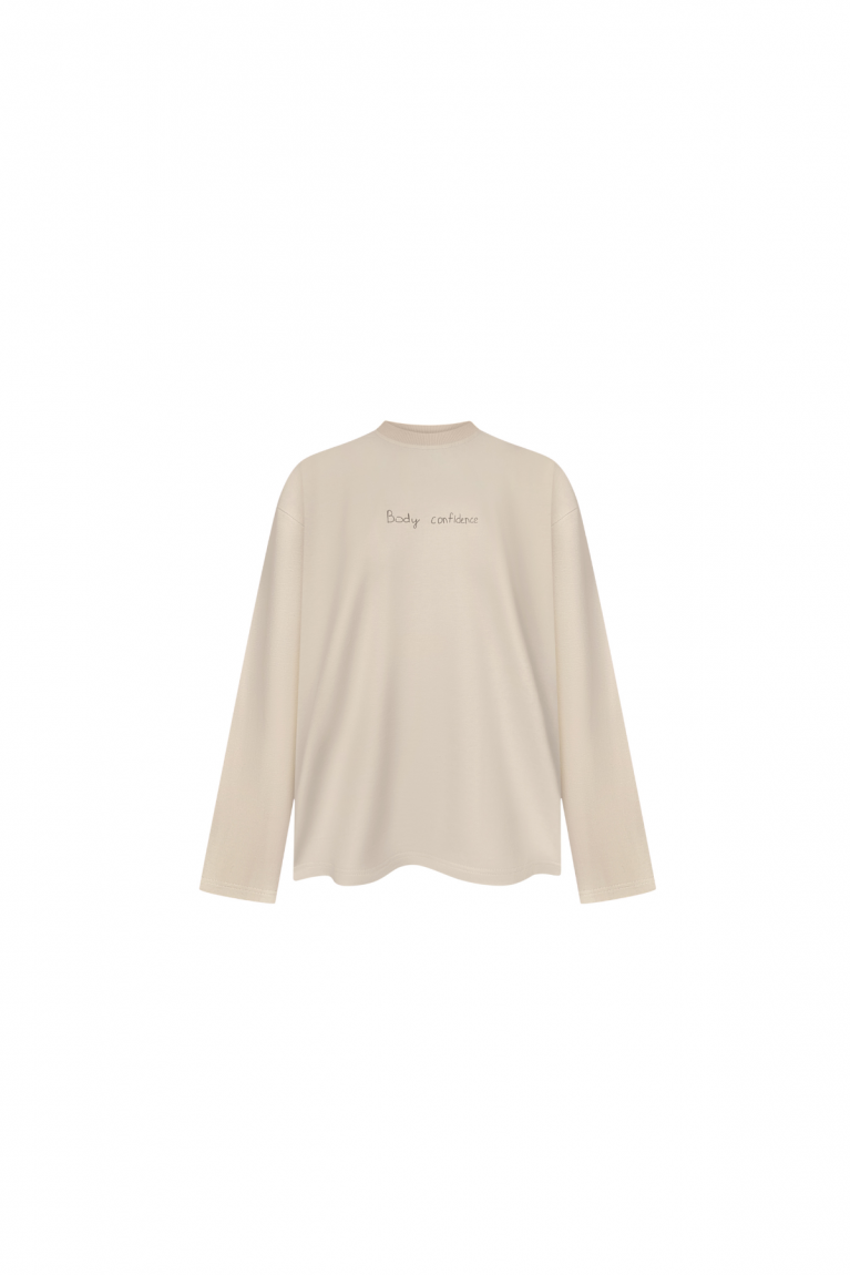 Базовий, але не звичайний - цей лонгслів створений для тих, хто цінує чисті лінії, природні відтінки та продумані деталі. М’яка бавовняна тканина приємна до тіла й забезпечує комфорт протягом усього дня. Акуратна вишивка з фразою «Body confidence» - лаконічне нагадування про любов до себе. Комір із фактурною резинкою, що тримає форму й додає структурності силуету. Вільний крій, який м’яко огортає тіло та підкреслює природність ліній. Максимум комфорту, мінімум відволікань. Цей лонгслів - не просто базовий елемент гардеробу. Це вислів упевненості, який легко інтегрується і в кежуал-лук, і в естетичні образи з ноткою спокою.
