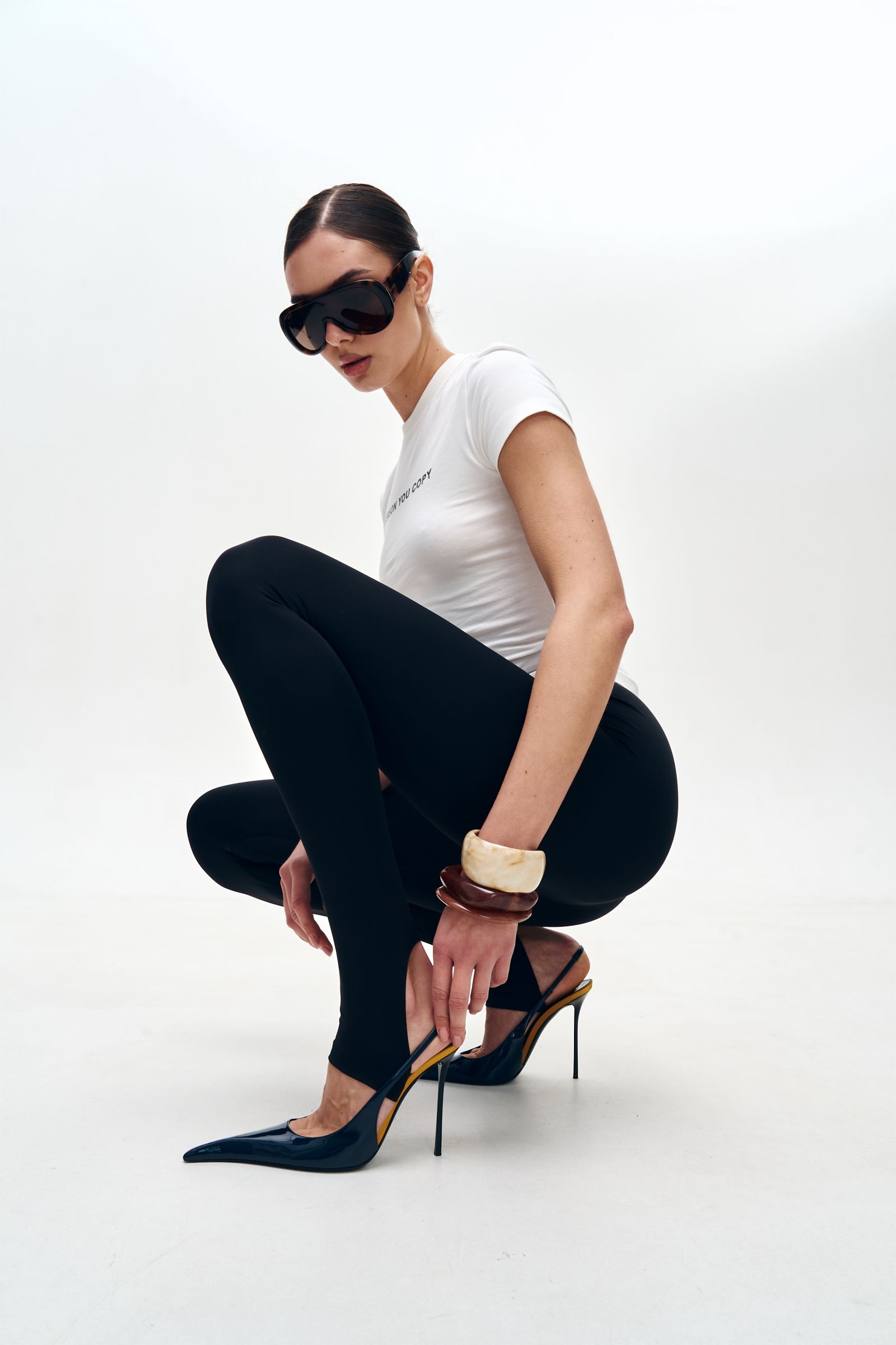 Елегантні та комфортні лосини з відкритою п’яткою створені для тих, хто цінує стиль і свободу рухів. Виготовлені з еластичного біфлексу, вони ніжно облягають фігуру, підкреслюючи силует і забезпечуючи максимальний комфорт протягом дня. М’який біфлекс - приємний до тіла, дихаючий, з високою еластичністю; не просвічується й чудово тримає форму. Посадка: висока талія для ідеальної фіксації та комфортної посадки. Насичений чорний колір - універсальний і легко комбінується з будь-яким гардеробом. Поєднуйте ці лосини з об’ємними светрами, шкіряними куртками або піджаками для створення стильного міського образу. Ідеальні для прогулянок, подорожей або вечірніх виходів.