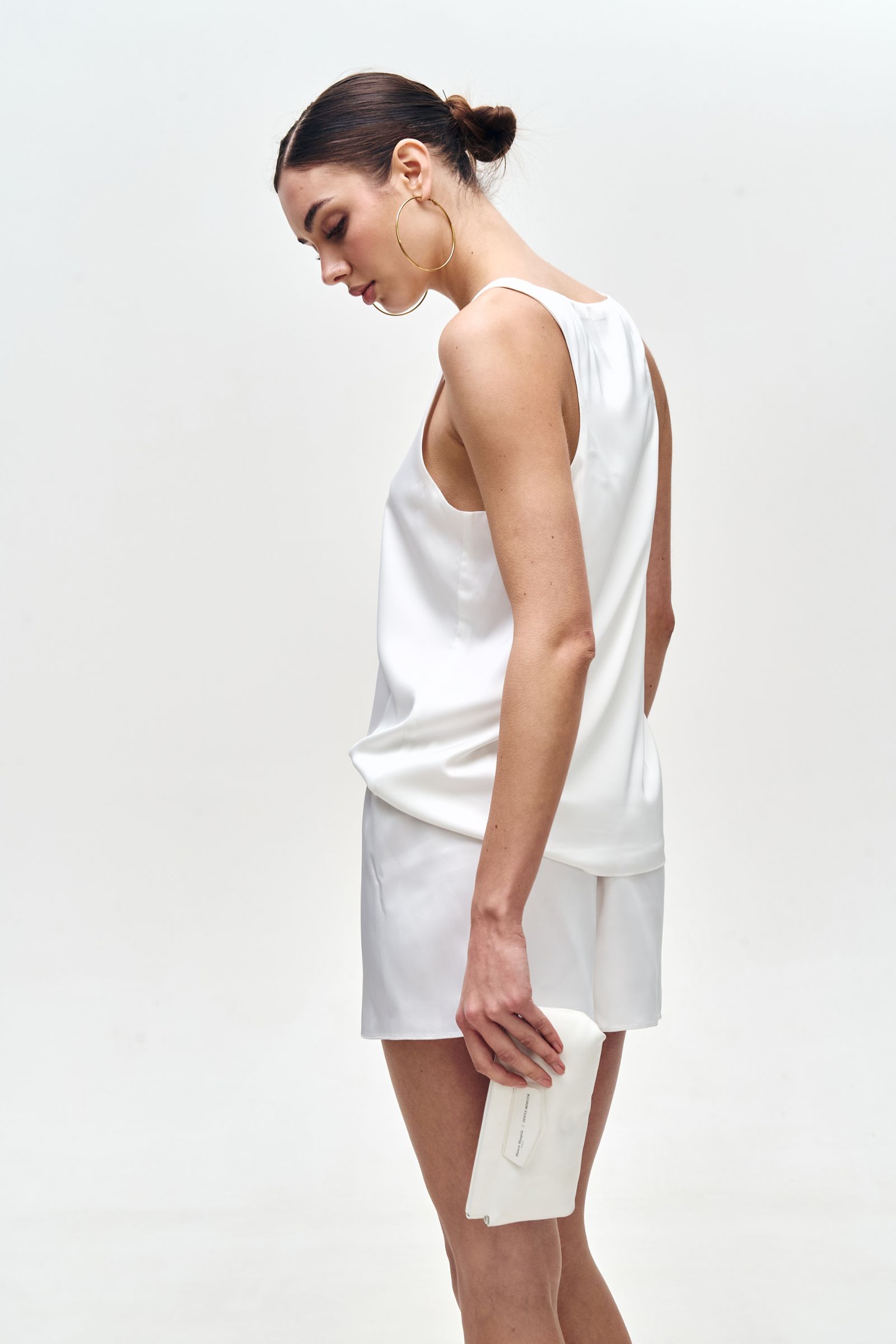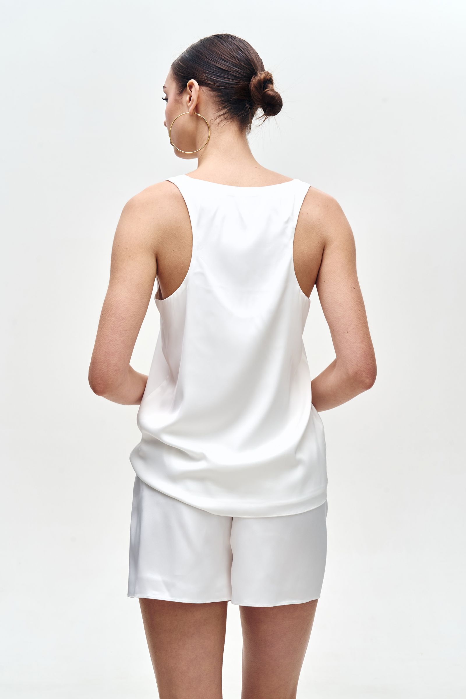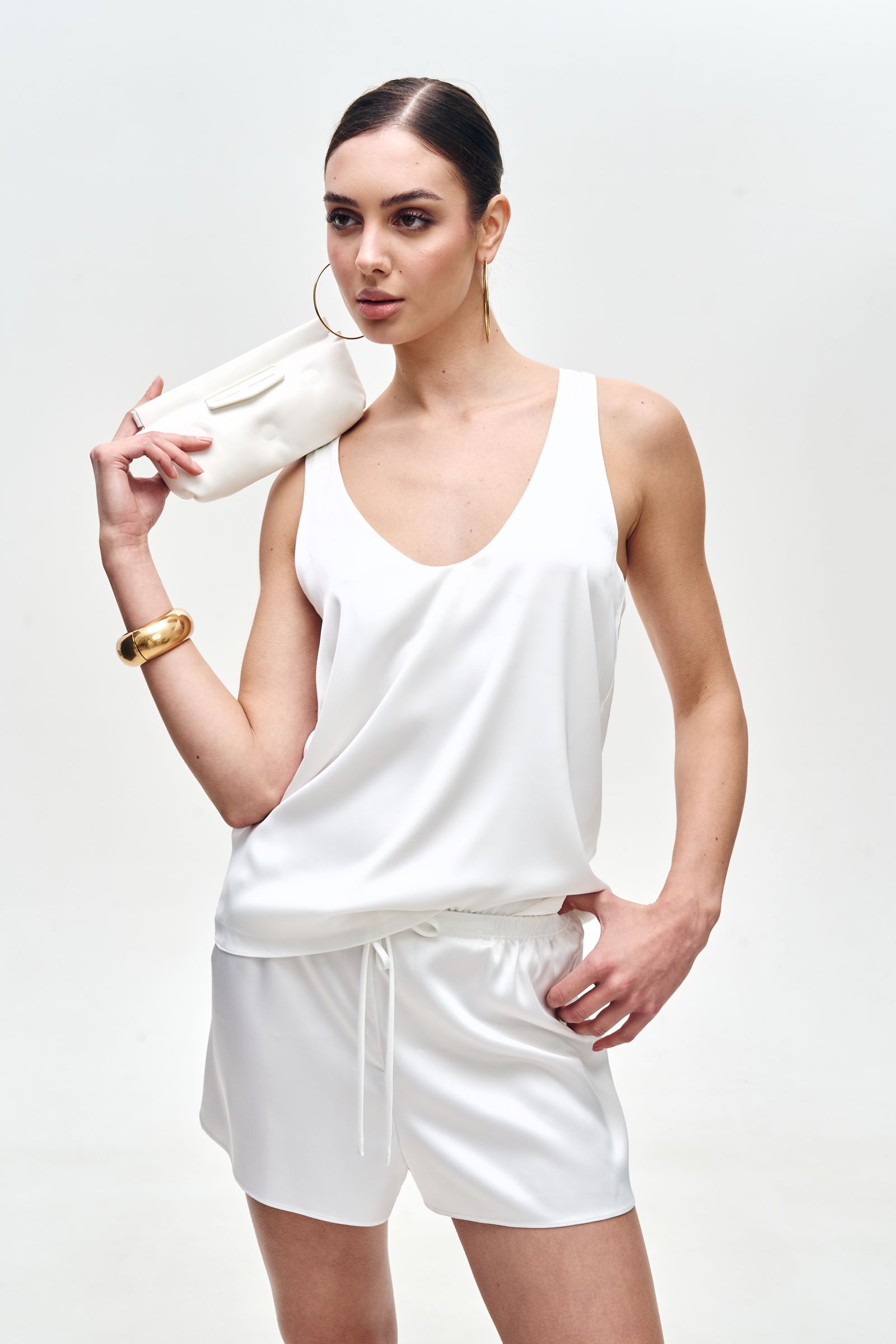 Елегантність у простоті - саме так можна описати цю шовкову майку. Виготовлена з преміального шовку армані, вона вражає своєю ніжністю, матовим блиском і бездоганною посадкою. Глибокий виріз “човник” спереду - додає витонченості, роблячи акцент на ключиці. Білий колір - універсальний, стильний та легко комбінується з будь-якою базою. Лаконічний дизайн без зайвих деталей - ідеальний варіант як для офісного образу під жакет, так і для вечірнього виходу. Ця шовкова майка - маст-хев для гардеробу кожної жінки, яка цінує комфорт, якість і сучасну естетику.