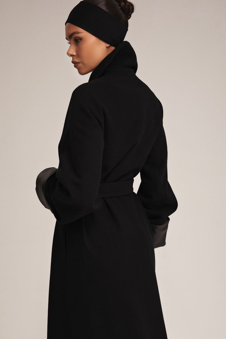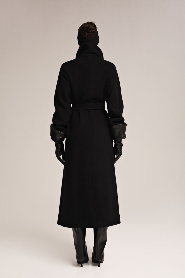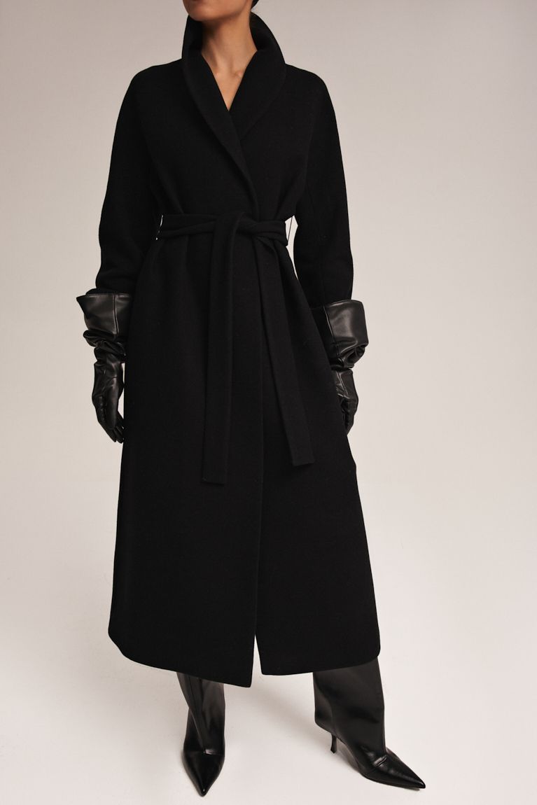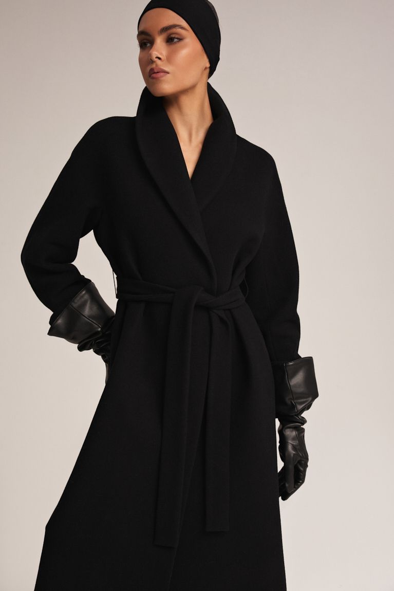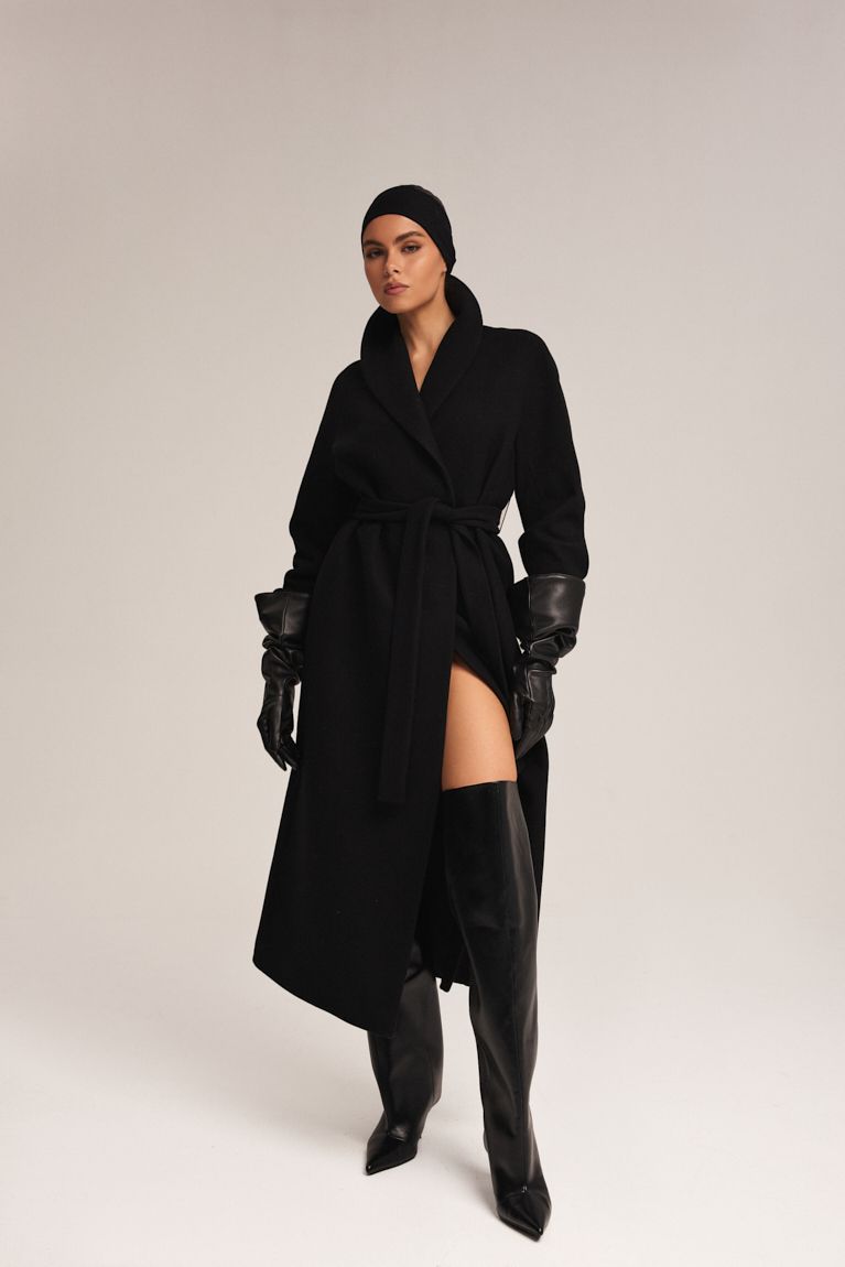 Пальто Premium в чорному кольорі поєднує стриману розкіш і продуманий мінімалізм. Силует прямий, з легким акцентом на талії завдяки м’якому поясу, який дозволяє регулювати посадку та створювати різні образи - від розслабленого до більш структурованого. Глибокий виріз додає вишуканості та підкреслює багатошаровість аутфіту. Пальто виконане з щільної, високоякісної вовни, яка добре тримає форму й забезпечує комфорт у прохолодну погоду. Мінімалістичний комір-шаль, що додає м’якості образу. Невидимі кишені, що зберігають чистоту фасону. Пальто - універсальна річ, яка легко доповнює вечірні, ділові та повсякденні образи, роблячи кожен з них виразним та стильним. Ідеальний вибір для тих, хто цінує сучасну елегантність і майстерно виконані деталі.