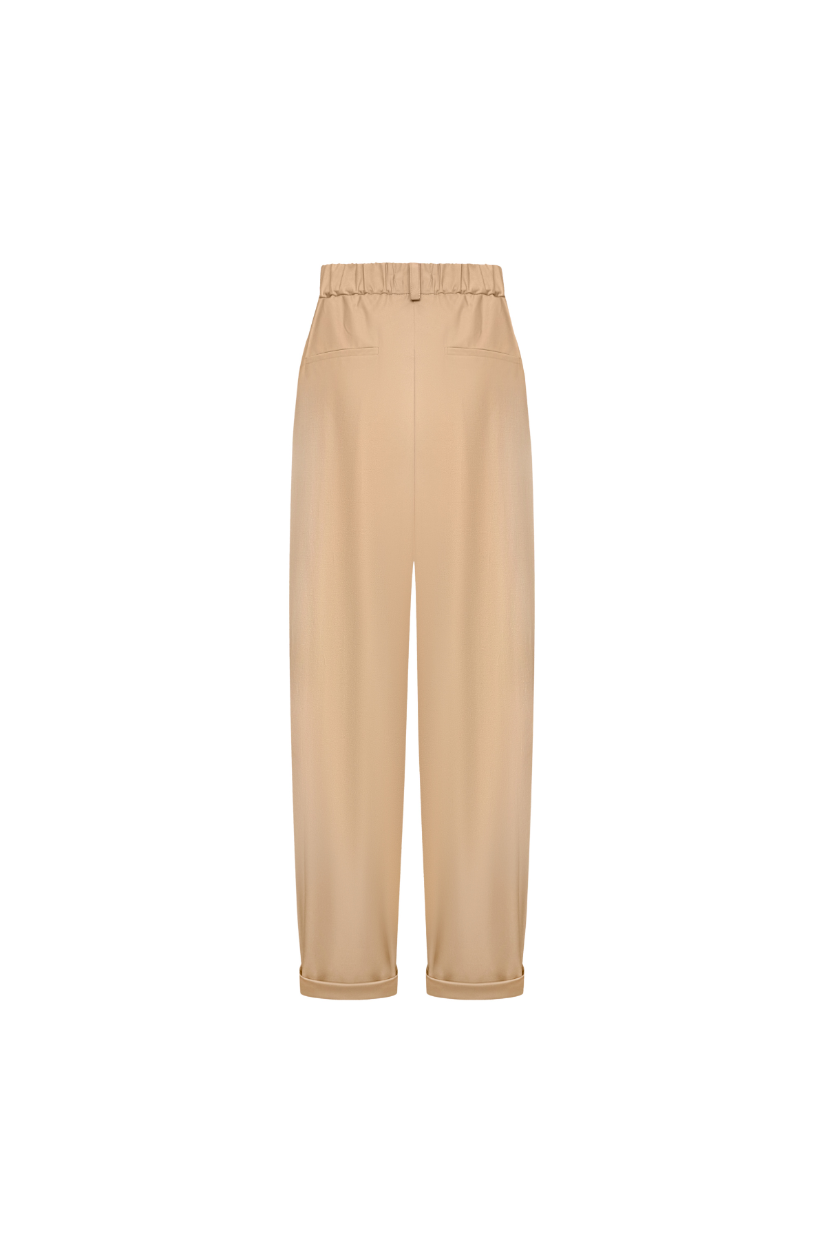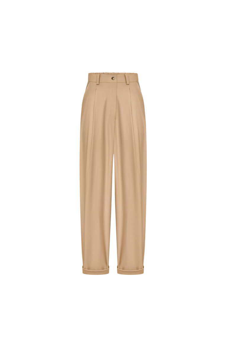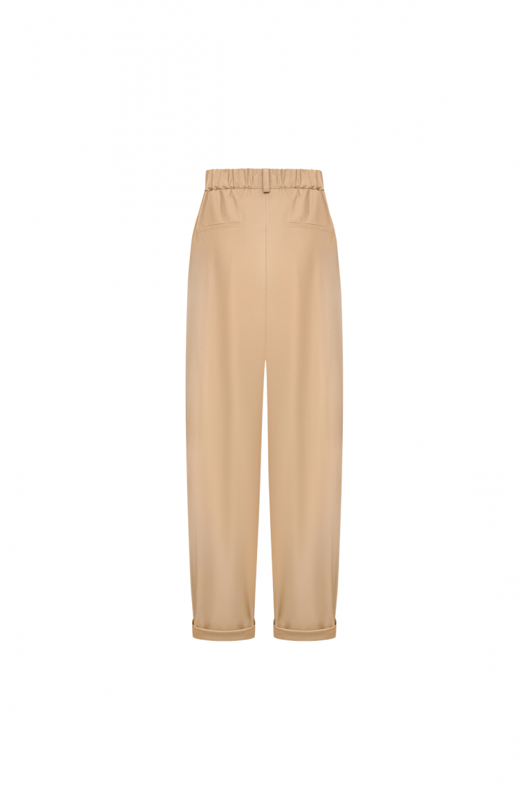 Базові та водночас стильні штани, виконані з високоякісного котону, який забезпечує комфорт і дихаючі властивості тканини. Модель представлена у класичному бежевому кольорі, що легко поєднується з будь-яким гардеробом. Деталі крою роблять ці штани універсальними як для повсякденних, так і для більш елегантних образів: Еластичний пояс ззаду для зручності та ідеальної посадки. Спереду – застібка на гудзик і блискавку. Фігурні защипи спереду додають штанам елегантності. Пояс зі шльовками дає можливість доповнити образ улюбленим ременем.Практичні кишені спереду та декоративні – ззаду. Низ із підворотом створює сучасний та акуратний вигляд. Ці штани – ідеальний вибір для тих, хто цінує баланс між комфортом і стилем. Їх легко комбінувати з футболками, сорочками чи жакетами.