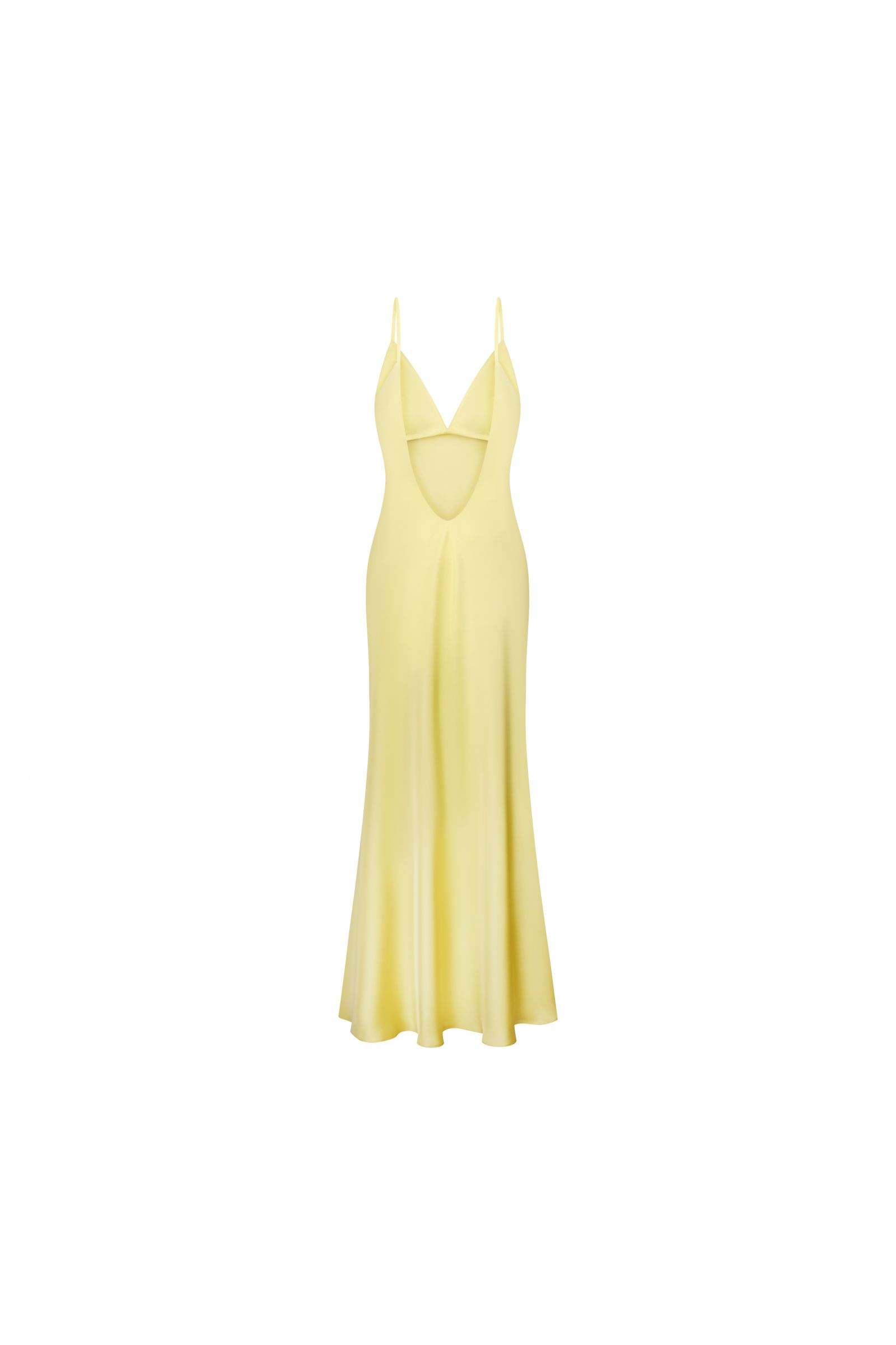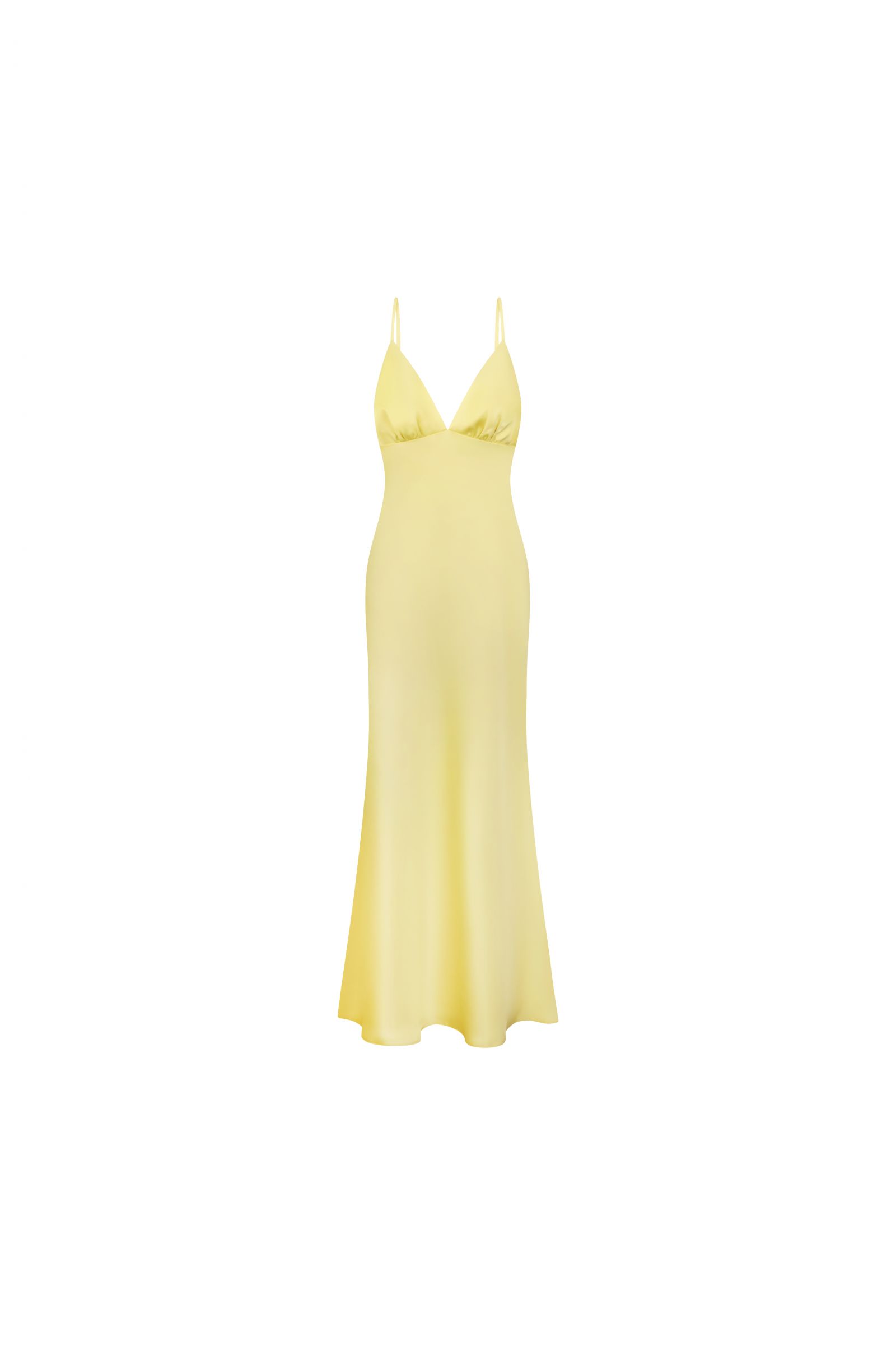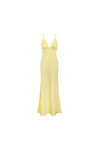 Сліп-дрес у ніжному лимонному відтінку - втілення жіночності та витонченості. Модель виконана з гладкої, легкої тканини, яка м’яко огортає силует і створює ефект плавного струменіння при русі. Ліф із глибоким V-подібним вирізом та тонкими бретелями підкреслює зону декольте, додаючи образу делікатної сексуальності. Приталений крій витягує силует, а довга спідниця з легким розширенням донизу формує елегантний, витончений образ. Особливістю сукні є відкрита спинка з акуратним вирізом, що додає образу шарму та привабливості. Ідеальний вибір для вечірніх заходів, святкових подій або романтичних виходів.