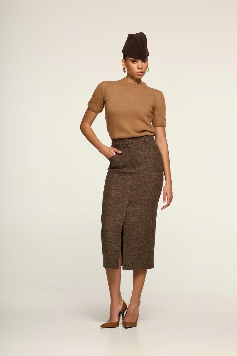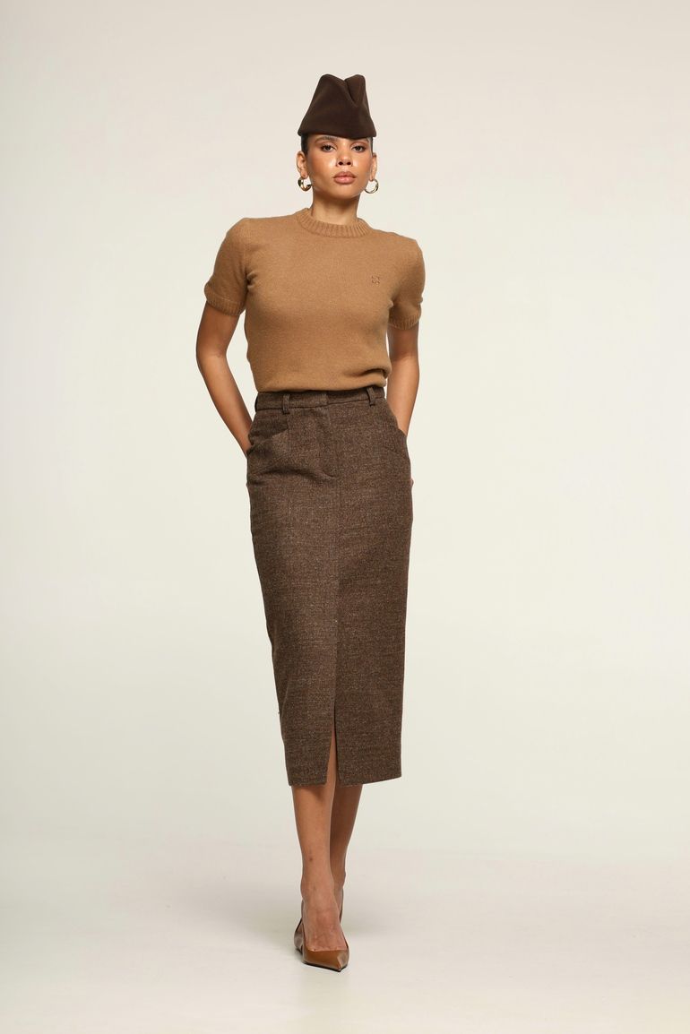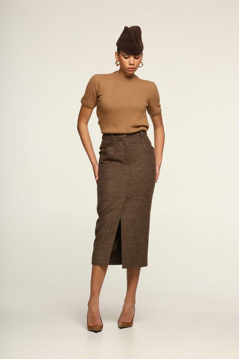 Вишукана міді-спідниця з вовни - уособлення витонченості та стриманої елегантності. Натуральна фактурна тканина з благородним меланжевим відтінком створює глибокий, насичений образ і забезпечує тепло та комфорт у прохолодну пору року. Головний акцент моделі — фігурна лінія талії, що формує елегантний жіночний силует і додає виробу неповторного характеру. Прямий крій подовжує силует, а акуратний розріз спереду дарує свободу рухів і додає нотку сучасності. Довжина міді робить спідницю універсальною для офісних, ділових та повсякденних образів. Ця спідниця - вдалий вибір для тих, хто шукає гармонію стилю, структури та високої якості натуральних матеріалів.