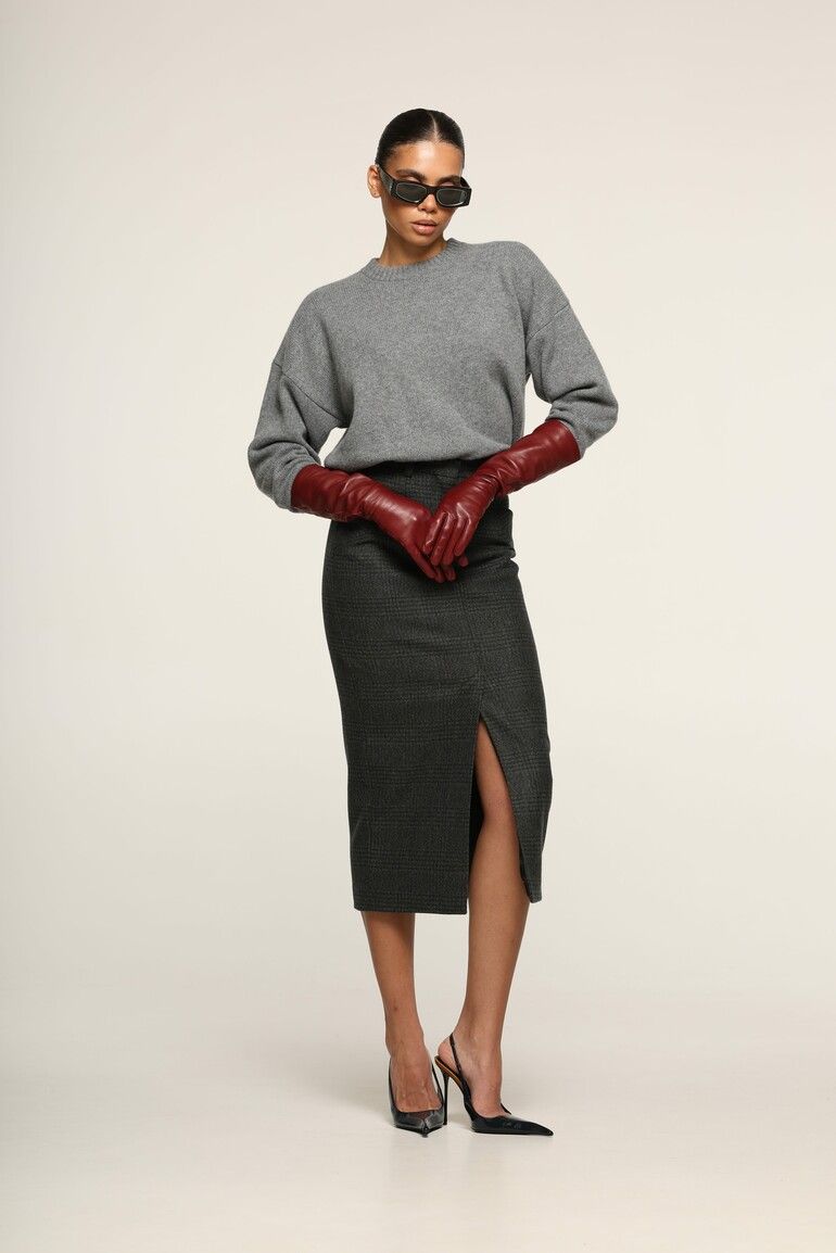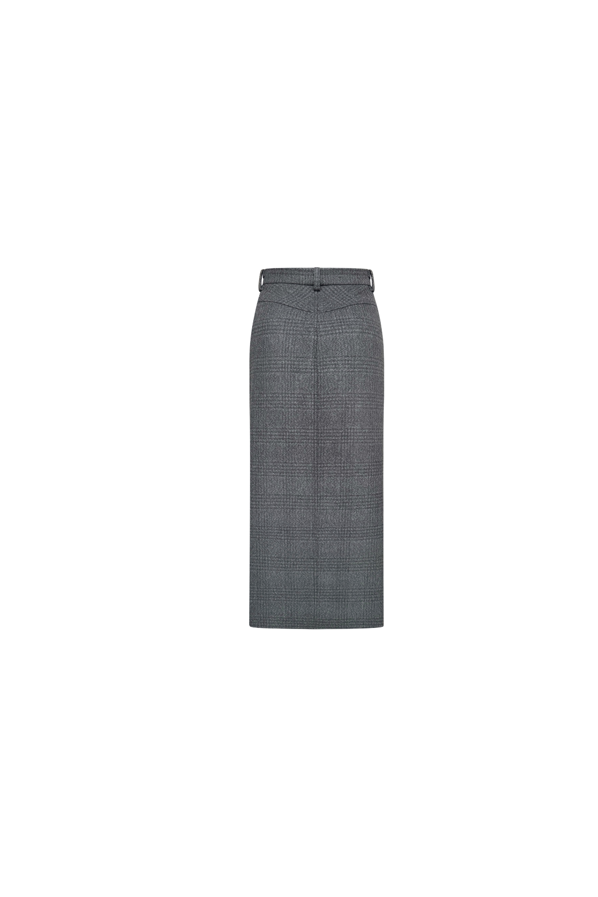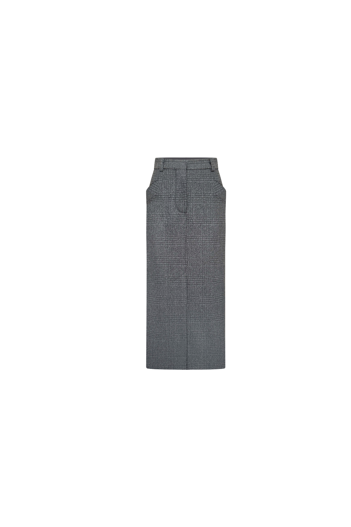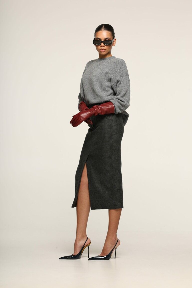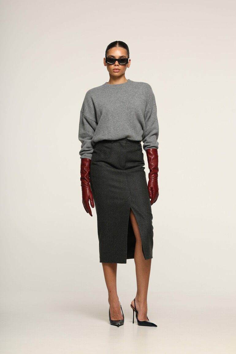 Елегантна міді-спідниця з акцентом на чисті лінії та преміальний крій. Виконана з якісної вовни з ледь помітним картатим рисунком, вона створює глибину образу та підкреслює статусність стилю. Стриманий відтінок і текстурність тканини роблять цю модель ідеальною для міського гардероба. Прямий силует формує витончену та подовжену лінію фігури, а стильний фронтальний розріз забезпечує комфорт кроку й додає сучасного характеру. Шльовки на талії дозволяють доповнити образ ременем, створюючи додатковий акцент і підкреслюючи талію. Завдяки універсальній посадці та довжині спідниця легко вписується в повсякденні та ділові комплекти, надаючи їм стриманої жіночності та впевненості.