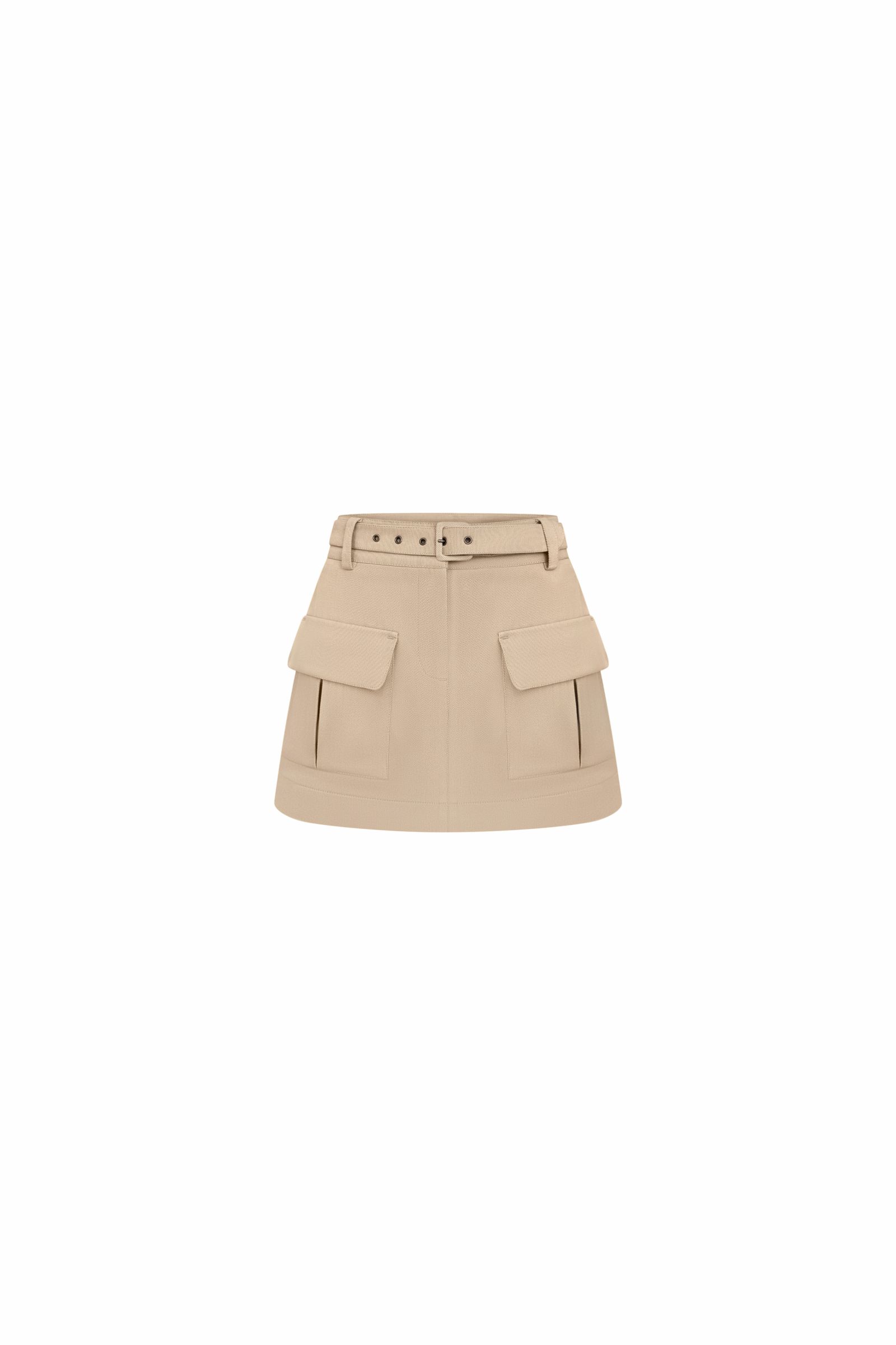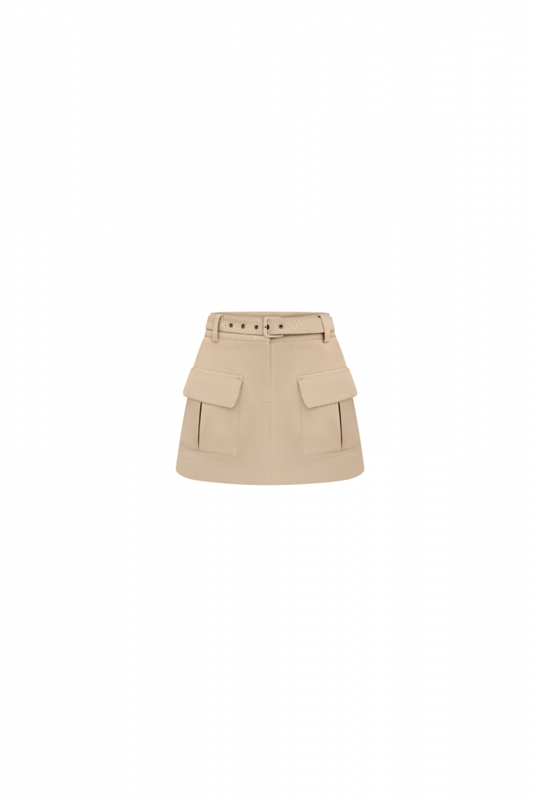 Спідниця Сафарі – втілення практичної елегантності в стилі сафарі. Модель виготовлена з міцної тканини у бежевому відтінку, що додає універсальності та природності. Оригінальності додають дві великі накладні кишені з клапанами, які не лише прикрашають, а й виконують функціональну роль. Низька посадка підкреслює талію, а знімний ремінь із металевими деталями забезпечує ідеальний силует. Завдяки розрізам з боків спідниця виглядає динамічно та сучасно. Цей виріб стане чудовим доповненням як до повсякденного, так і до більш елегантного гардероба.