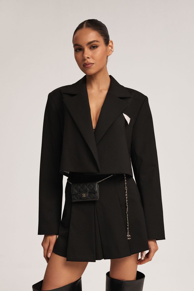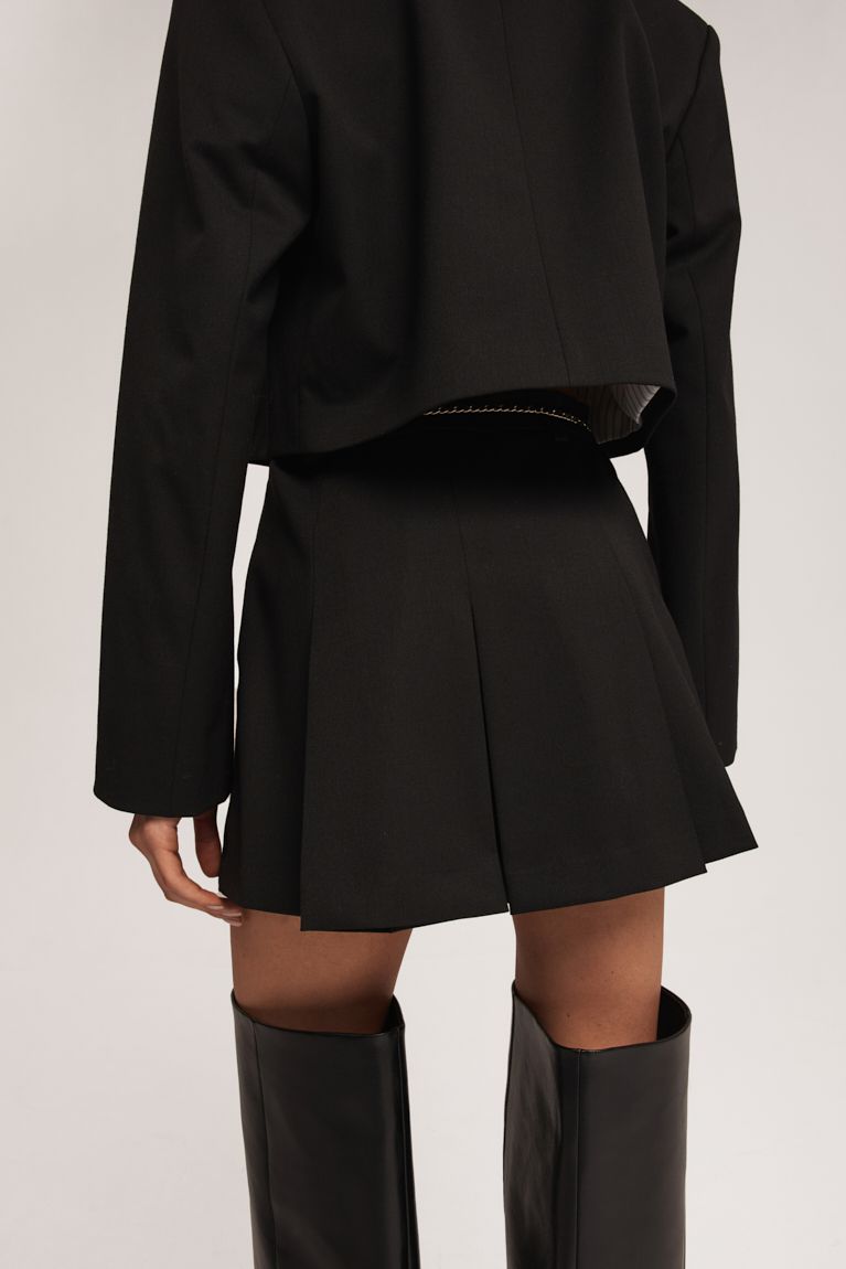 Чорна міні-спідниця зі складками, виготовлена з високоякісного матеріалу. Елегантний дизайн з класичним кроєм ідеально підходить для офісних або вечірніх образів. Спідниця має стриманий і лаконічний вигляд, який легко поєднується з іншими елементами гардеробу. Носіть із жакетом або светром для стильного вигляду. Підійде для створення ділового образу або на вечірні заходи.