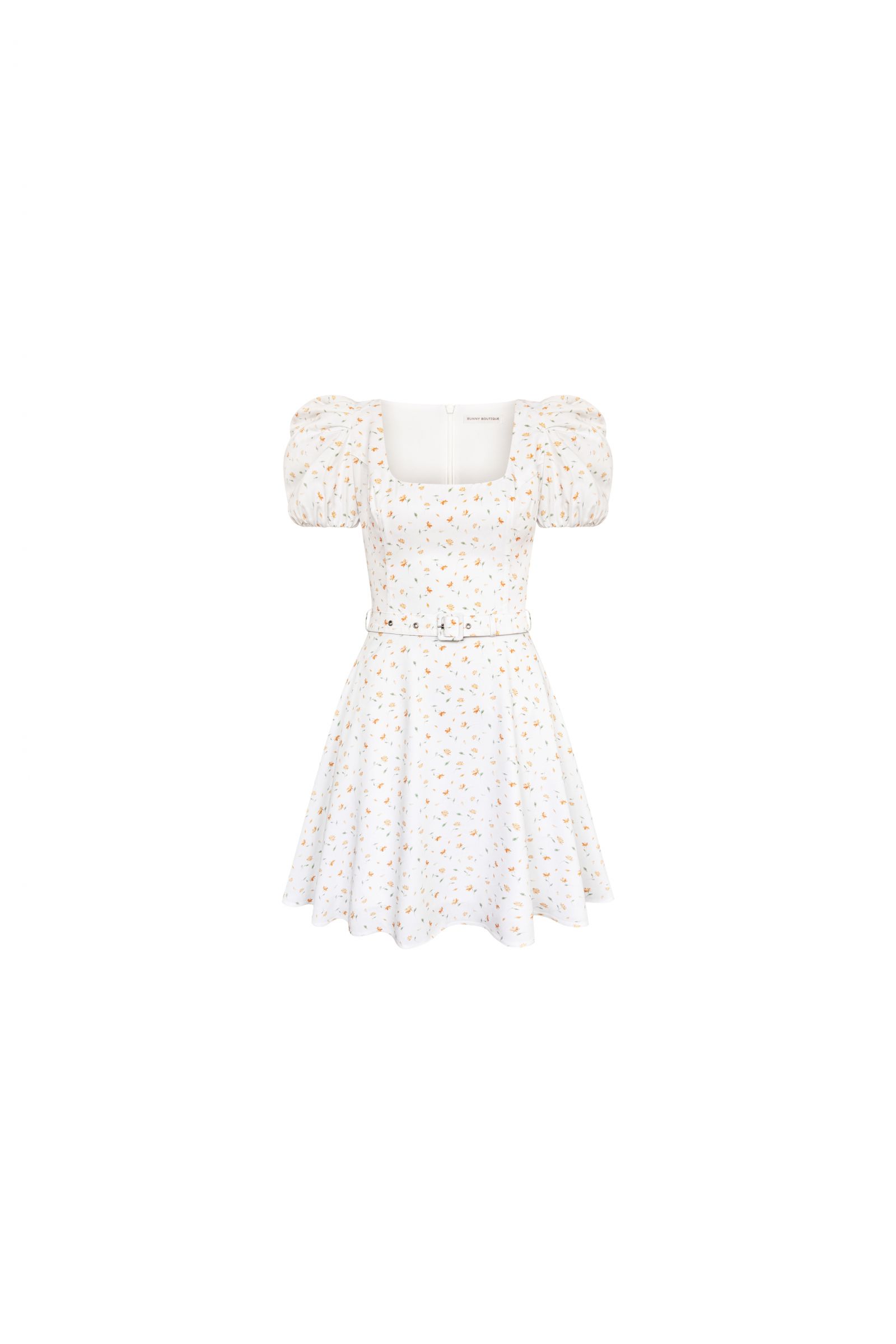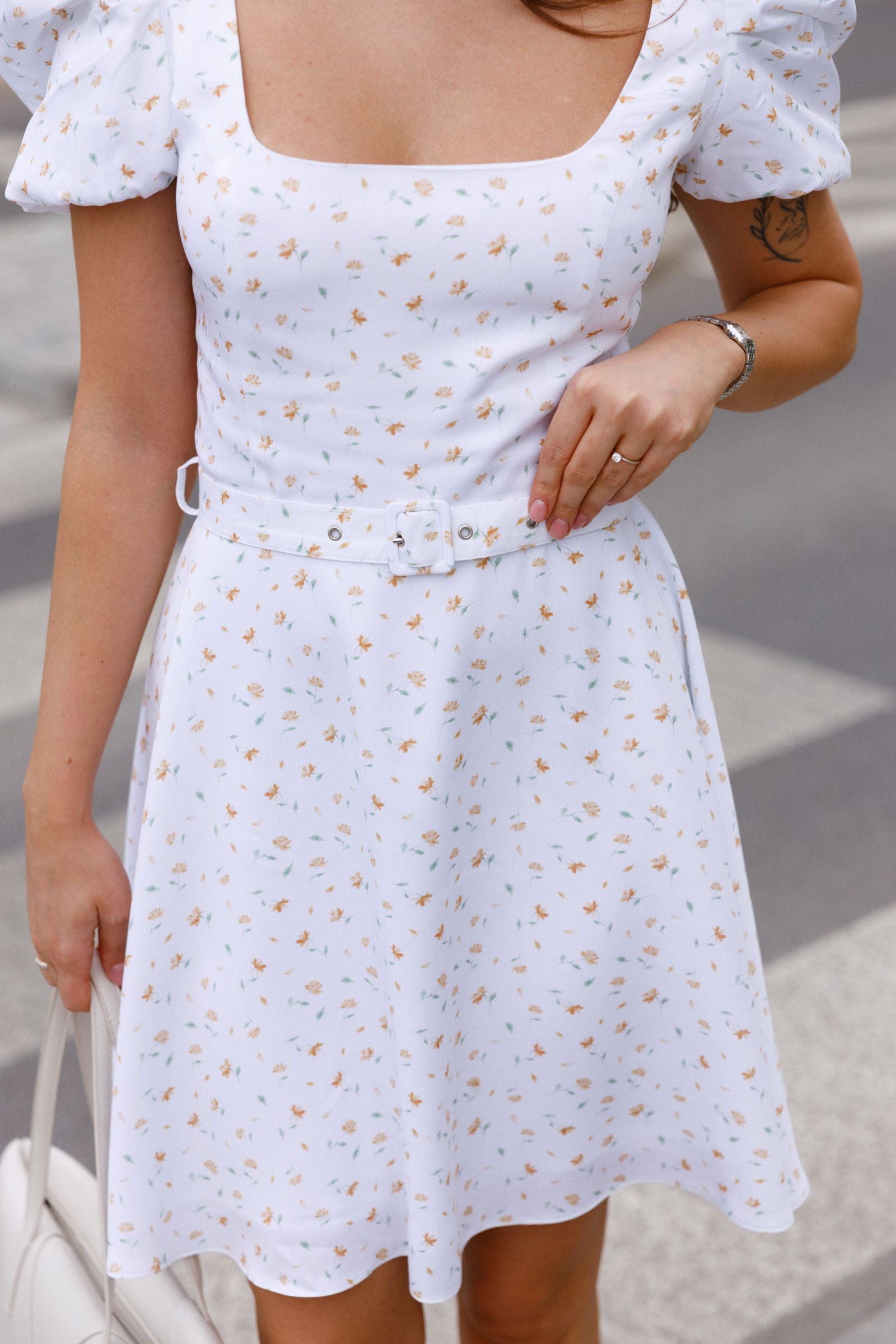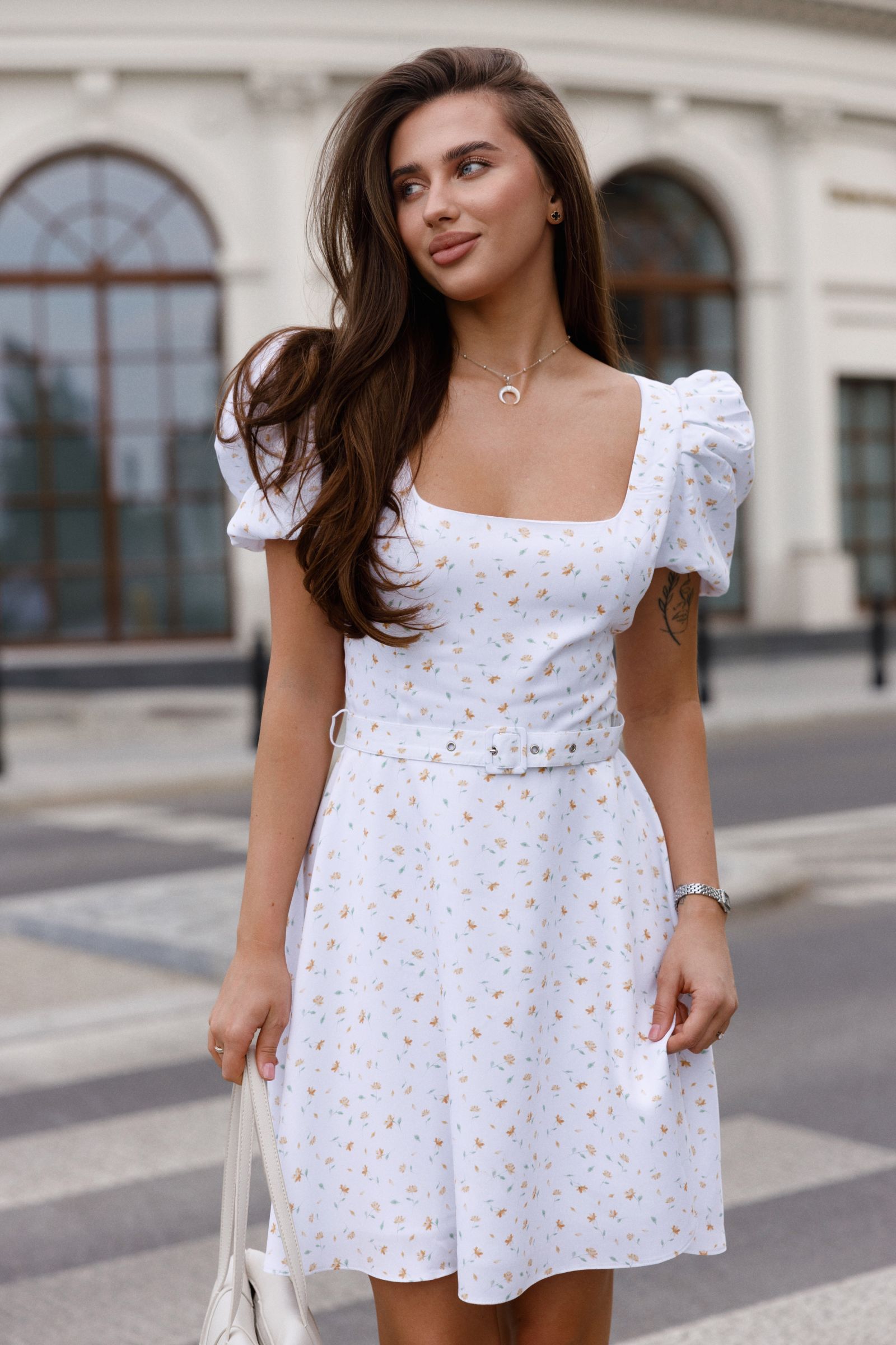 Підкресліть свою жіночність з цією елегантною сукнею в романтичному стилі. Легка та ніжна, вона стане ідеальним вибором для літніх прогулянок, побачень або святкових подій. Приталений крій із розкльошеною спідницею підкреслює талію, створюючи витончений силует. Глибокий квадратний виріз додає образу відкритості та елегантності. Об’ємні короткі рукави-буфи створюють легкий акцент і додають шарму. Квітковий візерунок у пастельних тонах робить сукню ніжною та витонченою. Пояс з того ж матеріалу в комплекті для додаткового акценту. Легка, приємна до тіла тканина, ідеально підходить для теплої пори року. Поєднуйте з босоніжками або балетками, невеликою сумочкою та витонченими прикрасами для завершення образу.