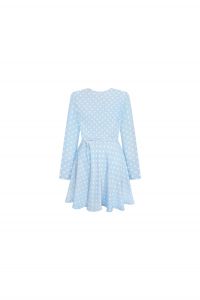 Ніжна та жіночна сукня у трендовому горошку стане ідеальним вибором для романтичних образів і особливих подій. М’який блакитний відтінок додає легкості, а приталений крій з поясом красиво підкреслює талію. Розкльошена спідниця створює витончений силует і дарує свободу рухів. Оригінальна відкрита спинка додає образу елегантної звабливості, залишаючись водночас стриманою. Довгі рукави роблять сукню універсальною для різних сезонів - від весняних прогулянок до святкових вечорів. Ідеально поєднується з класичними туфлями, балетками або акуратними ботильйонами.