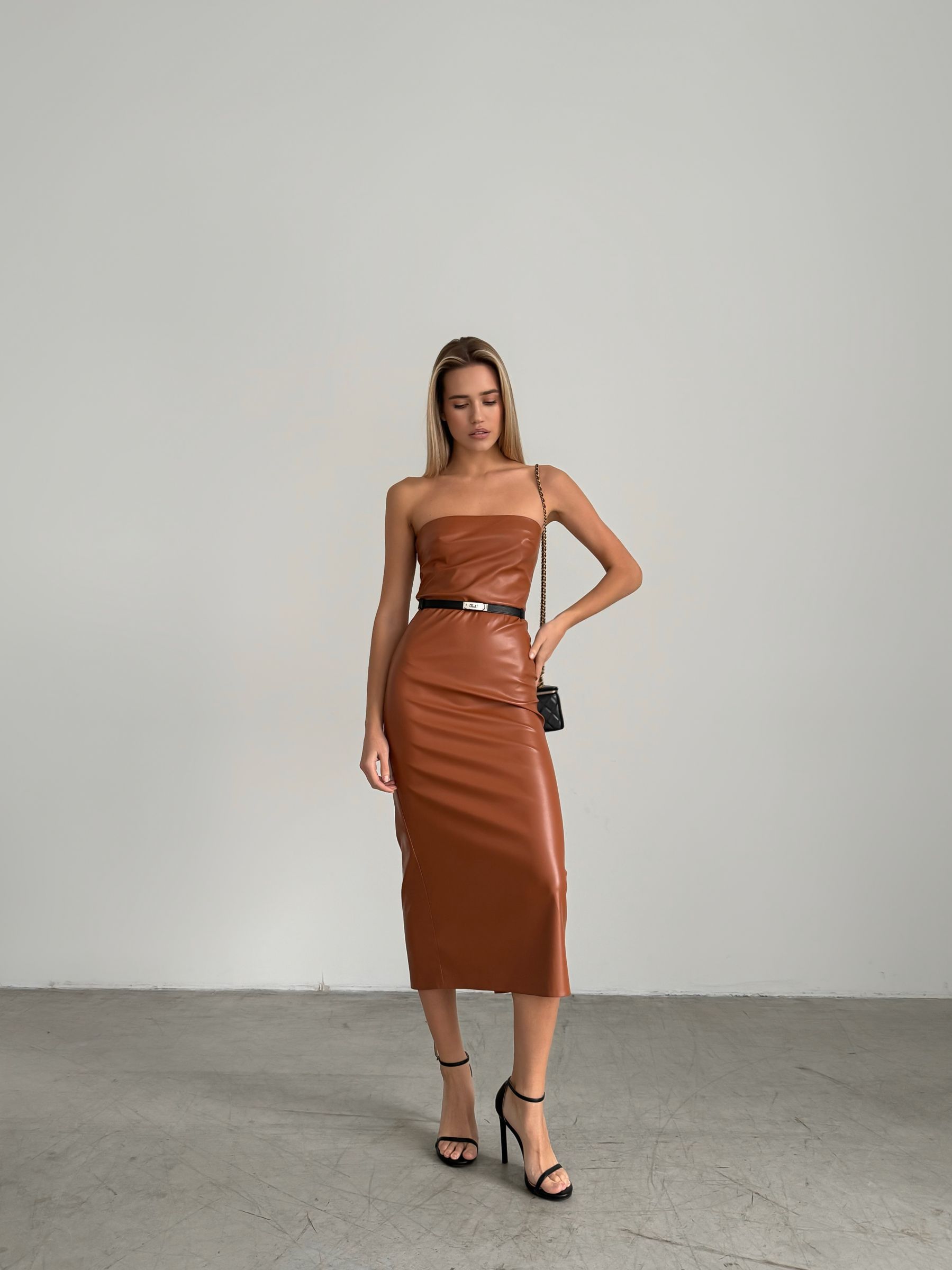 Сукня midi - втілення сучасної жіночності та мінімалістичного шику. Виготовлена з тонкої, м’якої екошкіри, вона ідеально повторює силует, створюючи витончений та бездоганно гладкий контур. Бюстьє-верх без бретелей відкриває плечі й додає образу вишуканості та сміливості. Міді-довжина та пряма лінія низу роблять сукню універсальною - вона доречна як для вечірнього виходу, так і для стильних подій. М’яка посадка та еластичність матеріалу забезпечують комфорт при носінні, не обмежуючи рухів. Ця модель поєднує в собі мінімалізм, сексуальність і преміальну естетику. У комплекті з підборами та невеликою сумочкою вона створює образ, який важко забути.