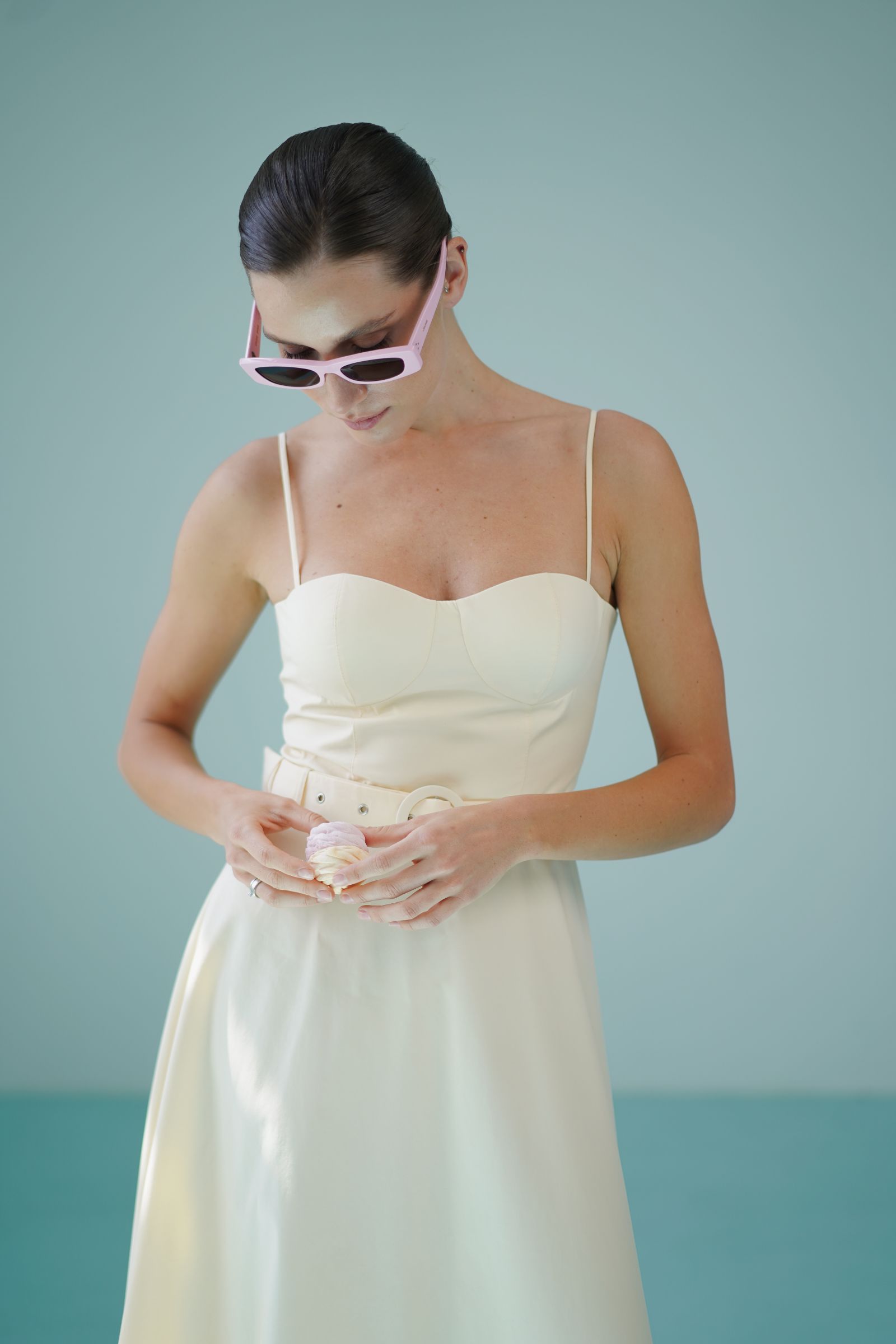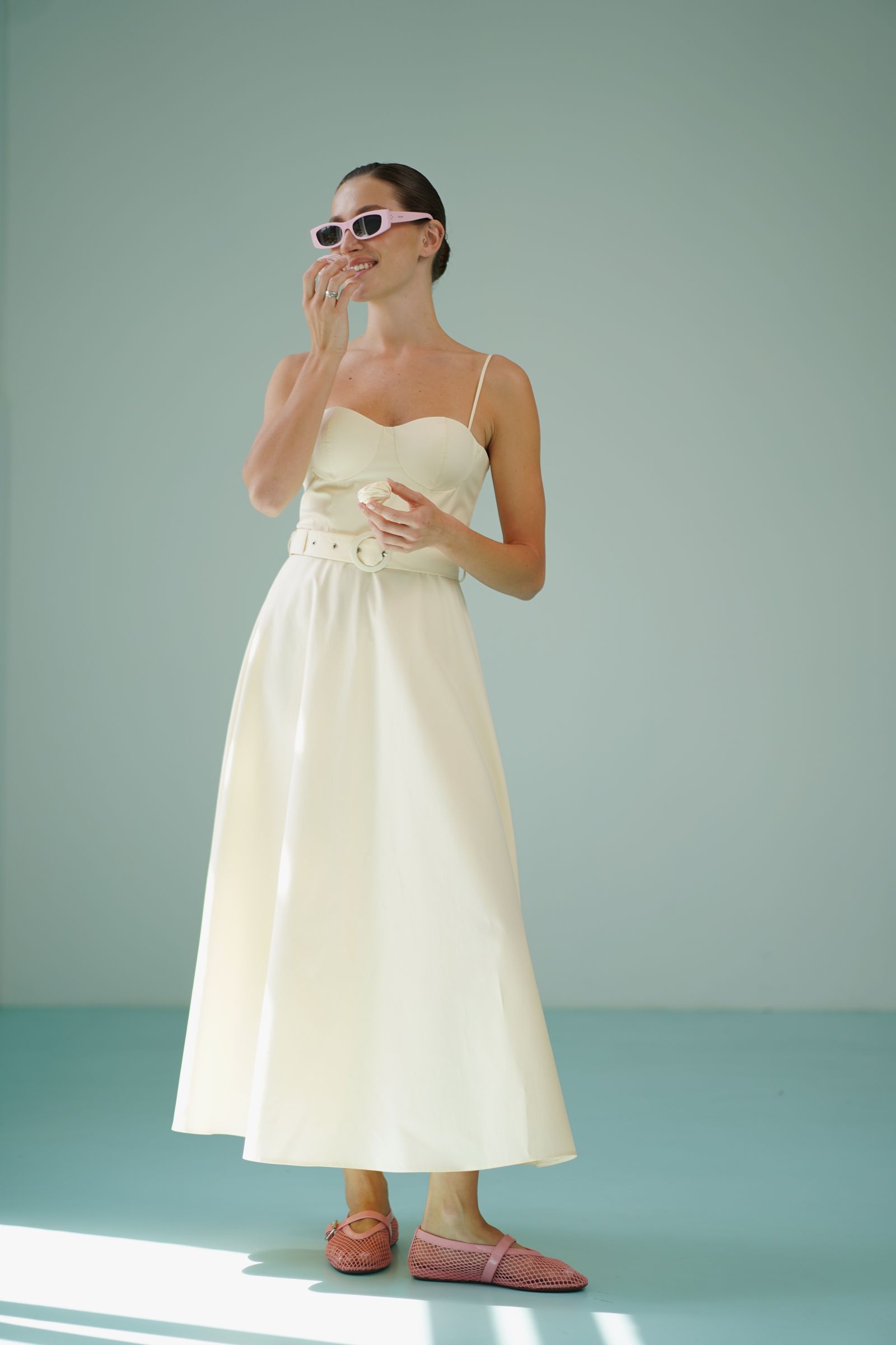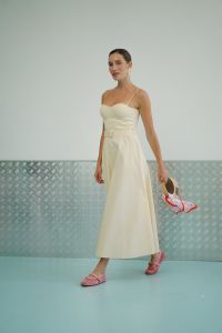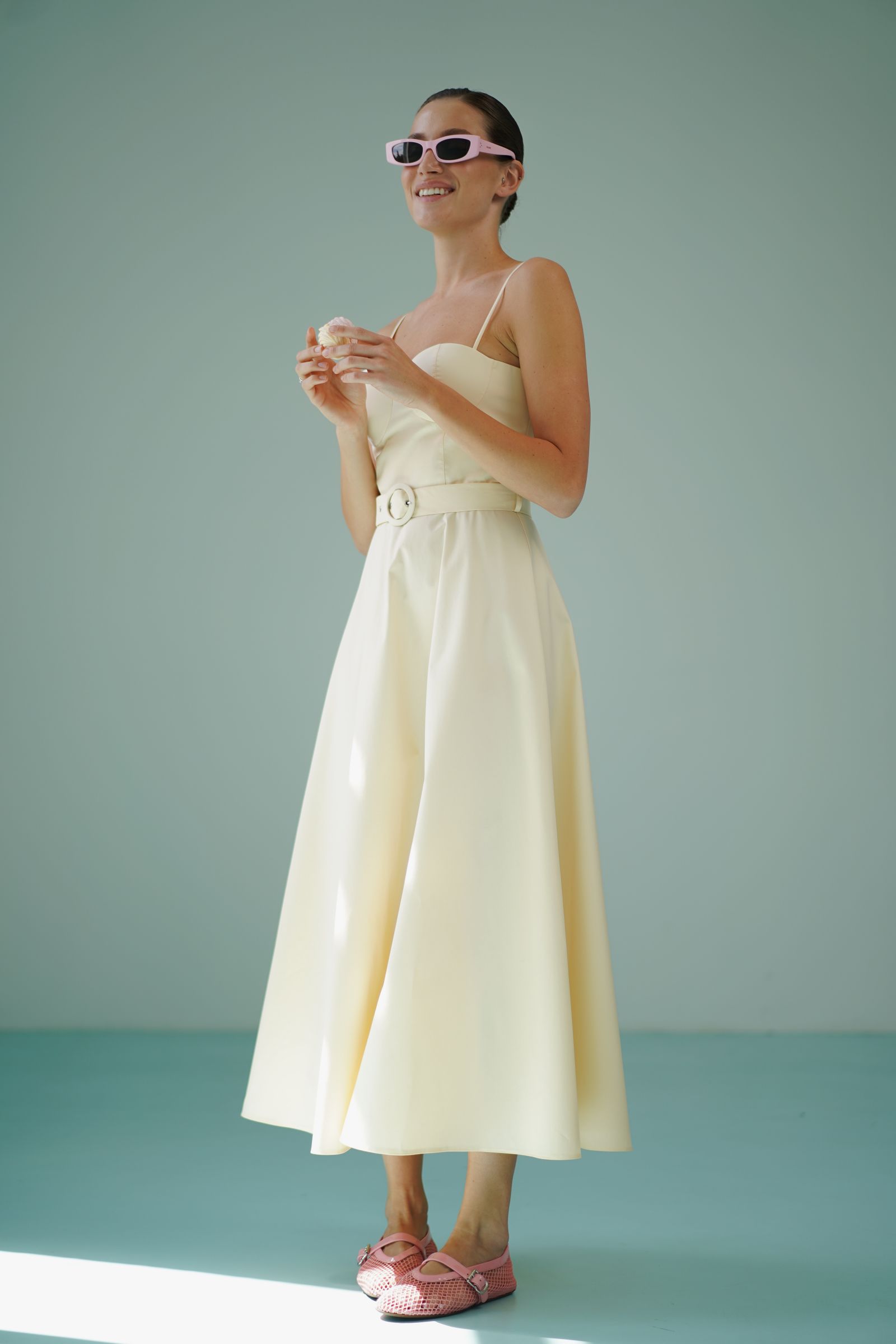 Елегантна сукня міді поєднує в собі жіночність і лаконічний дизайн. Корсетний верх із чашками красиво підкреслює лінію декольте, а тонкі бретелі додають образу легкості та витонченості. Акцентний пояс із пряжкою формує талію та створює гармонійний силует. Розкльошена спідниця довжини міді плавно рухається при ході, забезпечуючи комфорт і елегантність. Сукня ідеально підійде для літніх прогулянок, святкових подій, вечерь або відпустки.