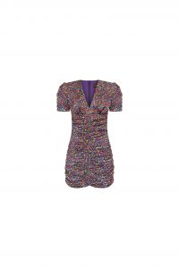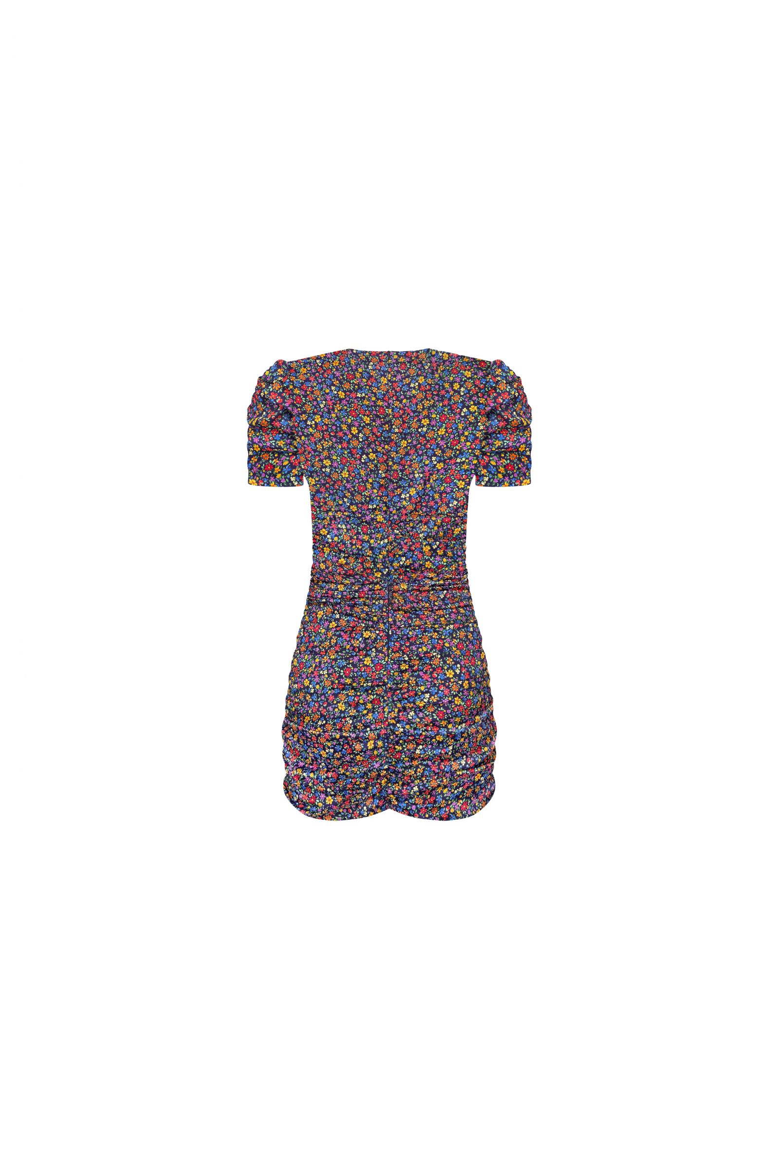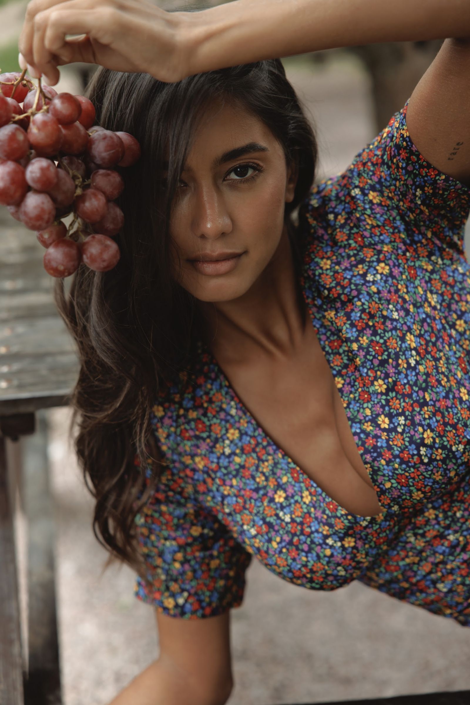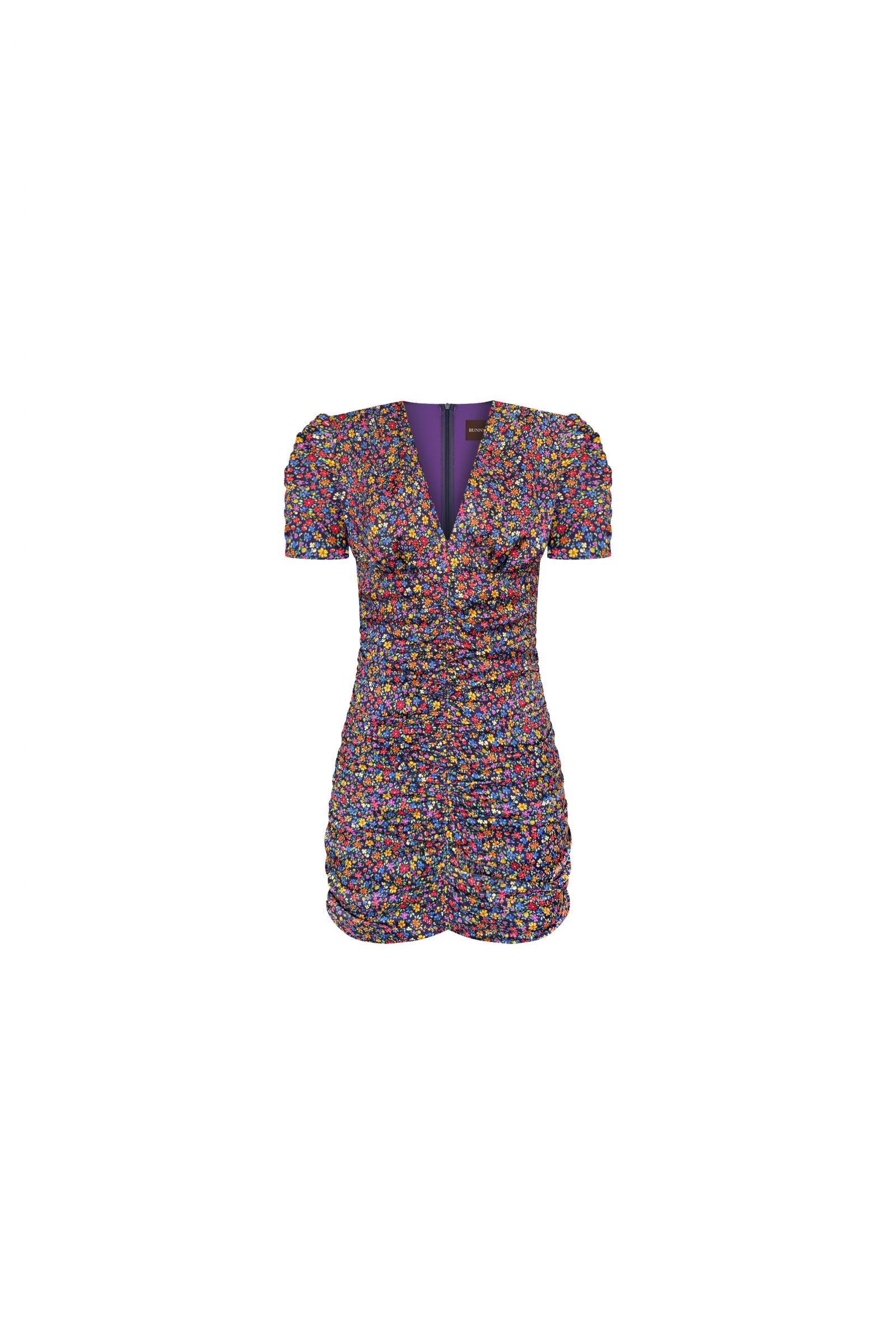 Ефектна сукня приталеного силуету з яскравим квітковим принтом створена для акцентних образів. V-подібний виріз красиво підкреслює декольте, а драпірування по всій довжині моделює фігуру, додаючи силуету витонченості. Короткі рукави з легким об’ємом додають романтичного настрою. Ідеальний варіант для літніх прогулянок, побачень або святкових подій. Сукня, яка не потребує зайвих акцентів - достатньо улюблених туфель або босоніжок.