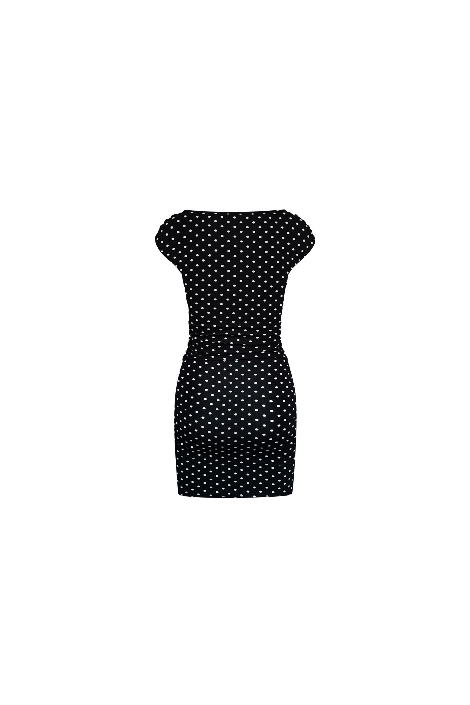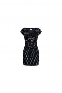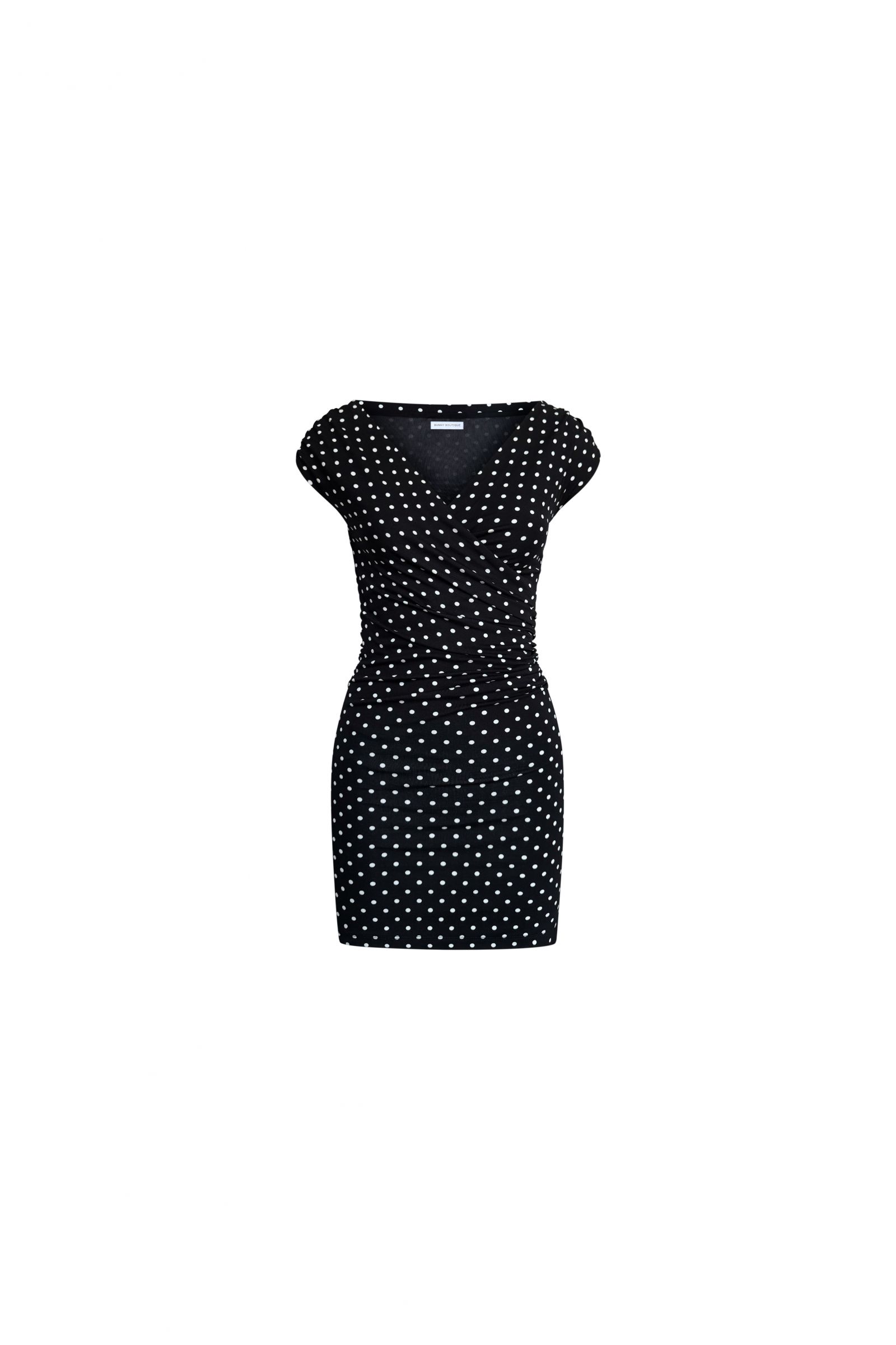 Жіночна сукня приталеного силуету з класичним принтом у горох красиво підкреслює фігуру, створюючи витончений та елегантний образ. V-подібний виріз акцентує лінію декольте, а короткий рукав додає легкості. Еластичний матеріал добре сідає по фігурі, не сковує рухів і забезпечує комфорт протягом усього дня. Ідеальний варіант для побачень, вечірок або стильних повсякденних виходів. Легко поєднується з босоніжками, туфлями або балетками.