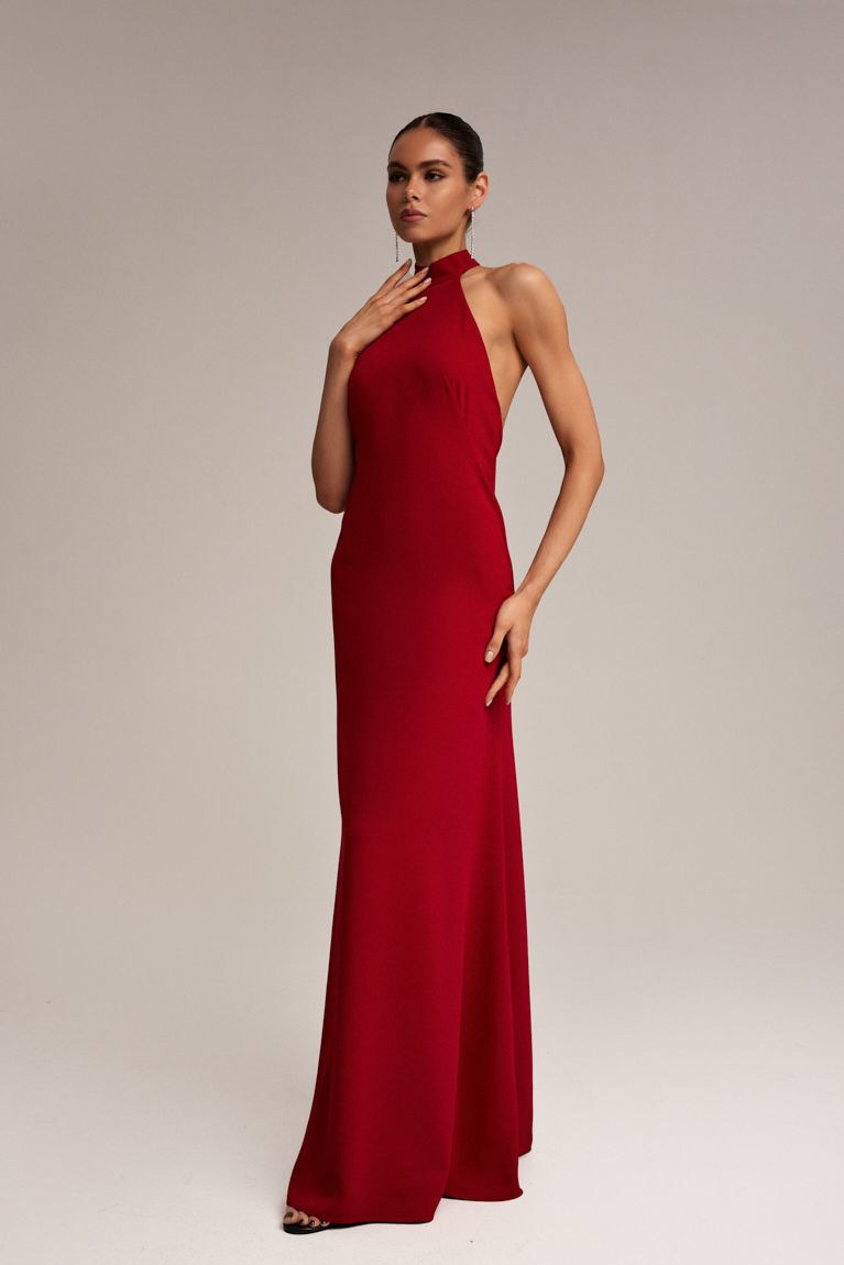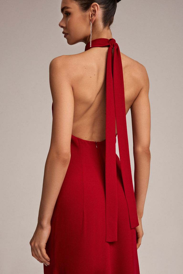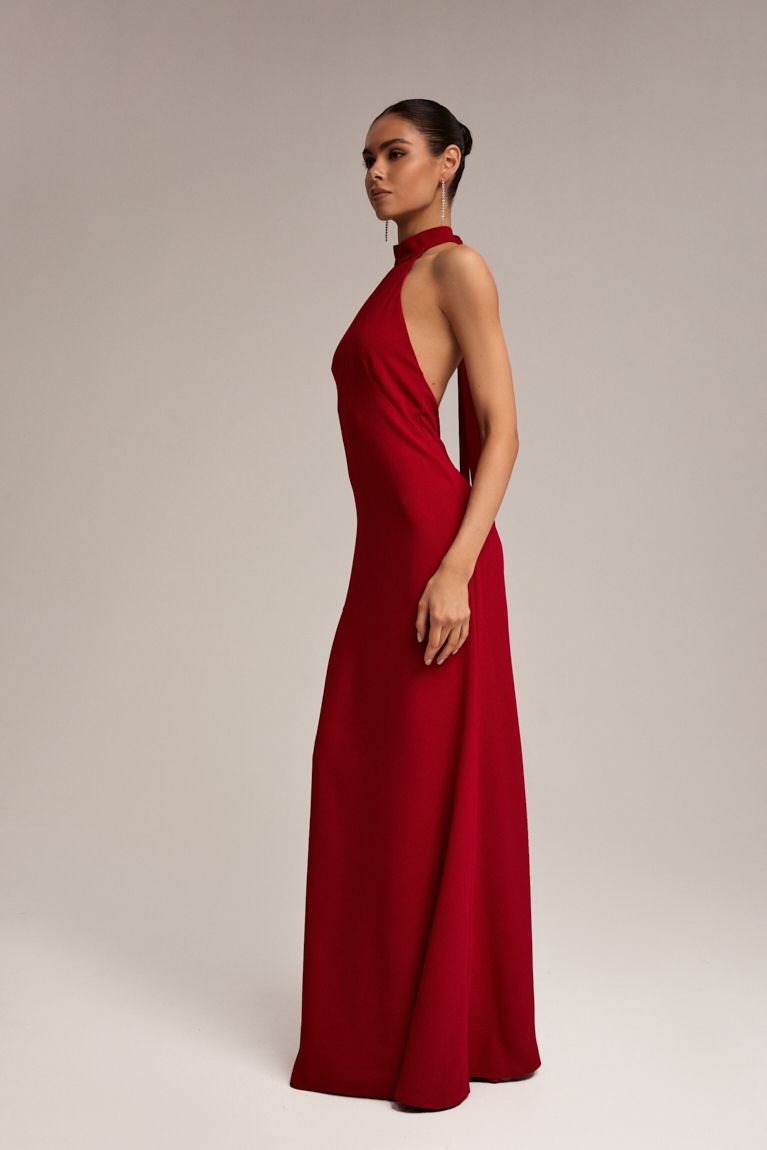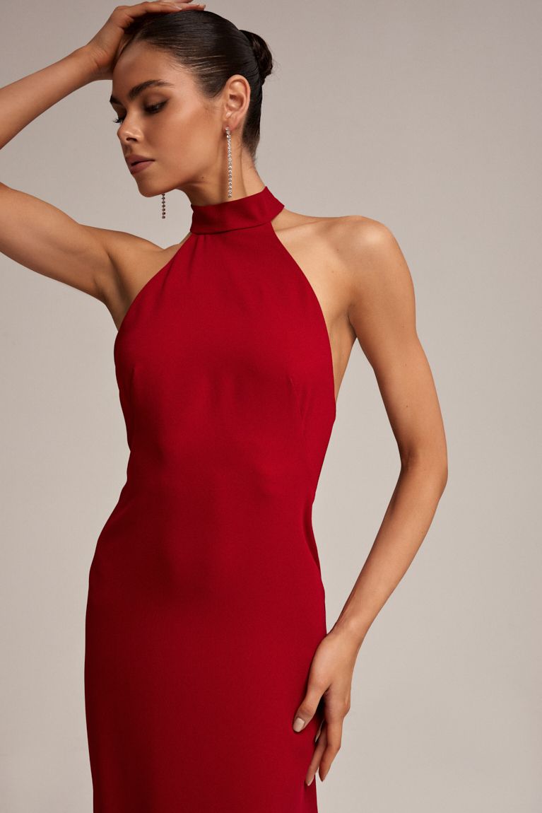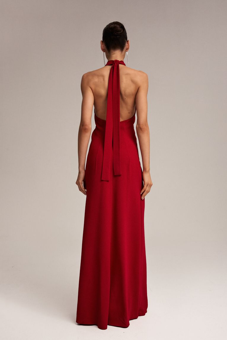 Ця вишукана вечірня сукня максі, яка підкреслює жіночність і чарівність. Сукня створена з відкритою спинкою, що додає образу нотку елегантної сексуальності. Позаду зав’язується на шиї, утворюючи витончений виріз «холтер», який акцентує увагу на лінії плечей і шиї. Виготовлена з тонкого крепу, що м’яко драпірується, забезпечуючи легкість та комфорт. Фасон сукні вузького силуету, який плавно огортає тіло, створюючи вражаючий образ. Довжина максі - це ідеальна довжина для вечірніх заходів або урочистих подій. Ця сукня стане центром уваги на будь-якій вечірці, дозволяючи виглядати стильно і розкішно.