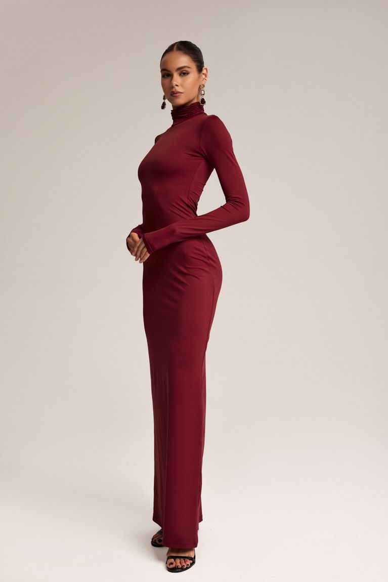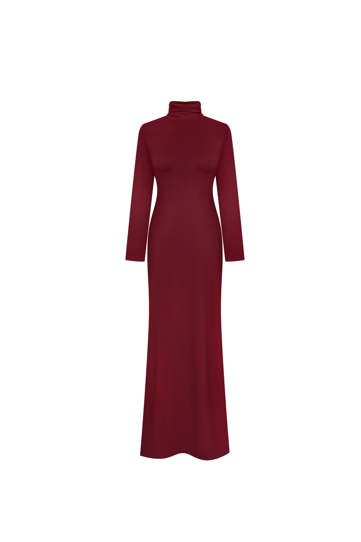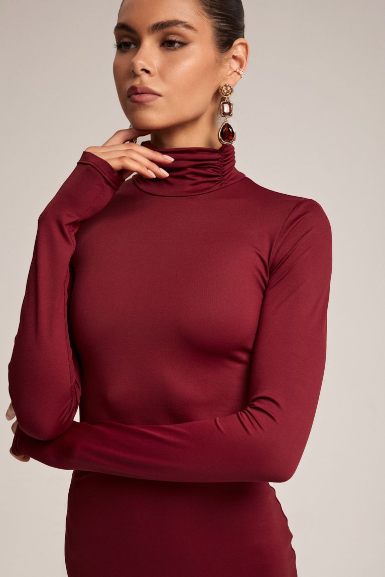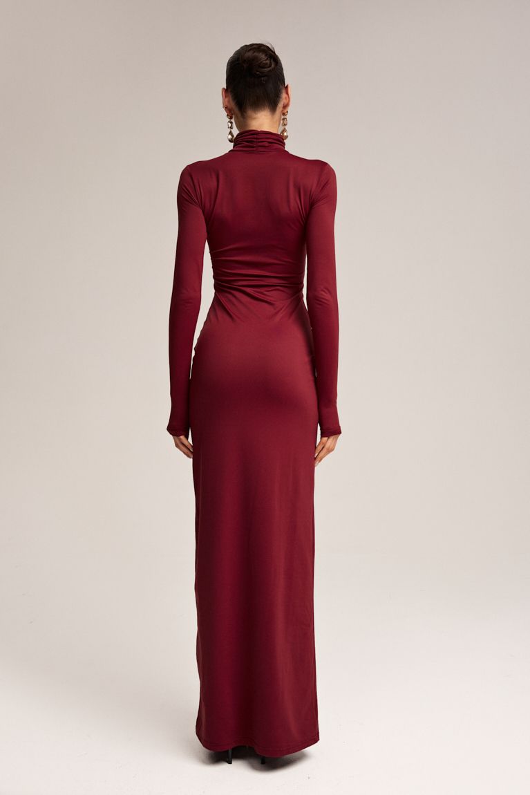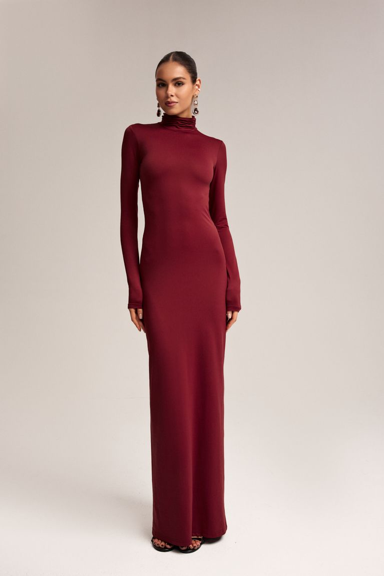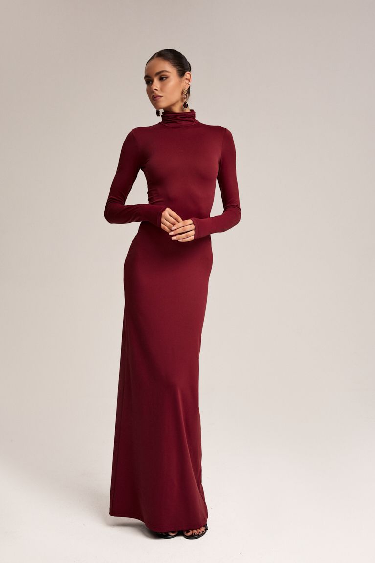 Ця вишукана новорічна сукня в кольорі бургунді поєднує елегантність та мінімалізм. Сукня виконанана в довжині максі, яка чудово сідає по фігурі, підкреслюючи жіночність і створюючи стильний силует. Довгі рукави додають стриманості та витонченості. Висока горловина з драпіруванням виглядає благородно та акцентує увагу на зоні декольте. Облягаючий текстиль м’яко повторює контури тіла, забезпечуючи комфорт і впевненість. Глибокий колір бордо ідеально підходить для святкової атмосфери, додаючи образу розкішності. Цей вибір стане бездоганним для новорічного вечора або урочистого заходу.