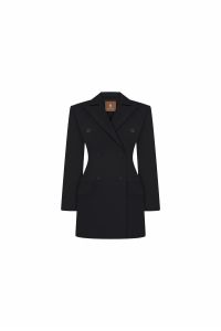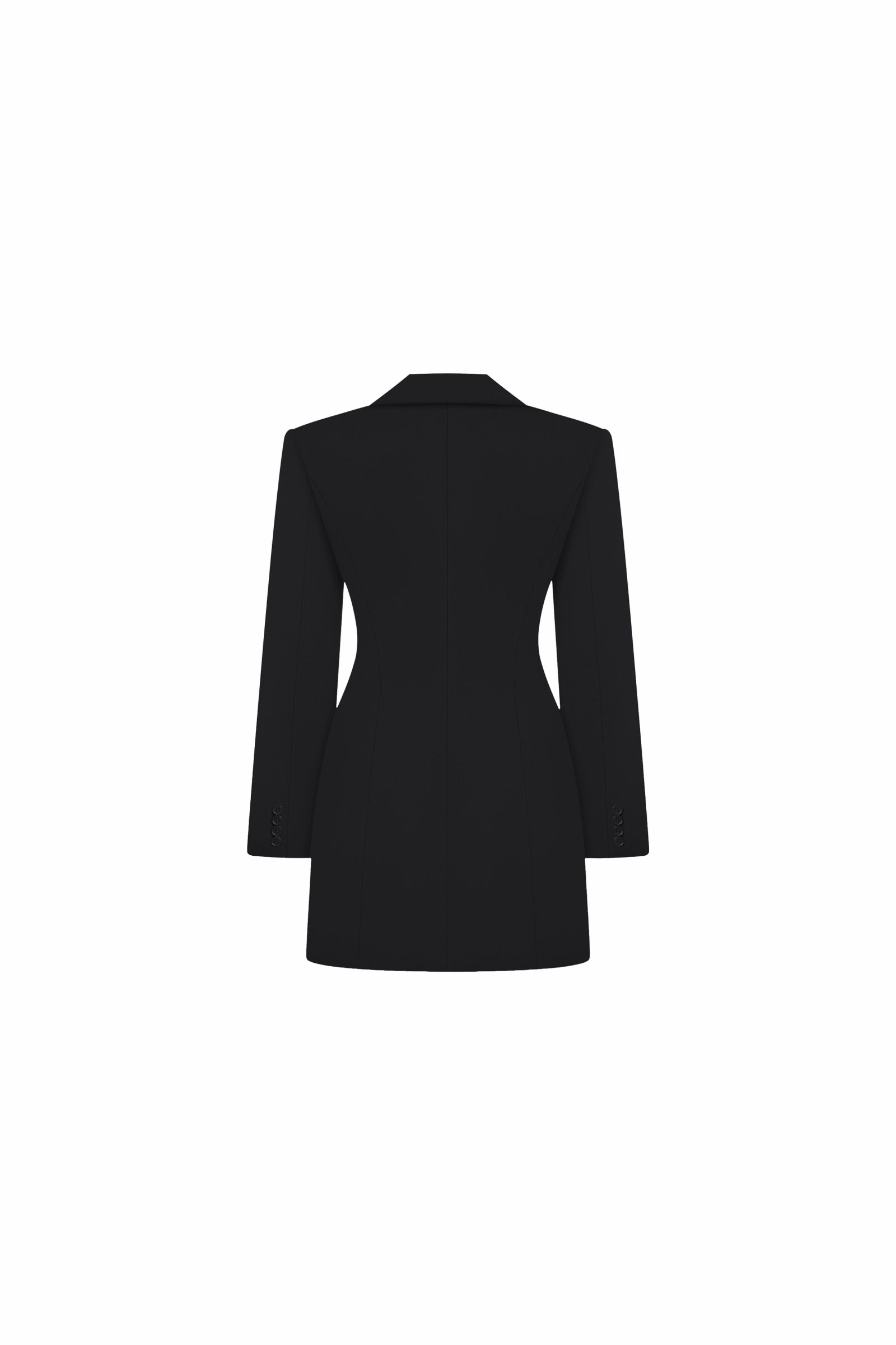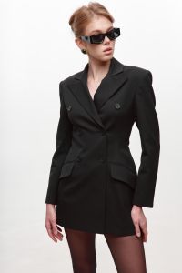 Сукня-жакет Diora у класичному чорному кольорі створена для тих, хто цінує поєднання строгої елегантності та сучасної жіночності. Подовжений силует із чітко окресленою лінією талії формує вишукану, витончену фігуру, а двобортна застібка на акуратні ґудзики додає образу стриманого шику. Сукня оснащена структурованими плечима, які надають образу впевненості та чіткості, та має функціональні клапани кишень, що підкреслюють естетику класичного жакета. Гладка тканина гарно тримає форму й виглядає преміально під будь-яким освітленням. Ідеальний вибір для вечірніх подій, ділових зустрічей або стильних виходів - універсальна річ, яка завжди виглядає бездоганно.