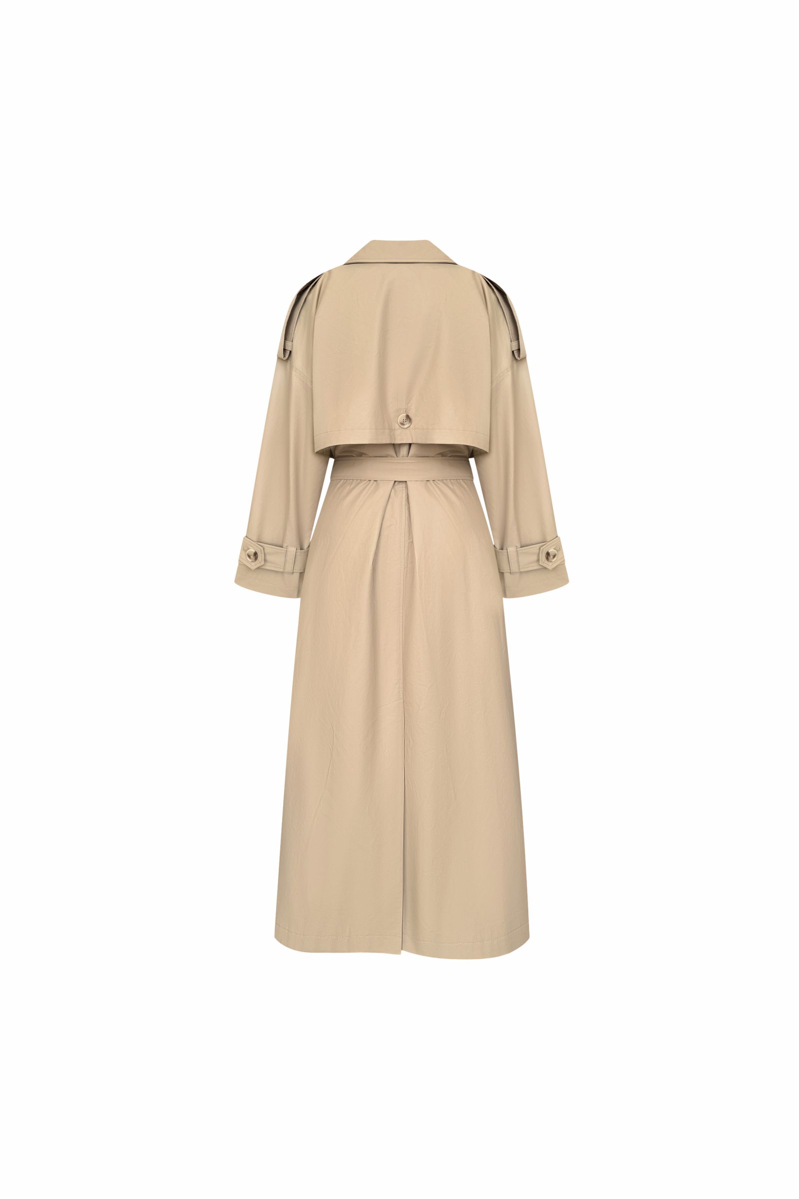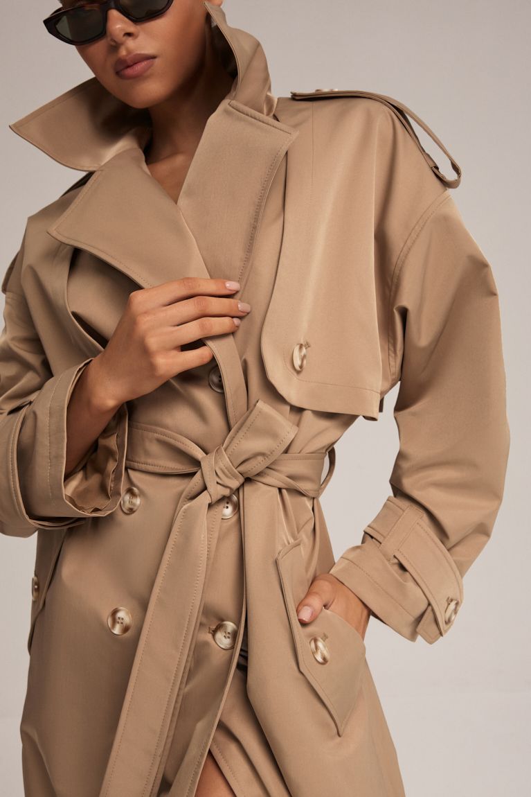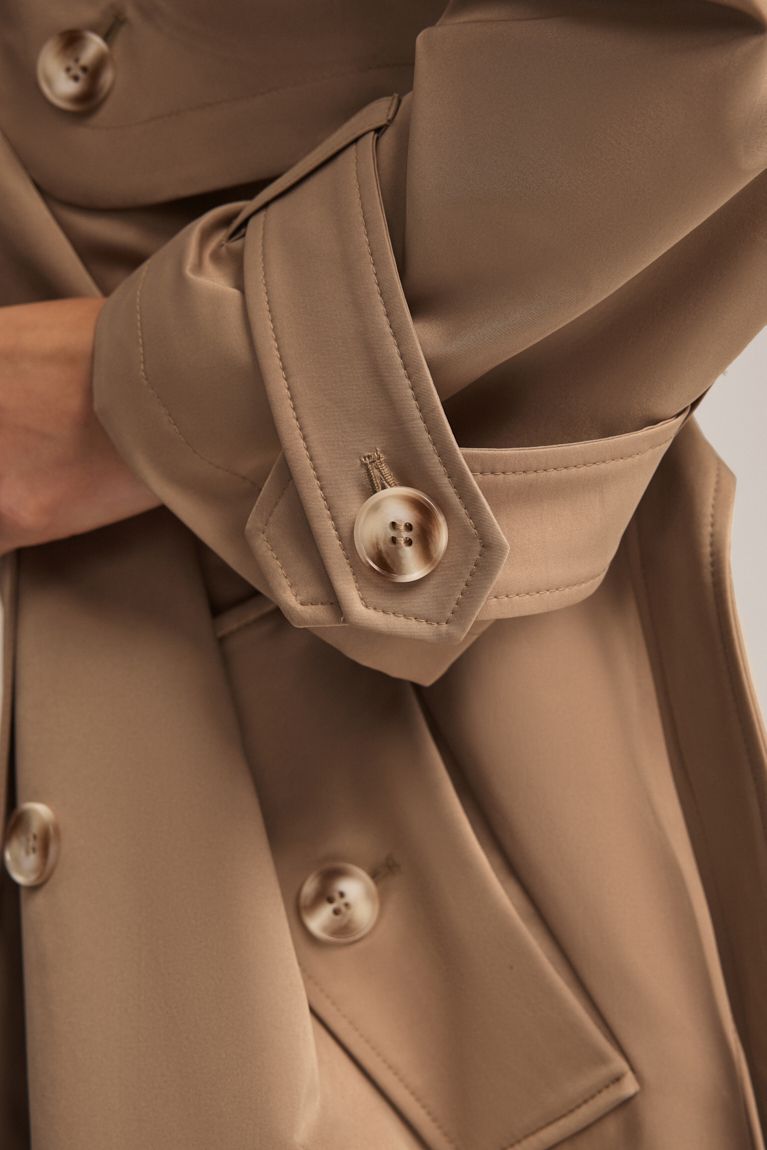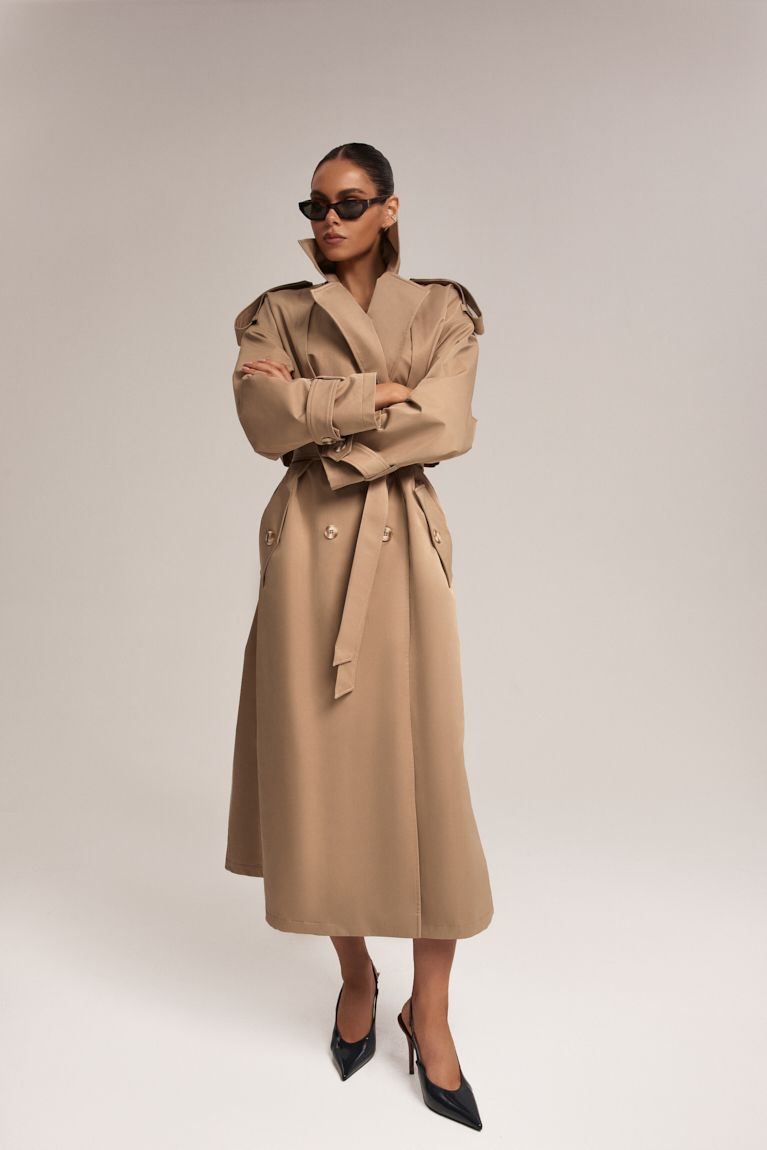 Цей тренч - символ елегантності та витонченого стилю. Він виконаний у подовженому силуеті, що надає образу стриманості й водночас підкреслює жіночність. Подвійний ряд ґудзиків додає виразності та створює класичний акцент. Пояс на талії дозволяє регулювати посадку та формує витончену силуетну лінію. Погони на плечах та манжети з пряжками на рукавах підкреслюють традиційну естетику тренчу. Клапан на грудях і спинці не лише зберігає автентичність крою, а й додає легкості рухам. Виріб має глибокі кишені з клапанами, що поєднують практичність і стиль. Цей тренч - ідеальне доповнення до базового гардероба, яке пасуватиме як до ділових луків, так і до повсякденних образів. Його вишукана простота та увага до деталей роблять його must-have сезону.