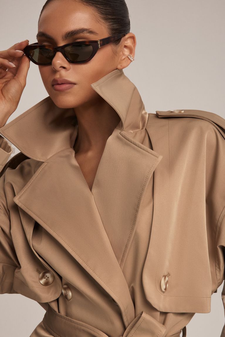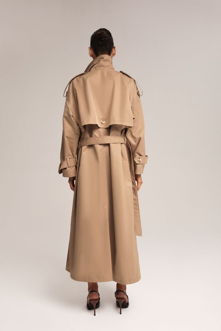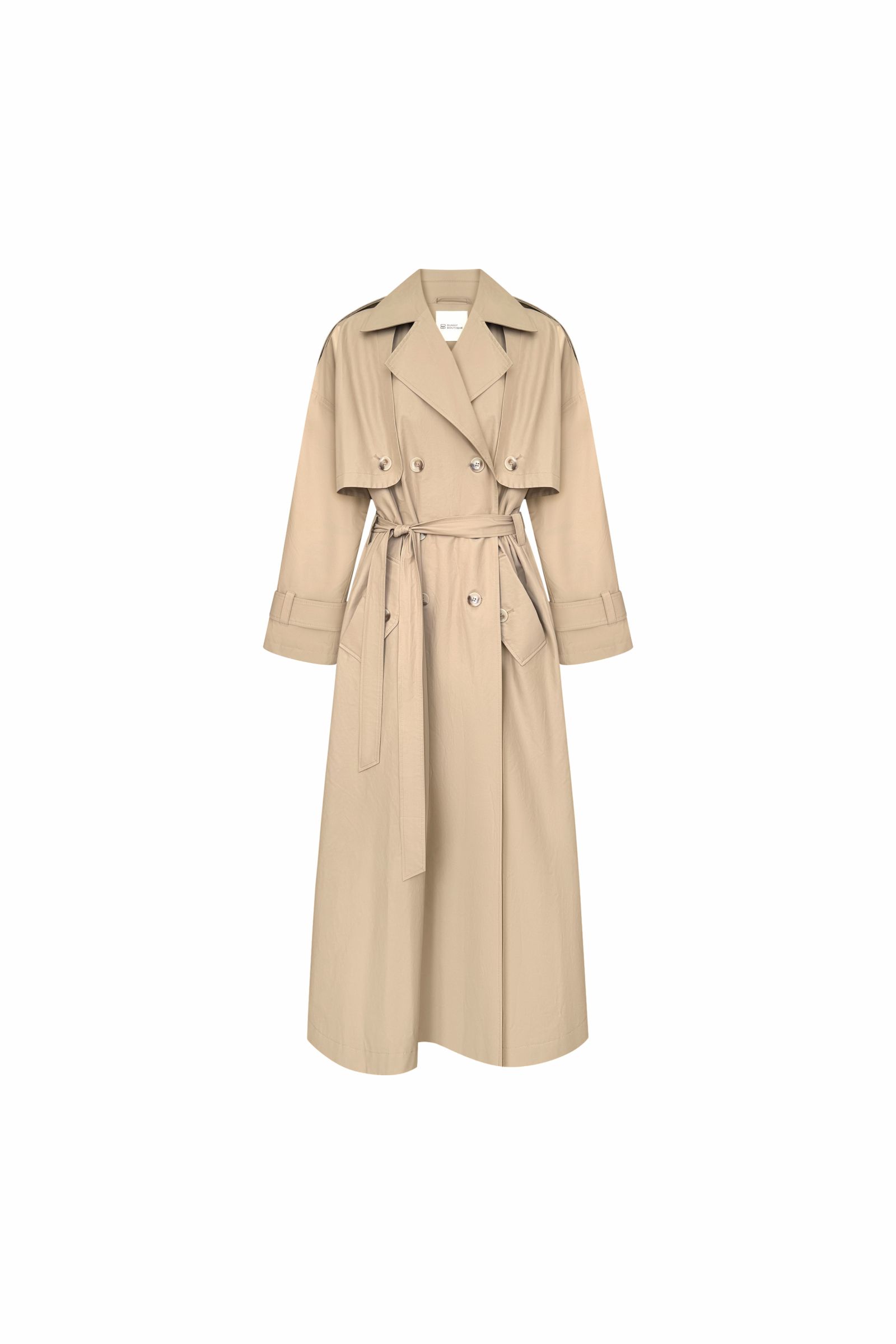 Цей тренч - символ елегантності та витонченого стилю. Він виконаний у подовженому силуеті, що надає образу стриманості й водночас підкреслює жіночність. Подвійний ряд ґудзиків додає виразності та створює класичний акцент. Пояс на талії дозволяє регулювати посадку та формує витончену силуетну лінію. Погони на плечах та манжети з пряжками на рукавах підкреслюють традиційну естетику тренчу. Клапан на грудях і спинці не лише зберігає автентичність крою, а й додає легкості рухам. Виріб має глибокі кишені з клапанами, що поєднують практичність і стиль. Цей тренч - ідеальне доповнення до базового гардероба, яке пасуватиме як до ділових луків, так і до повсякденних образів. Його вишукана простота та увага до деталей роблять його must-have сезону.