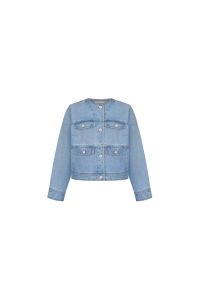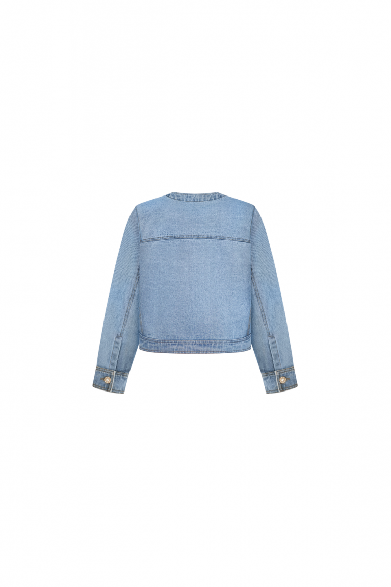 Цей джинсовий жакет — сучасна інтерпретація класики. Виконаний із щільного бавовняного деніму світло-блакитного відтінку, він поєднує лаконічність силуету з продуманими деталями. Пряма лінія плечей, відсутність класичного коміра та геометричні шви на грудях створюють ефект структурованості та візуально подовжують фігуру. Чотири накладні кишені з клапанами й металевими ґудзиками додають жакету виразності та функціональності. Контрастна строчка підкреслює лінії крою, а укорочена довжина гармонійно поєднується з високою талією — ідеальне рішення для стилізації з джинсами, спідницями або сукнями.