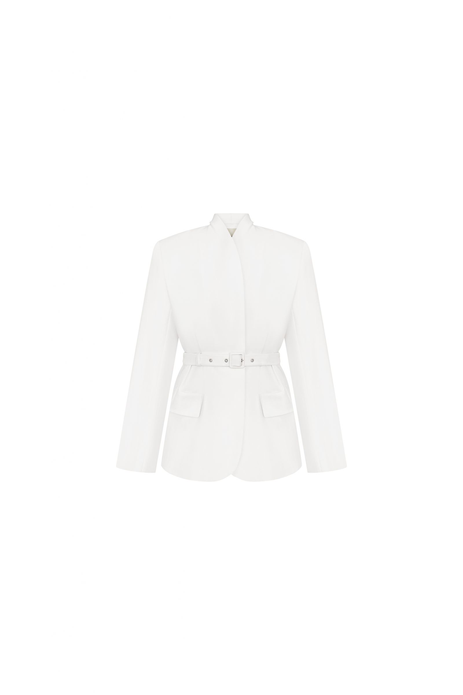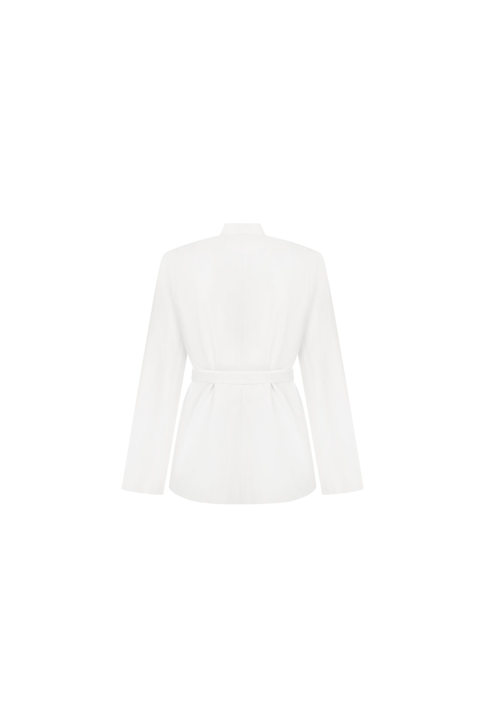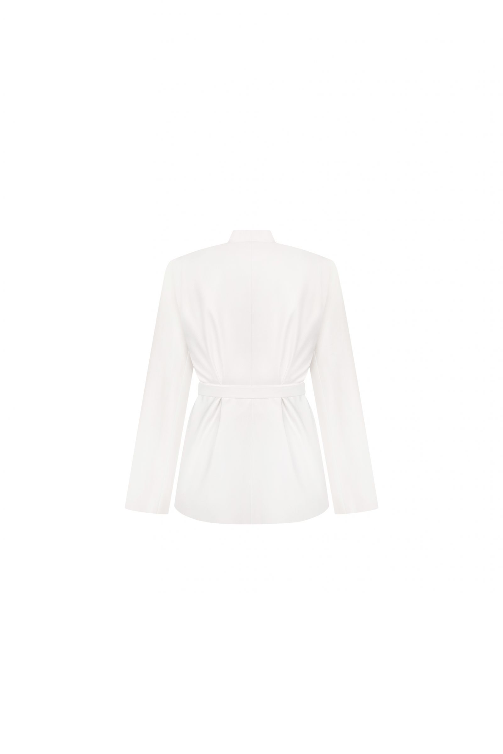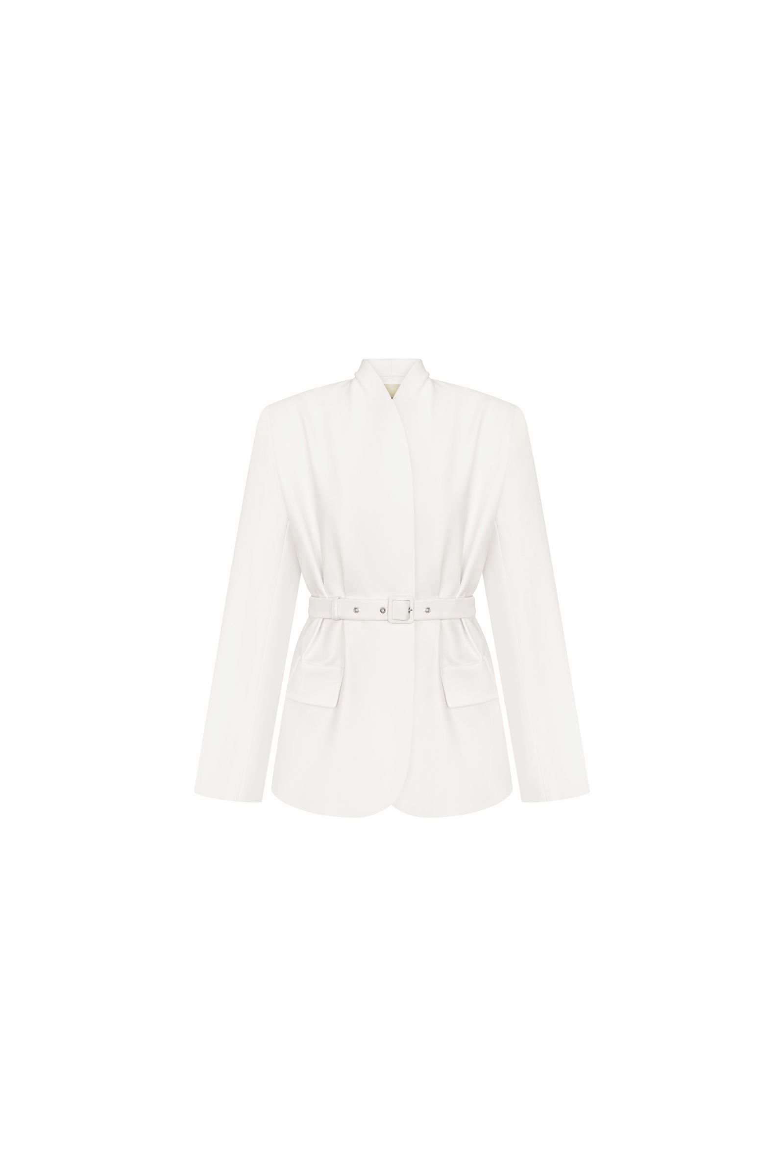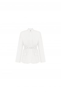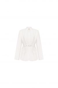 Елегантний подовжений жакет у білому відтінку - універсальна база для стильних образів у будь-який сезон. Модель має лаконічний крій без коміра з акуратною стійкою, що додає мінімалістичності та сучасного характеру. Пояс із пряжкою підкреслює талію та дозволяє регулювати посадку, створюючи жіночний силует. Ідеально поєднується як із класичними брюками чи спідницею, так і з джинсами для більш розслабленого образу. Підійде для офісу, подій або стильних повсякденних луків.