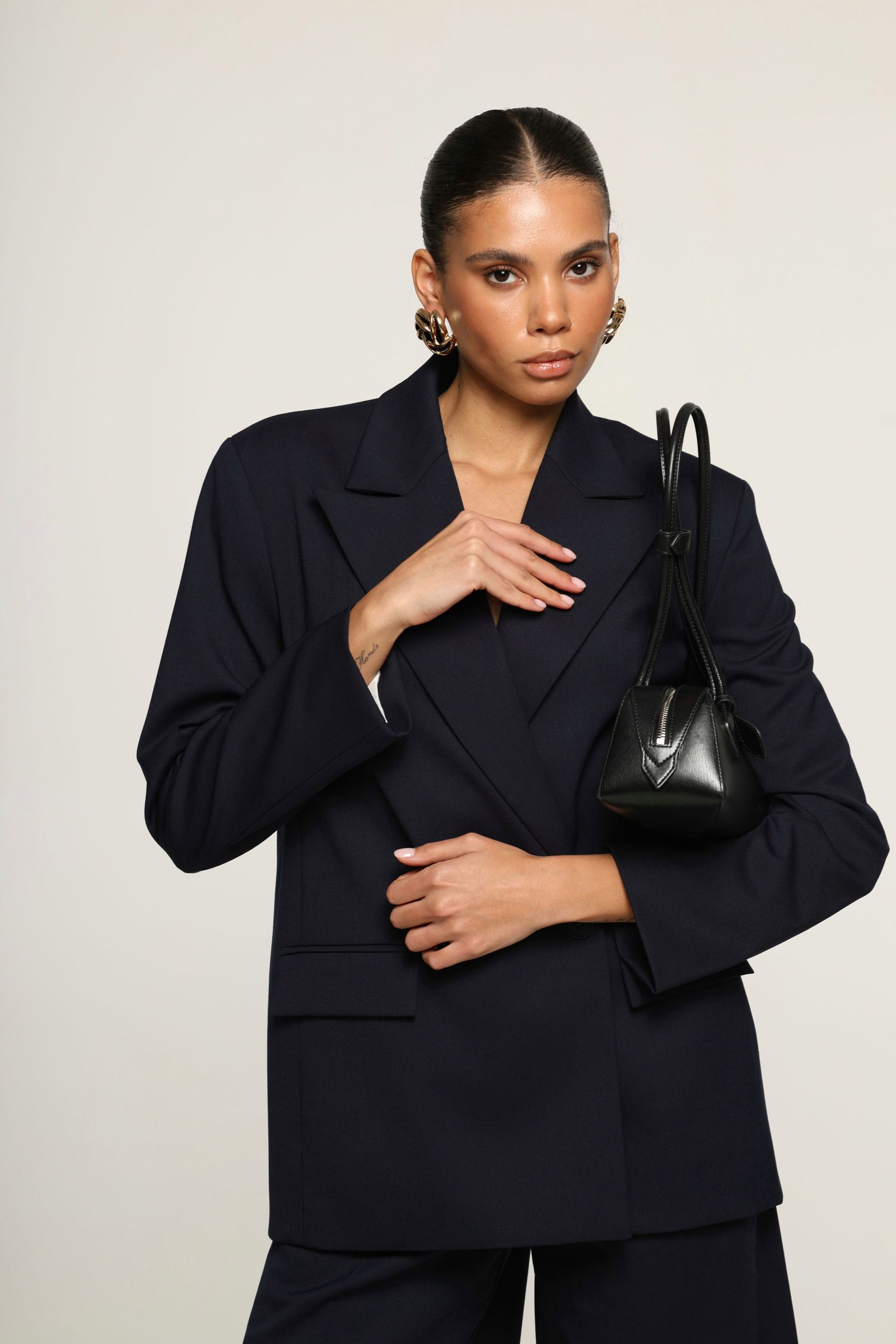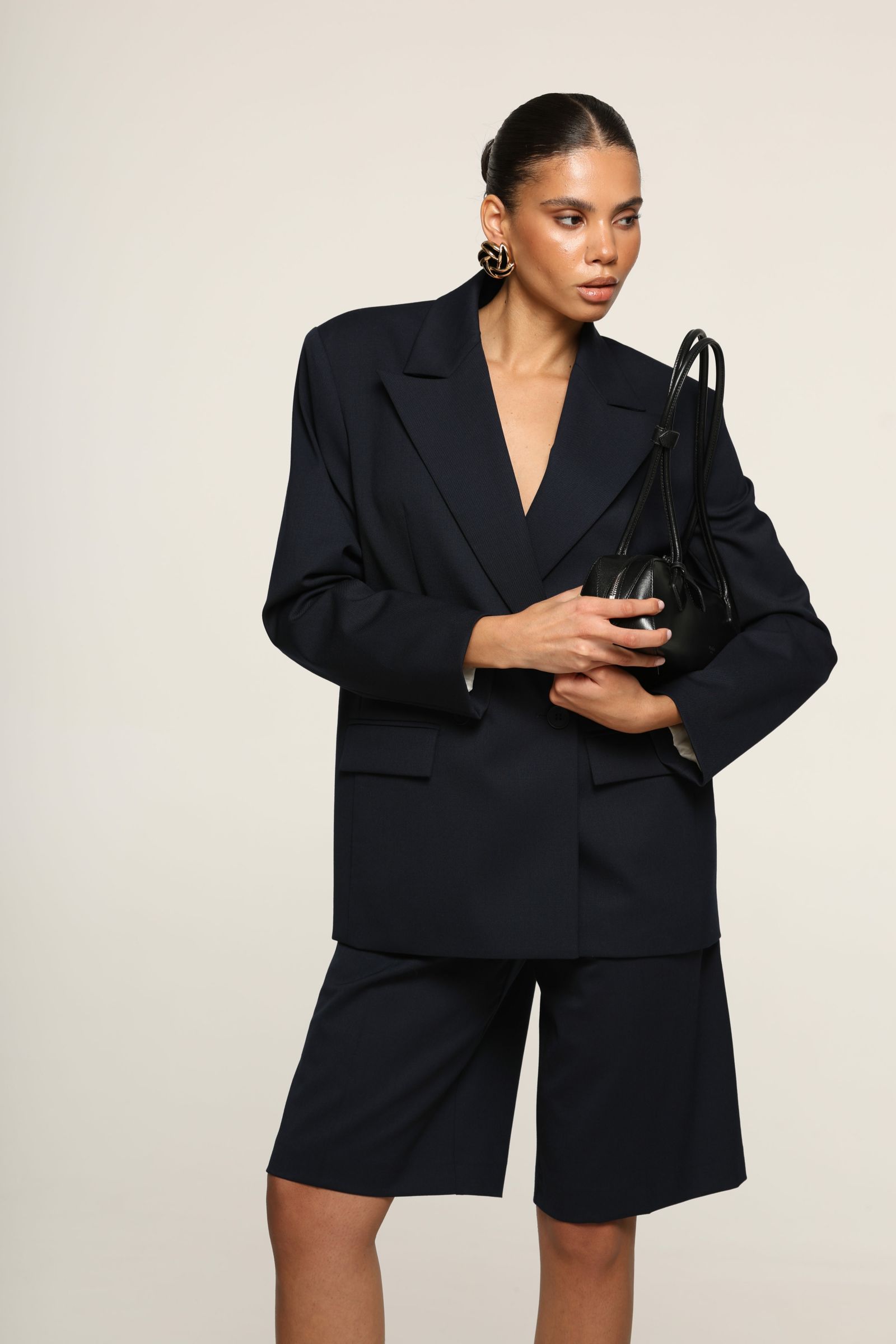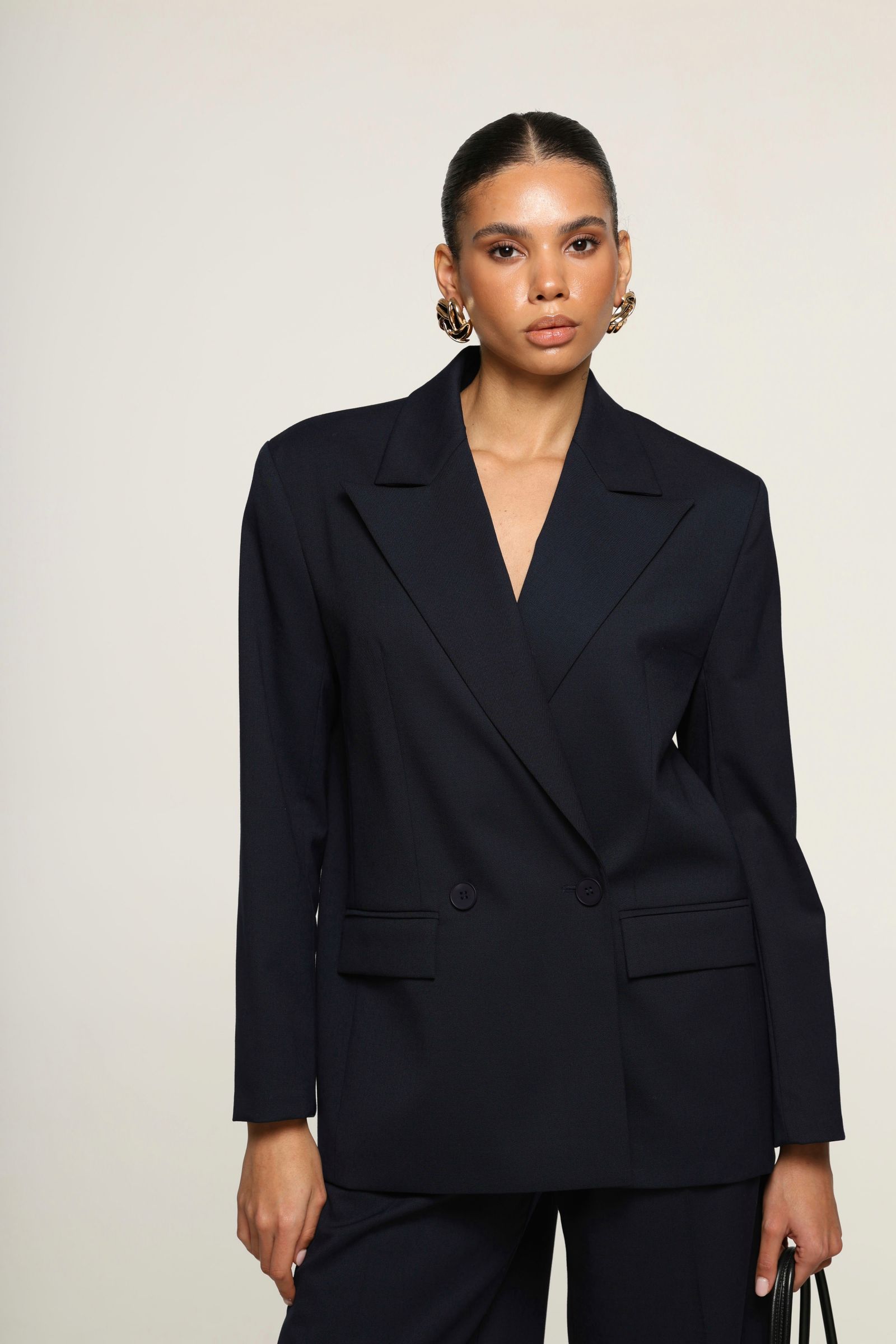 Цей жакет у благородному темно-синьому відтінку, в універсальному розмірі стане вашою улюбленою базовою річчю для створення елегантних та повсякденних образів. Класичний крій з акцентом на плечі, широкі лацкани і двобортна застібка додають модного об’єму та структури силуету. Жакет чудово виглядає як у ділових ансамблях, так і в поєднанні з більш розслабленим одягом.