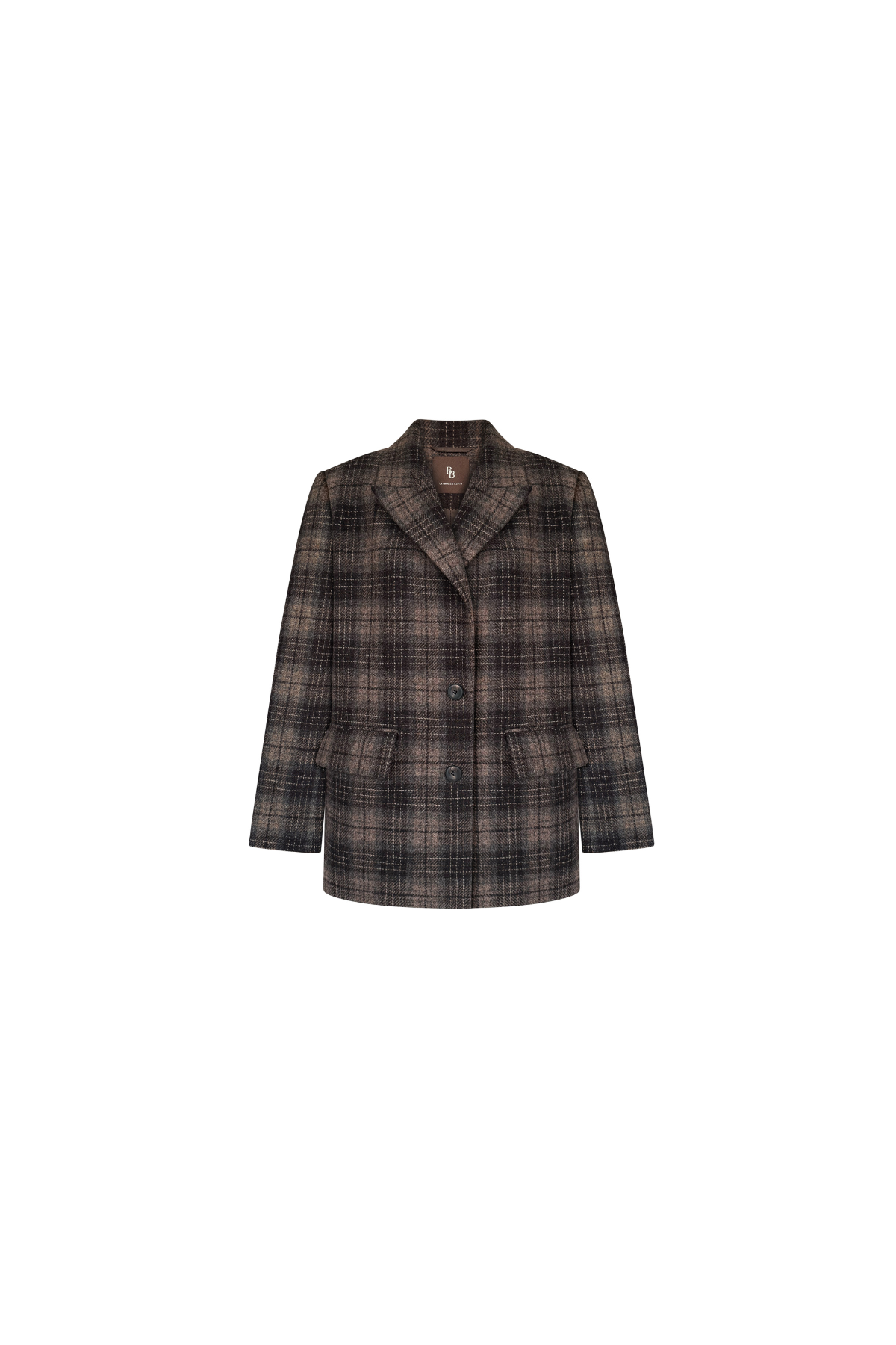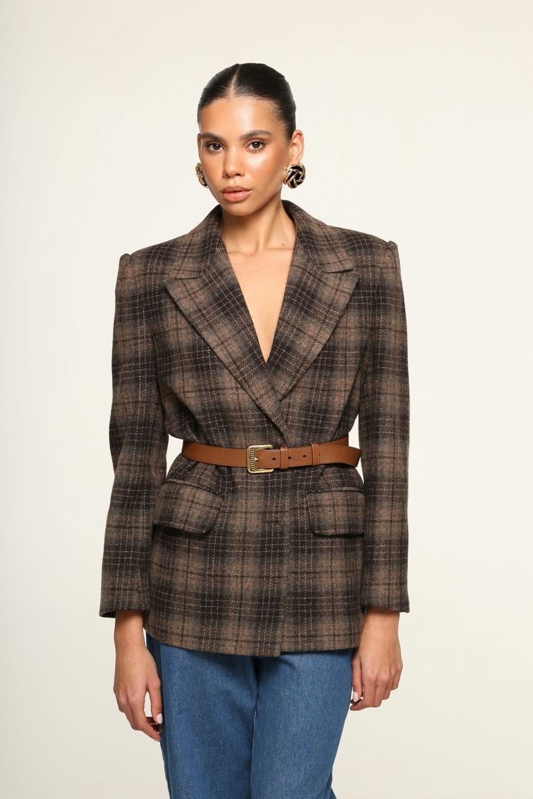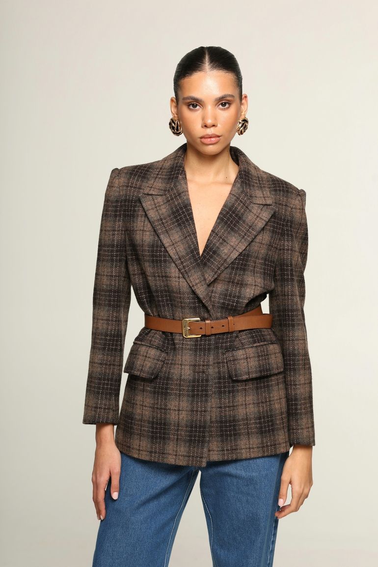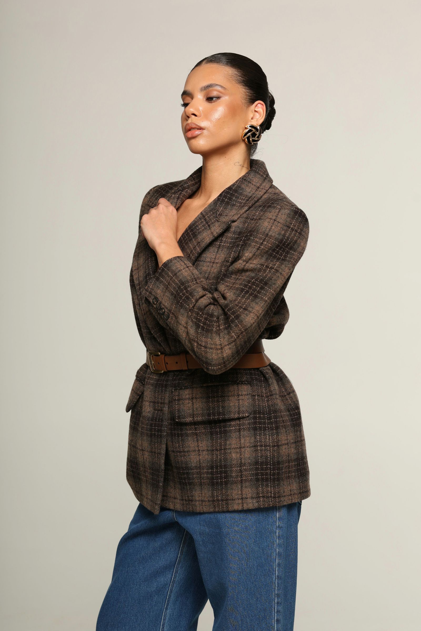Елегантний вовняний жакет, створений для тих, хто цінує вишукану класику та довговічність натуральних матеріалів. Виготовлений зі 100% високоякісної вовни, він має виразну м’яку текстуру та характерний теплий відтінок у картатому візерунку, що додає образу глибини та шарму. Продуманий крій акцентує силует: широкі лацкани створюють сильну лінію плечей, а пояс із натуральної шкіри підкреслює талію, формуючи витончену та структуровану посадку. Дві накладні кишені з клапанами додають практичності та вишуканості, а ретельно продумана довжина робить жакет універсальним — він чудово поєднується як із класичними брюками, так і з джинсами. Цей жакет — інвестиція в гардероб, що поєднує тепло, елегантність і бездоганний стиль. Ідеальний вибір для осінньо-зимового сезону та образів, де важливі деталі говорять самі за себе.
