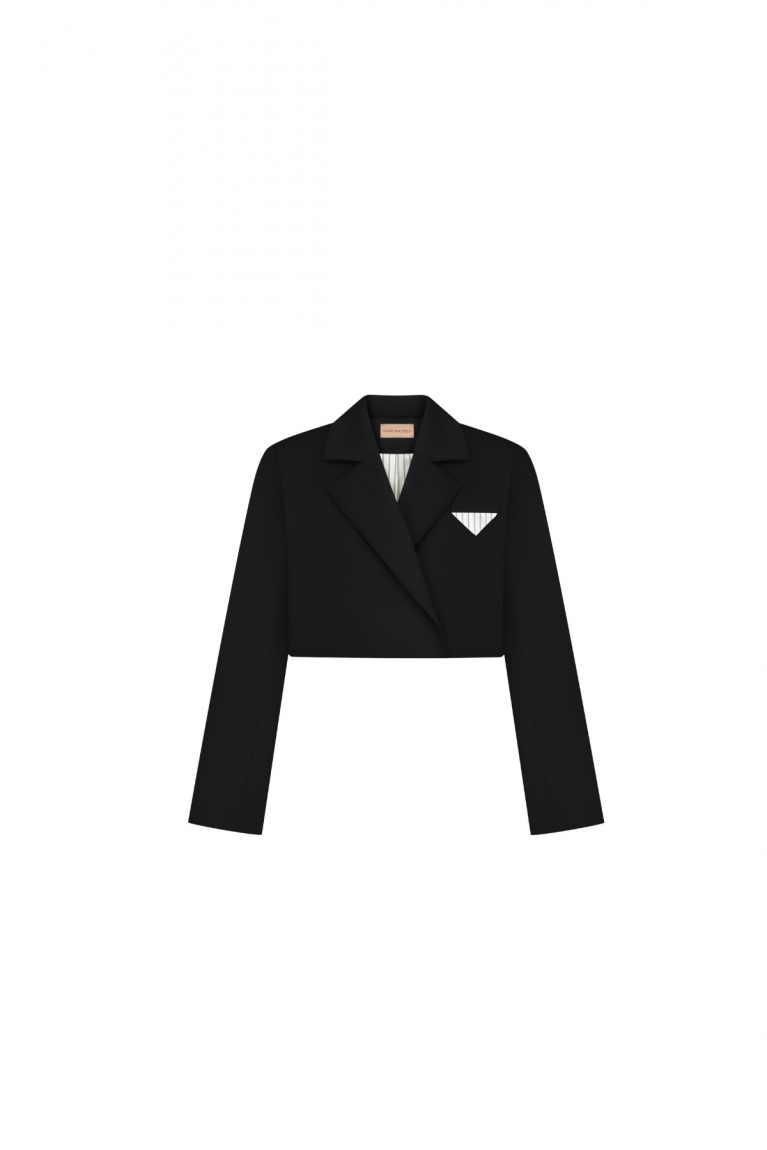 Вкорочений жакет, що має глибокий виріз, та довгі рукава, які можна підвернути і він вже буде виглядати стильно. На грудях жакет має акцентний декоративний клапан з білої тканини в смужку, що додає індивідуальності в образі. Цей жакет чудово поєднується з нашею міні-спідницею плісе, штанами Classic та спідницею mini, що зробить ваш образ більш вражаючим!
