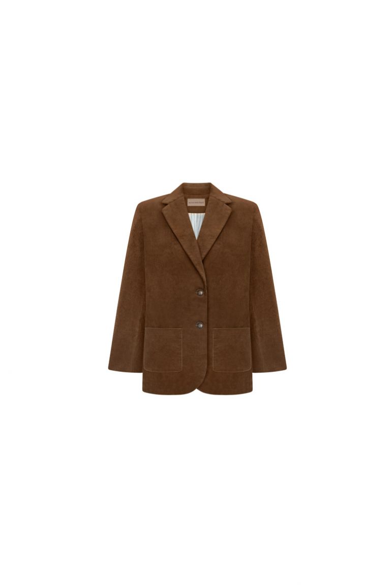 Цей жакет виконаний в класичному стилі з вельвету, однобортний, з акуратним кроєм, що додає образу елегантності. Він має накладні кишені, які додають йому практичності та модного акценту. Теплий коричневий відтінок підкреслює осінньо-зимовий настрій, роблячи його ідеальним вибором для прохолодної пори року. Широкі лацкани та текстура вельвету додають виробу стилю та винятковості.