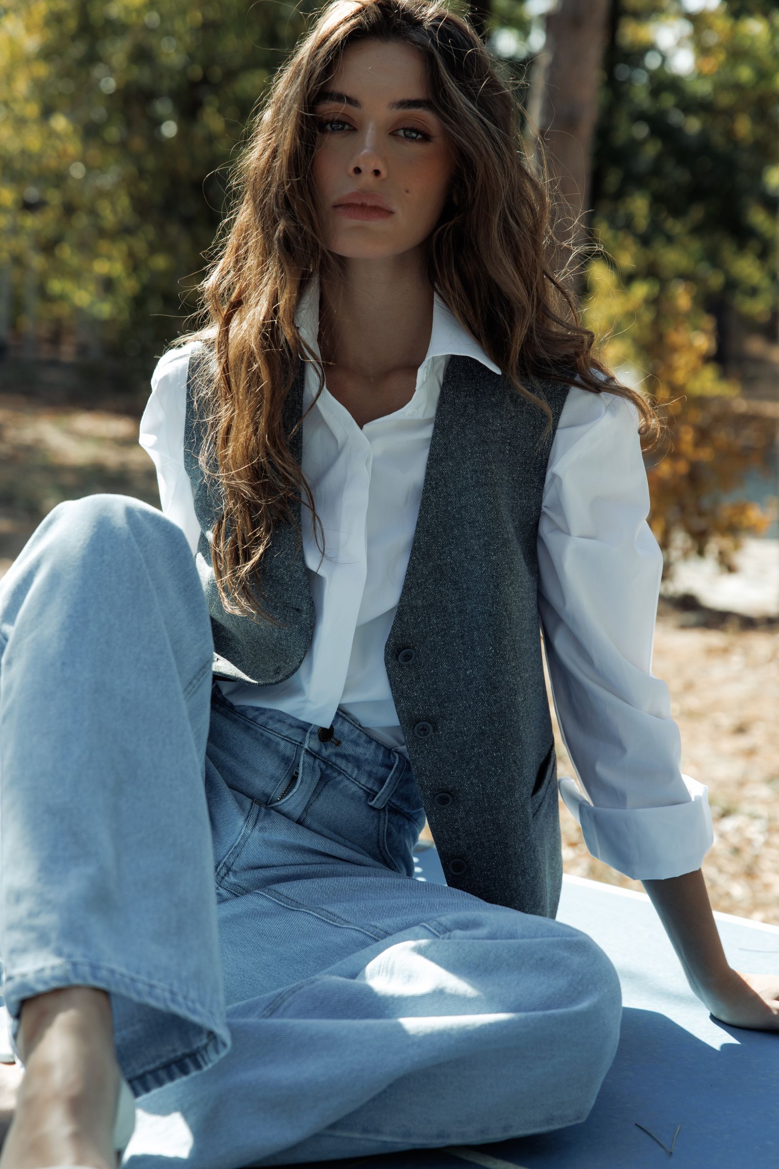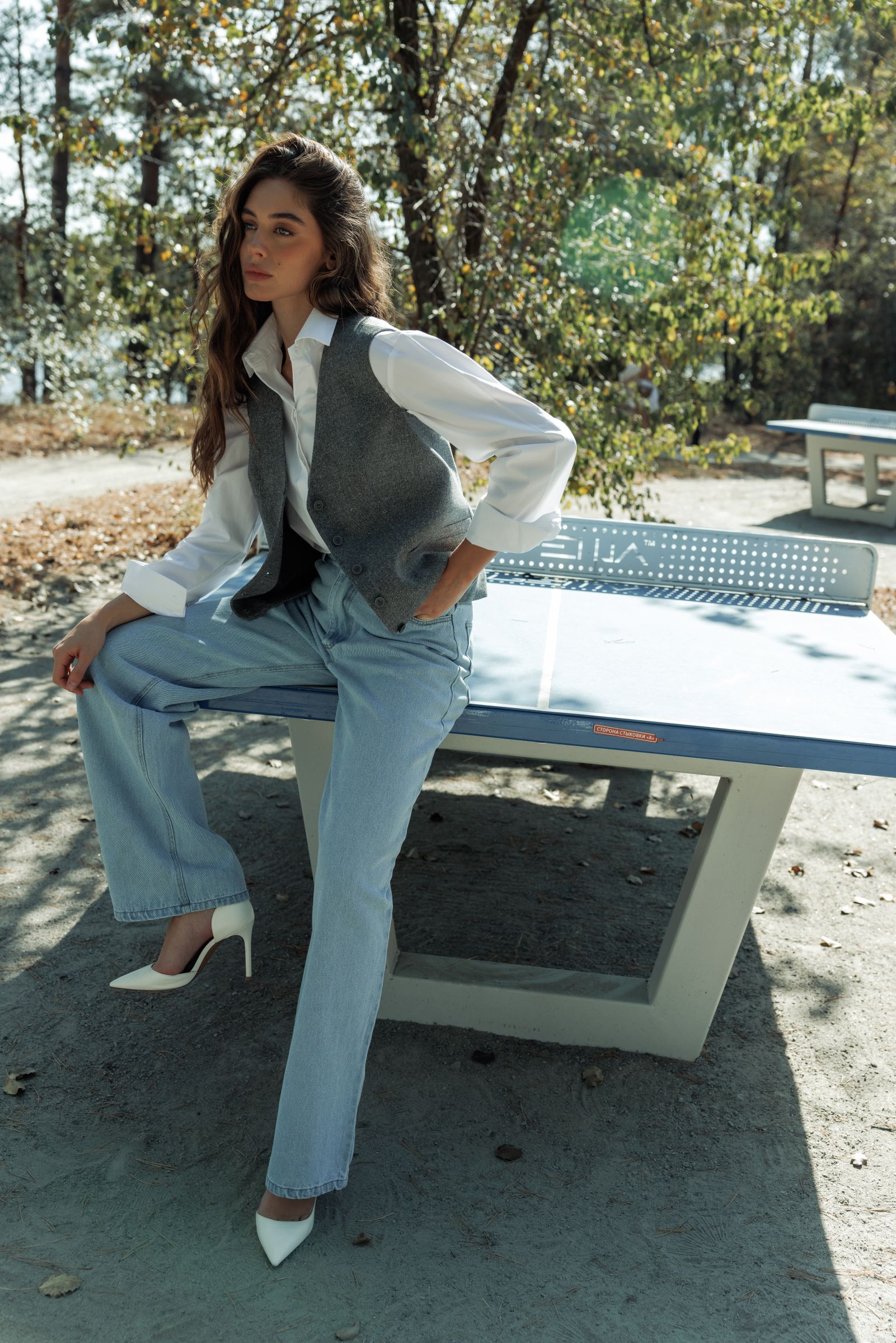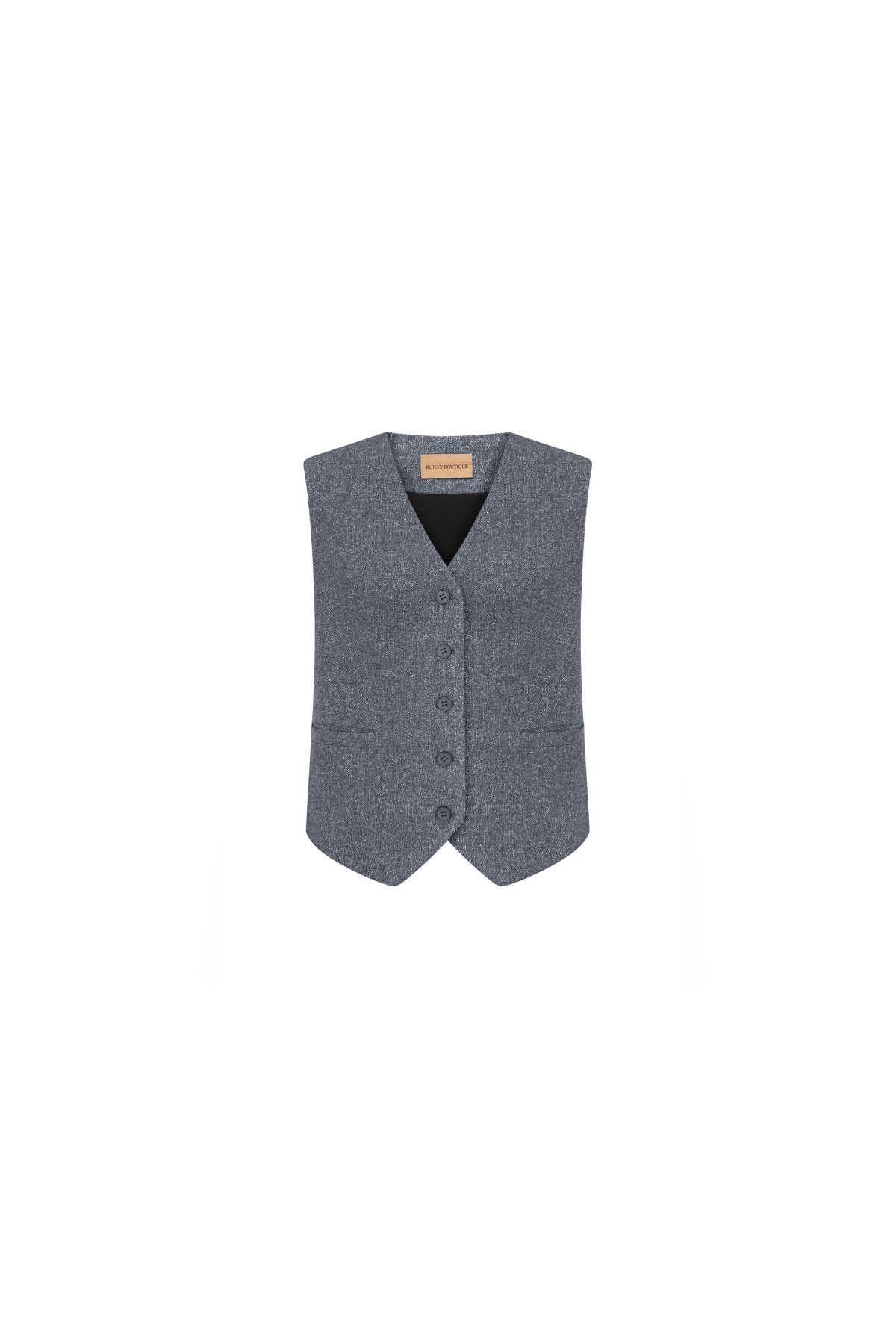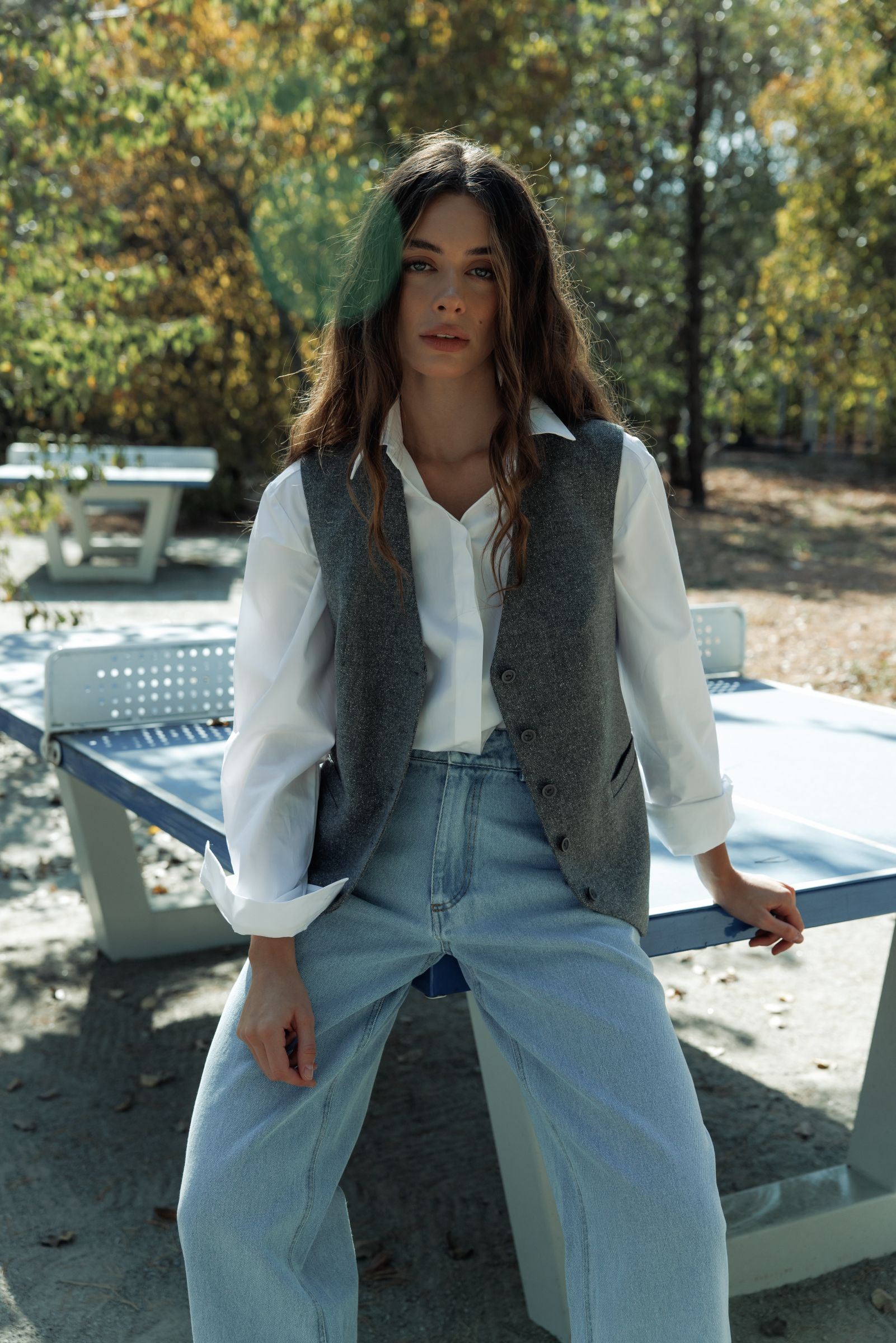 Ця стильна жилетка в сірому кольорі є ідеальним елементом для створення шаруватого образу. Виконана з високоякісного матеріалу, вона має класичний V-подібний виріз і мінімалістичний дизайн, що дозволяє легко поєднувати її з сорочками, блузами або светрами. Жилетка додає образу глибини та вишуканості, створюючи сучасний вигляд для офісу або міських прогулянок.