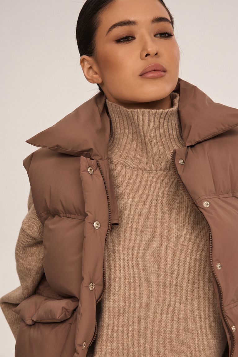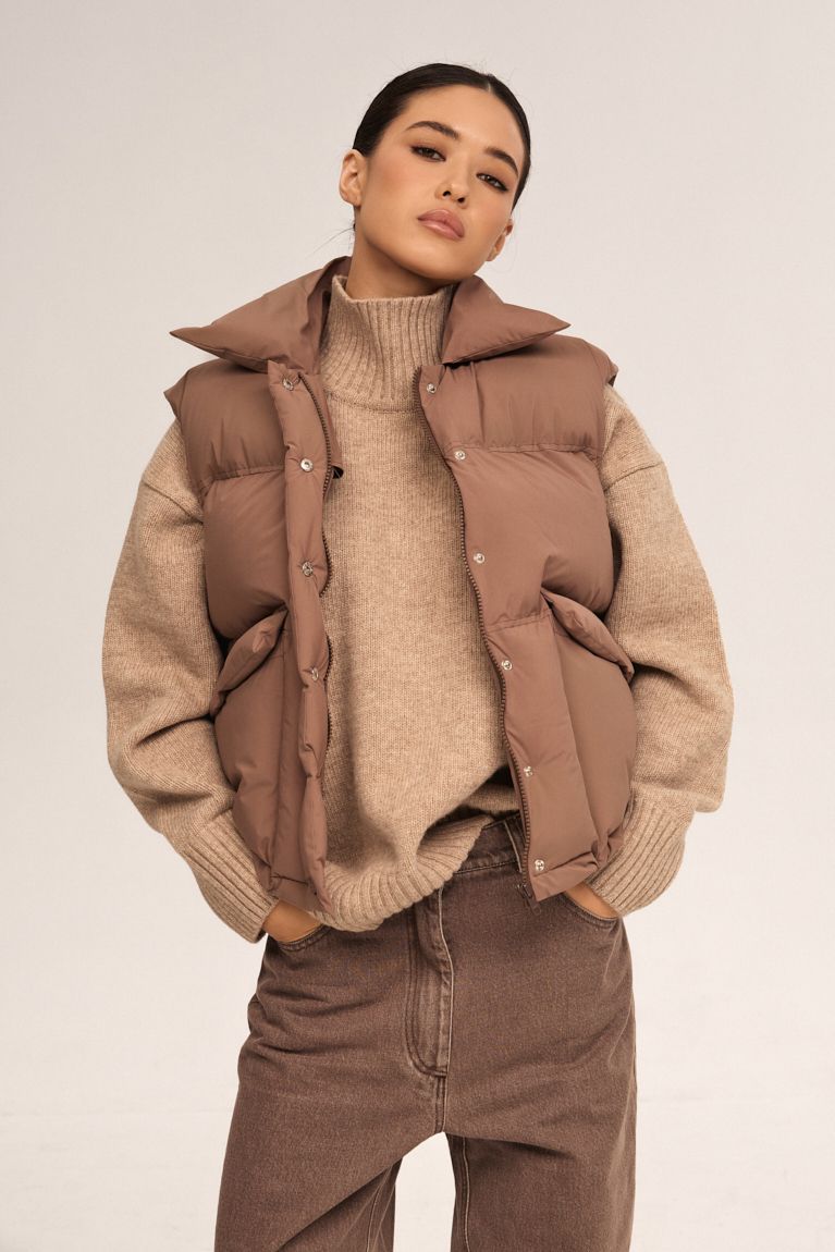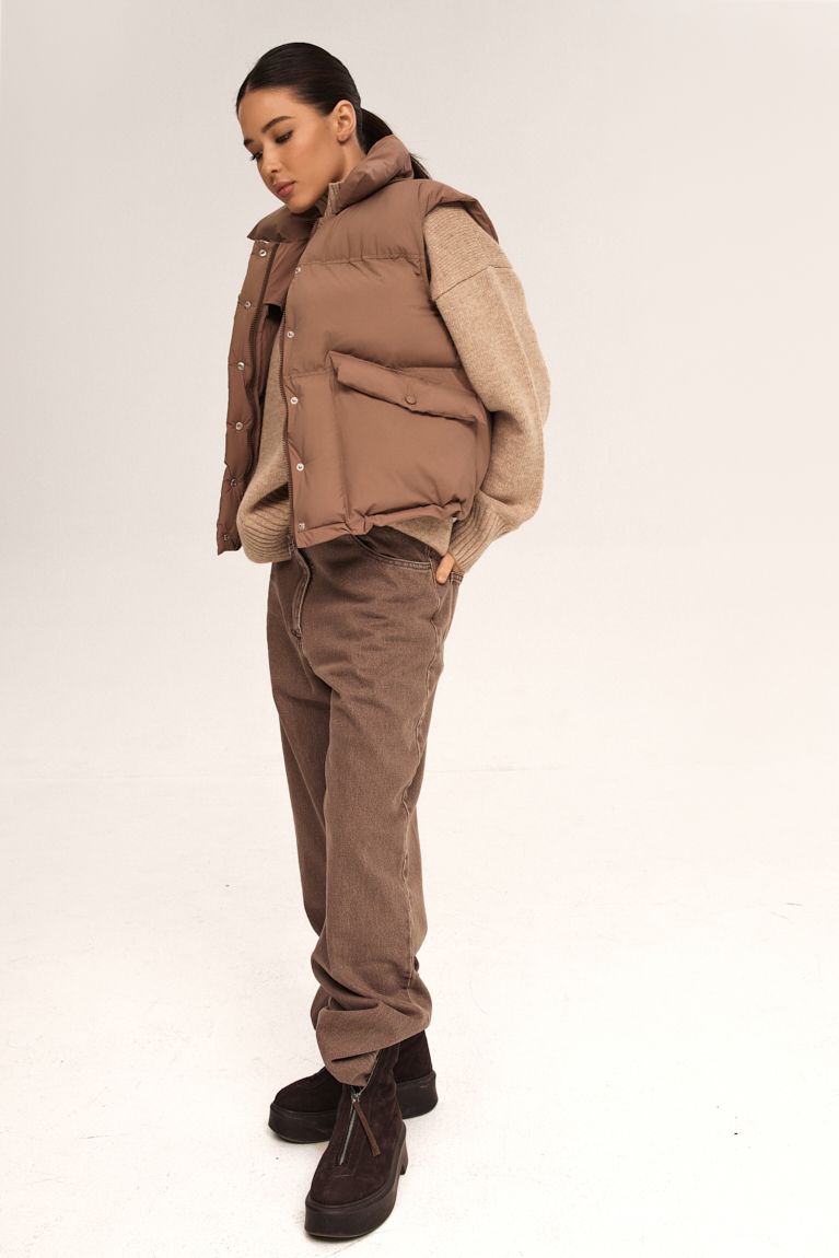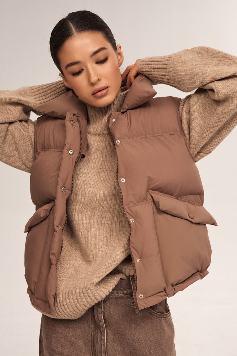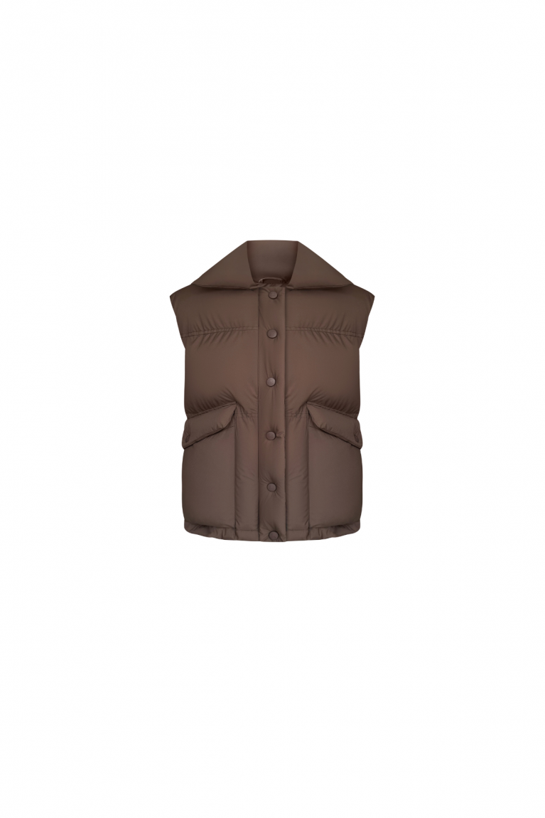 Стильна та функціональна пухова жилетка - ідеальний вибір для сезону. Модель має об’ємний силует і продуманий дизайн, що забезпечує максимальний комфорт та захист від прохолоди. Високий комір-стійка захищає від вітру та створює акуратний силует. Комір тримає форму, додаючи жилетці стильного вигляду. Застібка на кнопки в тон виробу підкреслюють цілісність дизайну та дозволяють швидко застібати і розстібати жилетку. Об’ємні накладні кишені з клапанами - функціональні та місткі. Низ жилетки м’яко прилягає до тіла, забезпечуючи кращу теплоізоляцію та більш охайний вигляд. Матеріал із легким матовим блиском.Ця пухова жилетка чудово підходить для прогулянок, подорожей або повсякденних міських образів. Її легко поєднувати зі світшотами, худі чи трикотажними лонгслівам — універсальний елемент гардеробу, який додає стилю і комфорту.