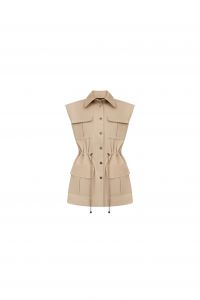 Стильний жилет у стилі сафарі - ідеальне поєднання елегантності та функціональності. Виконаний із щільної якісної тканини, він має чіткий силует і додає образу нотки впевненості та незалежності. Дизайн виробу вирізняється характерними деталями: класичним відкладним коміром, накладними кишенями з клапанами, які додають акцент на практичність, та металевими кнопками, що забезпечують зручність застібання. Особливу увагу привертає пояс на кулісці, який дозволяє регулювати посадку і підкреслює талію, створюючи жіночний, але водночас динамічний образ. А необроблений край пройм додає виробу легкого бунтарського характеру. Цей жилет стане ідеальним доповненням до будь-якого гардероба, чудово поєднуючись із шортами, спідницями та джинсами, створюючи стильні та гармонійні луки для міста або подорожей.