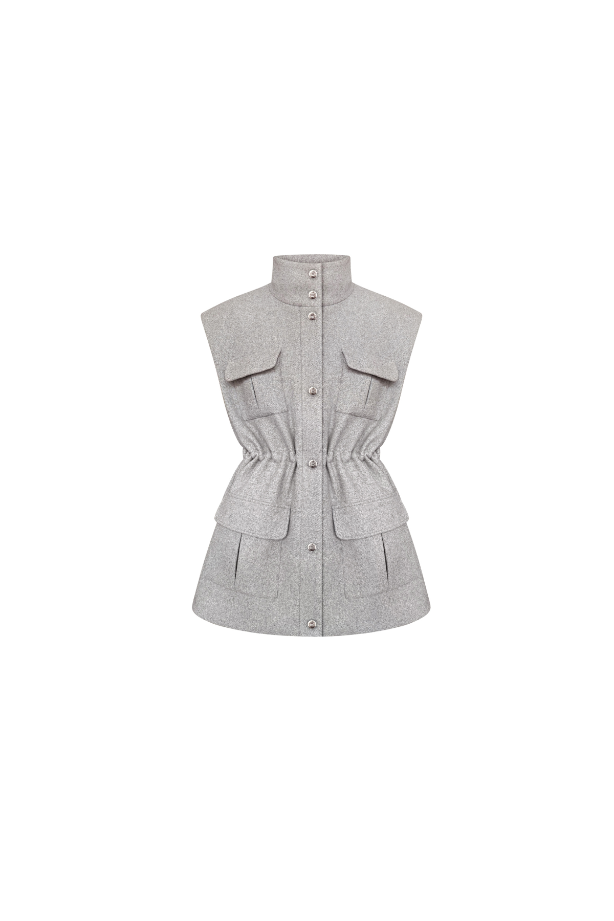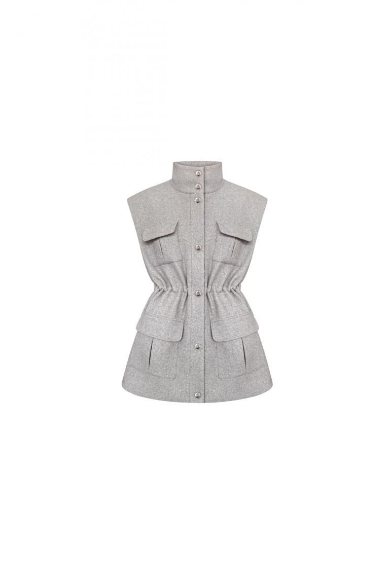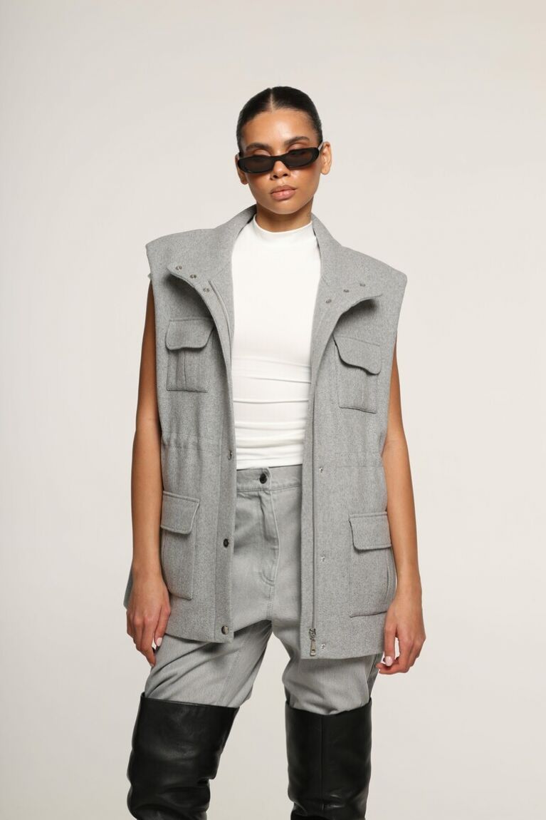 Стильний та функціональний сірий жилет - ідеальний вибір для тих, хто цінує мінімалізм із характером. Безрукавний дизайн дозволяє легко комбінувати жилет із базовими гольфами, сорочками чи світшотами, створюючи багатошарові образи. Фірмовий комір-стійка, що додає образу сучасності та строгості. Чотири накладні кишені з клапанами - стильний акцент та зручне місце для дрібних речей. Подвійна застібка: блискавка та кнопки для комфорту та надійності. Чисті лінії та ідеальний крій, що формують елегантний, продуманий образ Цей жилет - універсальний елемент гардеробу для сучасної жінки. Він легко вписується як у кежуал-луки, так і в більш стримані, стильні образи з акцентом на сучасну естетику та багатошаровість.Ідеальний вибір для міжсезоння та прохолодних днів.