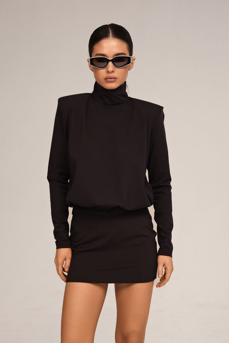 Костюм Shoulders створений для тих, хто цінує мінімалізм, вишуканість і бездоганний силует. Комплект складається з м’якої блузи з високою горловиною та лаконічної спідниці, що разом формують естетично збалансований вечірній образ. Висока стійка горловина додає образу святкової виразності та сучасного характеру. Класичний міні-крій підкреслює ноги та додає образу святкової сміливості. Щільна, еластична тканина гарно облягає фігуру й тримає форму. Цей костюм створений для новорічних вечірок, стильних зустрічей і особливих моментів, коли хочеться виглядати по-справжньому бездоганно. Лаконічний чорний колір робить образ універсальним та позачасовим, а продумані деталі — справді святковим.