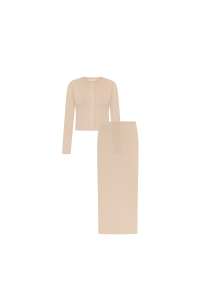 Цей трикотажний костюм поєднує комфорт і лаконічний стиль. Верх виконаний у вигляді приталеної кофти з довгими рукавами та акуратною лінією ґудзиків, що додають виробу стриманої елегантності. Спідниця має рівний силует та ідеальну довжину, яка підкреслює фігуру й забезпечує комфорт під час руху. Щільна трикотажна фактура тримає форму та виглядає преміально, роблячи костюм універсальним вибором для щоденних образів і офісних виходів.