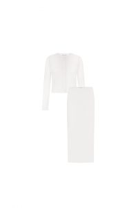 Цей трикотажний костюм поєднує комфорт і лаконічний стиль. Верх виконаний у вигляді приталеної кофти з довгими рукавами та акуратною лінією ґудзиків, що додають виробу стриманої елегантності. Спідниця має рівний силует та ідеальну довжину, яка підкреслює фігуру й забезпечує комфорт під час руху. Щільна трикотажна фактура тримає форму та виглядає преміально, роблячи костюм універсальним вибором для щоденних образів і офісних виходів.