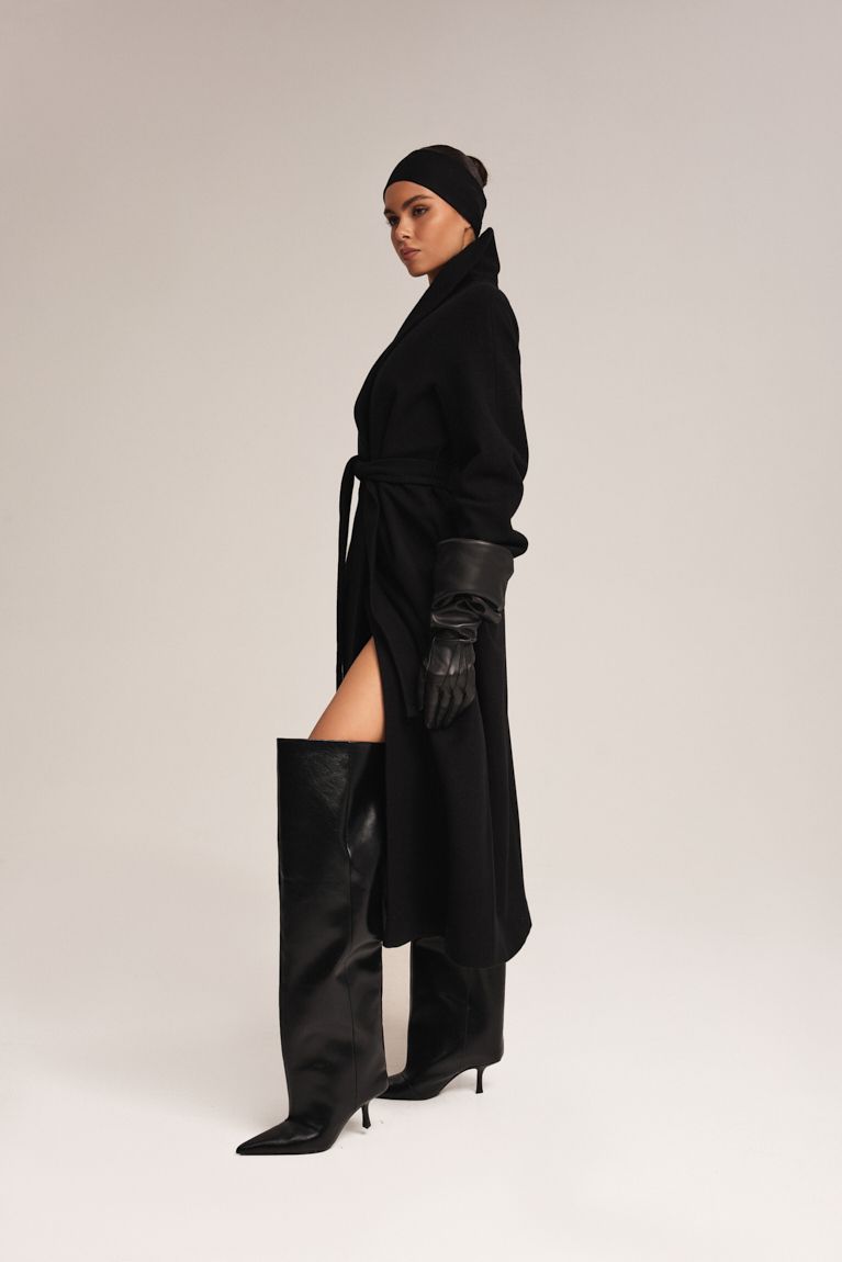 Пальто Premium в чорному кольорі поєднує стриману розкіш і продуманий мінімалізм. Силует прямий, з легким акцентом на талії завдяки м’якому поясу, який дозволяє регулювати посадку та створювати різні образи - від розслабленого до більш структурованого. Глибокий виріз додає вишуканості та підкреслює багатошаровість аутфіту. Пальто виконане з щільної, високоякісної вовни, яка добре тримає форму й забезпечує комфорт у прохолодну погоду. Мінімалістичний комір-шаль, що додає м’якості образу. Невидимі кишені, що зберігають чистоту фасону. Пальто - універсальна річ, яка легко доповнює вечірні, ділові та повсякденні образи, роблячи кожен з них виразним та стильним. Ідеальний вибір для тих, хто цінує сучасну елегантність і майстерно виконані деталі.