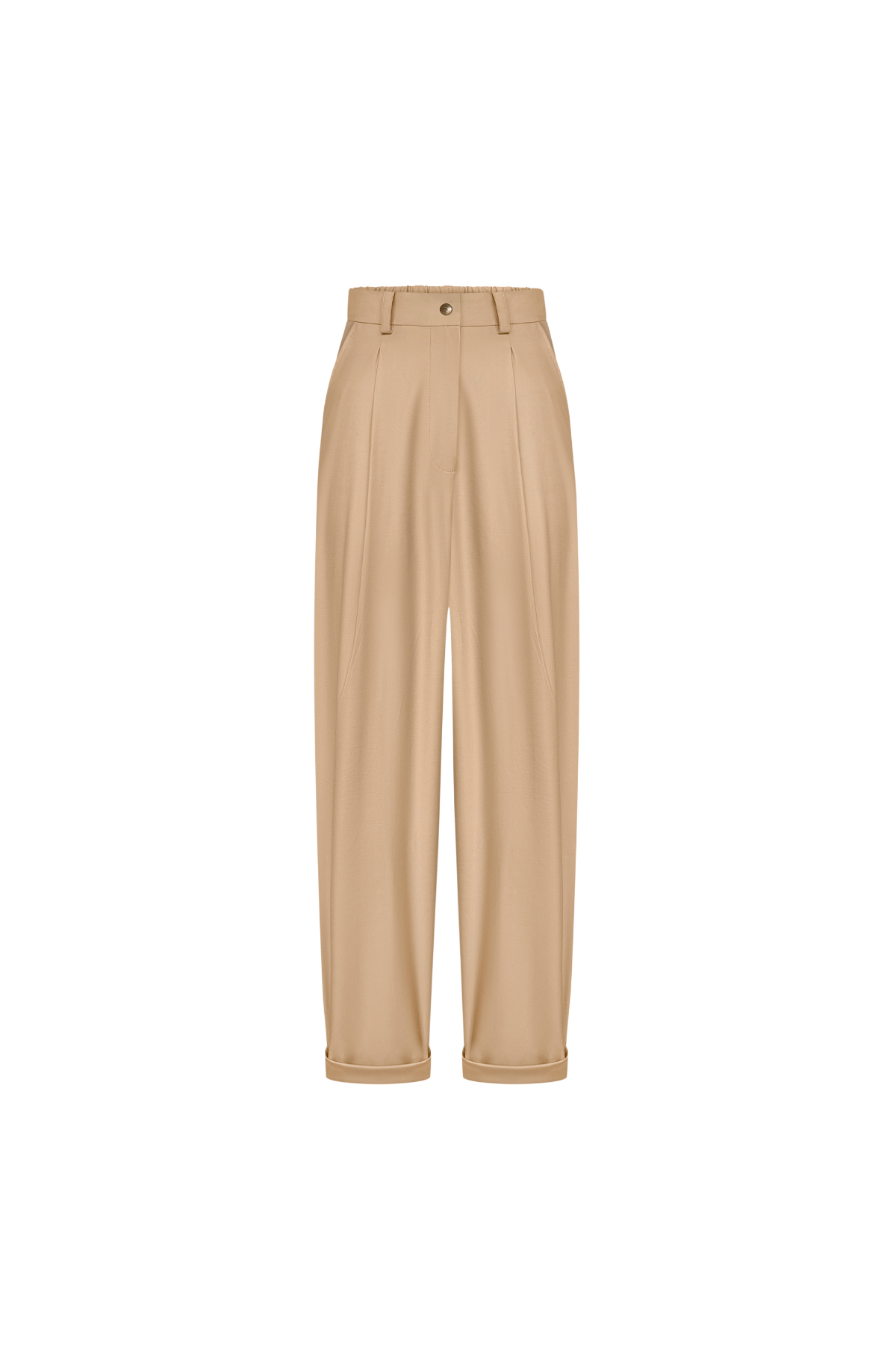 Базові та водночас стильні штани, виконані з високоякісного котону, який забезпечує комфорт і дихаючі властивості тканини. Модель представлена у класичному бежевому кольорі, що легко поєднується з будь-яким гардеробом. Деталі крою роблять ці штани універсальними як для повсякденних, так і для більш елегантних образів: Еластичний пояс ззаду для зручності та ідеальної посадки. Спереду – застібка на гудзик і блискавку. Фігурні защипи спереду додають штанам елегантності. Пояс зі шльовками дає можливість доповнити образ улюбленим ременем.Практичні кишені спереду та декоративні – ззаду. Низ із підворотом створює сучасний та акуратний вигляд. Ці штани – ідеальний вибір для тих, хто цінує баланс між комфортом і стилем. Їх легко комбінувати з футболками, сорочками чи жакетами.