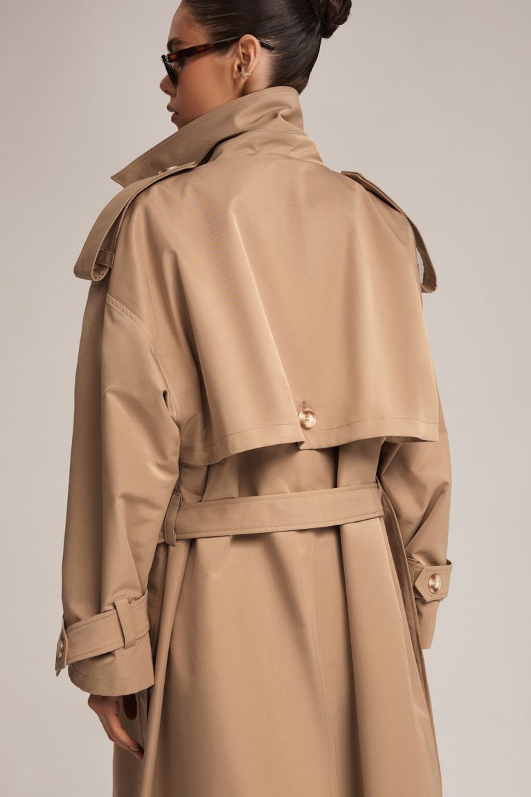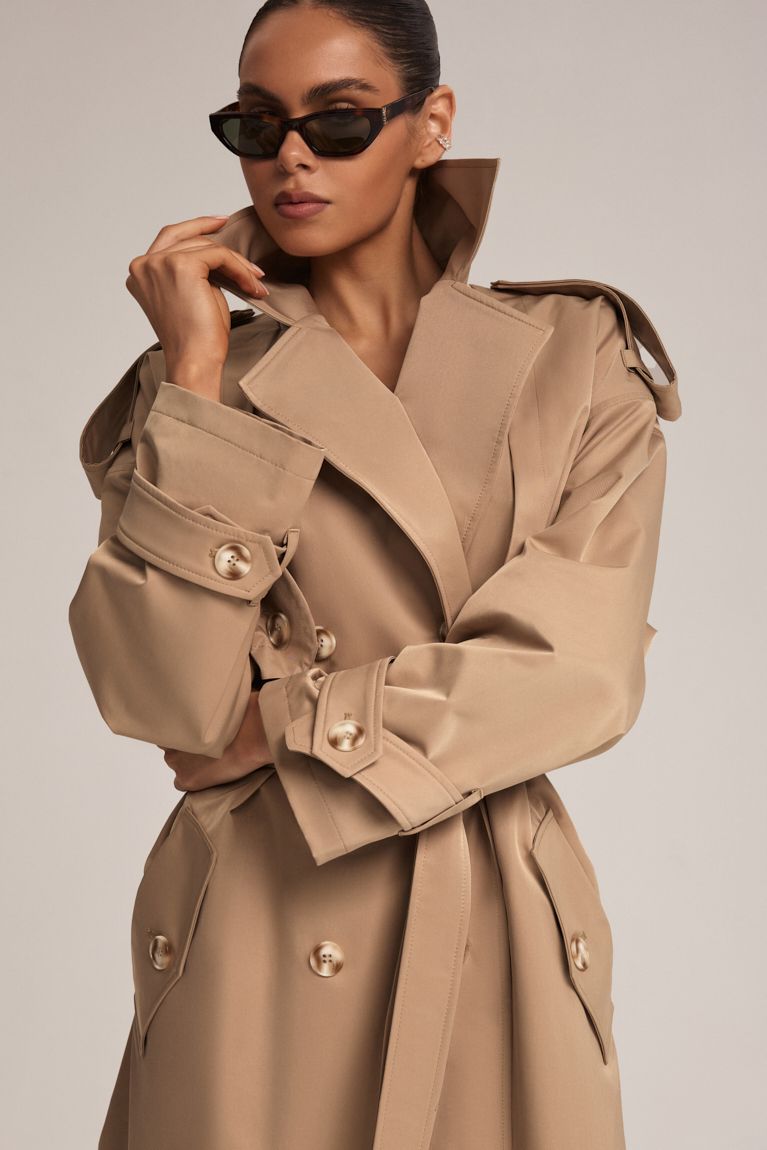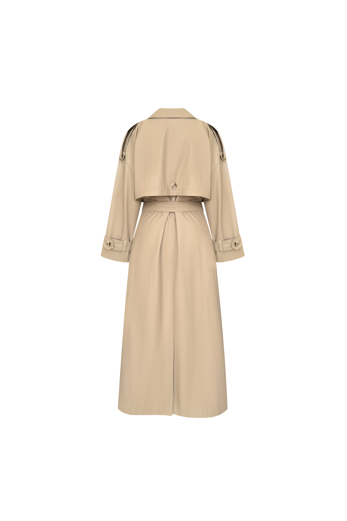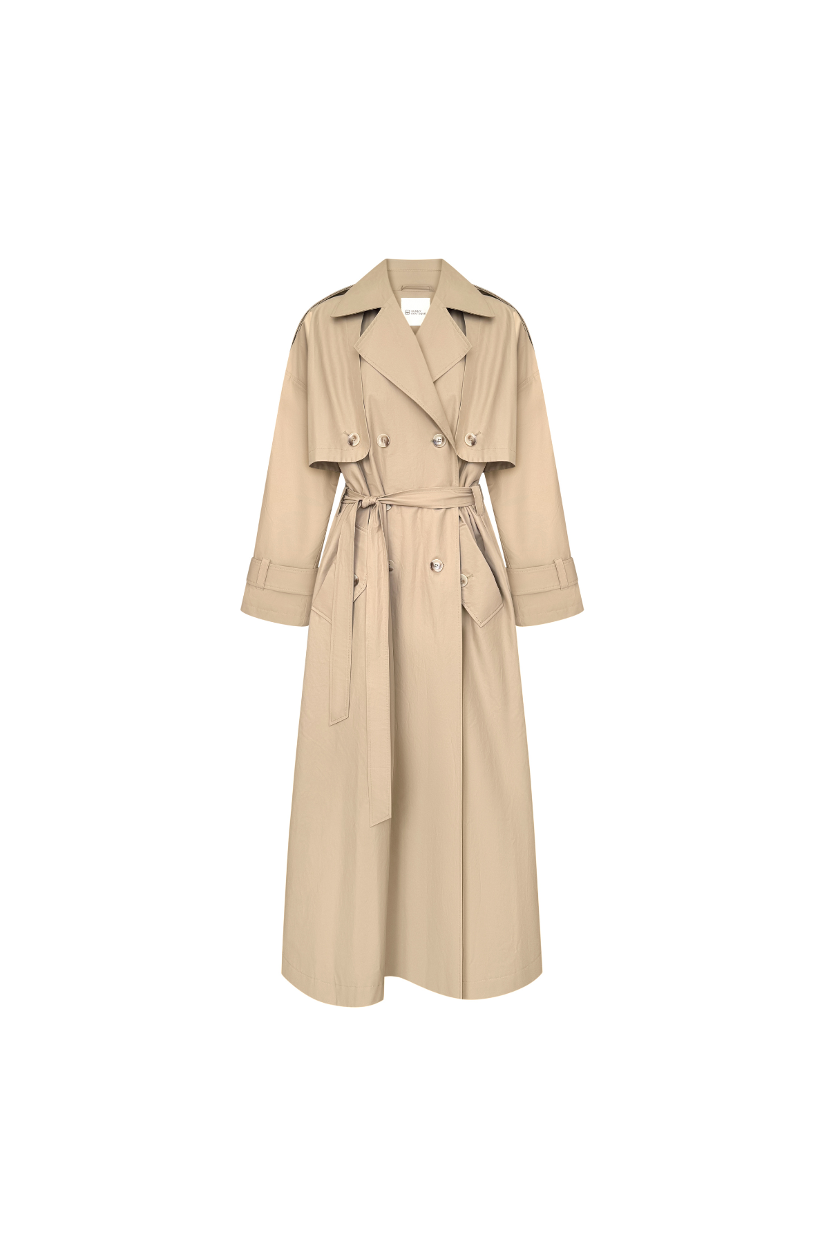 Цей тренч - символ елегантності та витонченого стилю. Він виконаний у подовженому силуеті, що надає образу стриманості й водночас підкреслює жіночність. Подвійний ряд ґудзиків додає виразності та створює класичний акцент. Пояс на талії дозволяє регулювати посадку та формує витончену силуетну лінію. Погони на плечах та манжети з пряжками на рукавах підкреслюють традиційну естетику тренчу. Клапан на грудях і спинці не лише зберігає автентичність крою, а й додає легкості рухам. Виріб має глибокі кишені з клапанами, що поєднують практичність і стиль. Цей тренч - ідеальне доповнення до базового гардероба, яке пасуватиме як до ділових луків, так і до повсякденних образів. Його вишукана простота та увага до деталей роблять його must-have сезону.