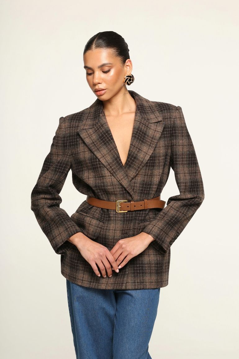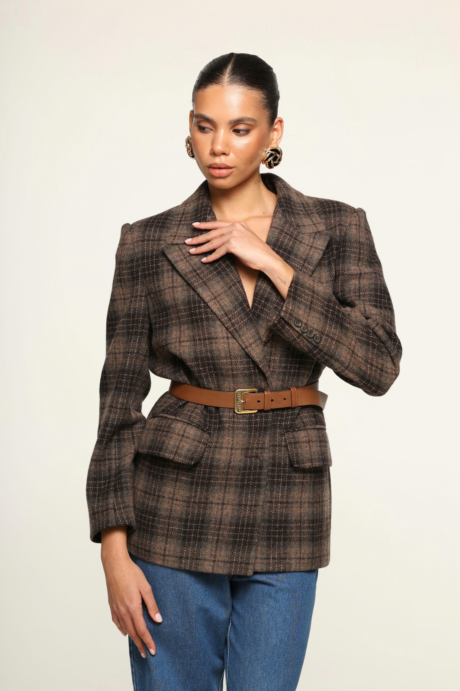 Елегантний вовняний жакет, створений для тих, хто цінує вишукану класику та довговічність натуральних матеріалів. Виготовлений зі 100% високоякісної вовни, він має виразну м’яку текстуру та характерний теплий відтінок у картатому візерунку, що додає образу глибини та шарму. Продуманий крій акцентує силует: широкі лацкани створюють сильну лінію плечей, а пояс із натуральної шкіри підкреслює талію, формуючи витончену та структуровану посадку. Дві накладні кишені з клапанами додають практичності та вишуканості, а ретельно продумана довжина робить жакет універсальним — він чудово поєднується як із класичними брюками, так і з джинсами. Цей жакет — інвестиція в гардероб, що поєднує тепло, елегантність і бездоганний стиль. Ідеальний вибір для осінньо-зимового сезону та образів, де важливі деталі говорять самі за себе.