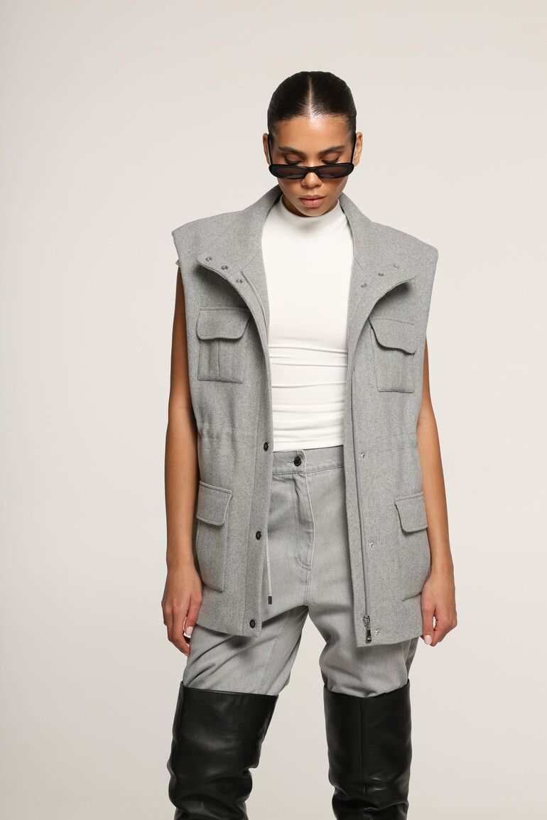 Стильний та функціональний сірий жилет - ідеальний вибір для тих, хто цінує мінімалізм із характером. Безрукавний дизайн дозволяє легко комбінувати жилет із базовими гольфами, сорочками чи світшотами, створюючи багатошарові образи. Фірмовий комір-стійка, що додає образу сучасності та строгості. Чотири накладні кишені з клапанами - стильний акцент та зручне місце для дрібних речей. Подвійна застібка: блискавка та кнопки для комфорту та надійності. Чисті лінії та ідеальний крій, що формують елегантний, продуманий образ Цей жилет - універсальний елемент гардеробу для сучасної жінки. Він легко вписується як у кежуал-луки, так і в більш стримані, стильні образи з акцентом на сучасну естетику та багатошаровість.Ідеальний вибір для міжсезоння та прохолодних днів.